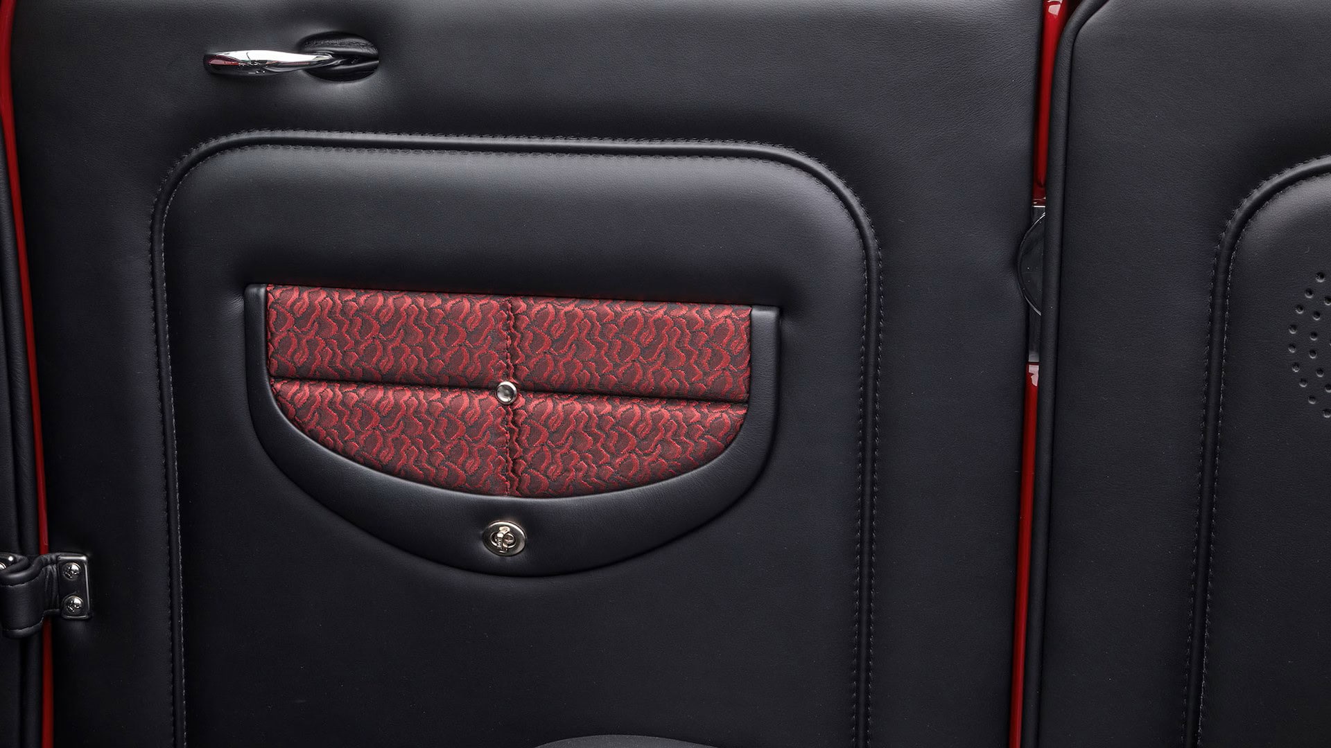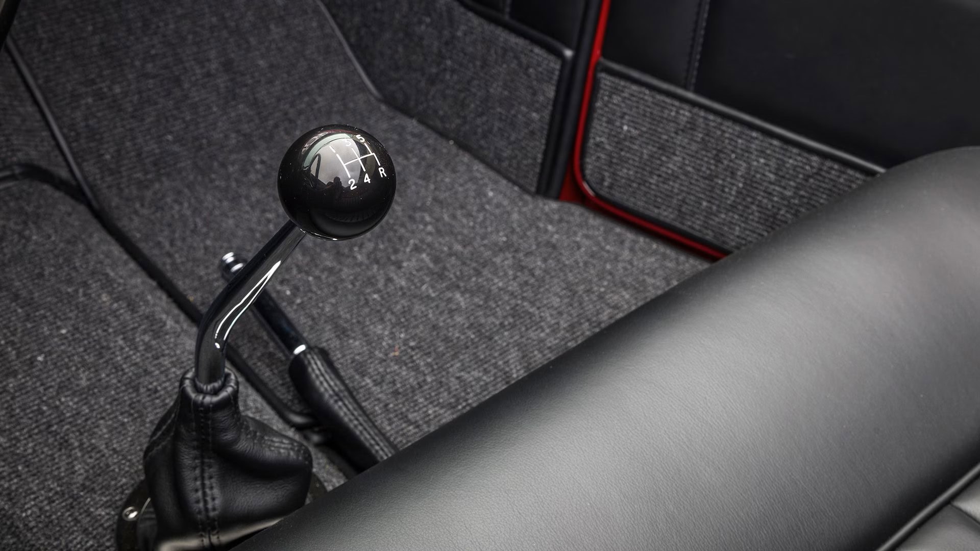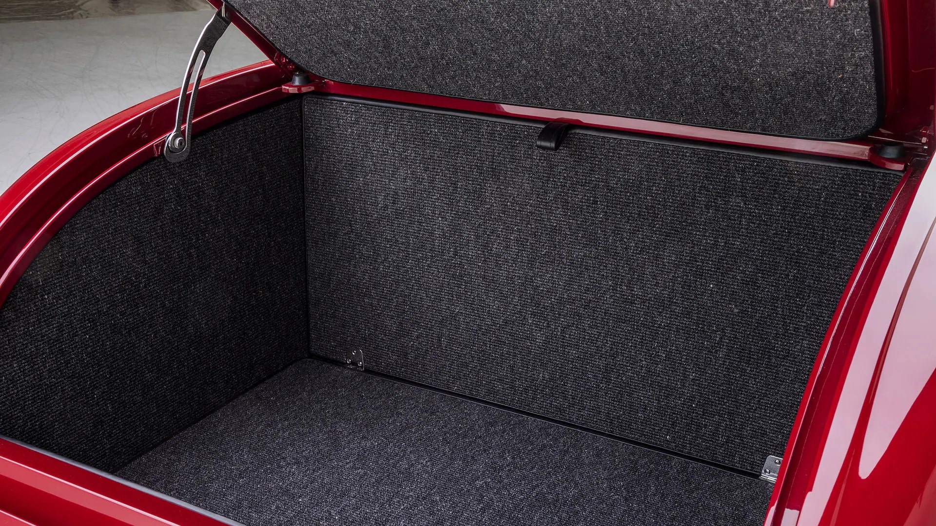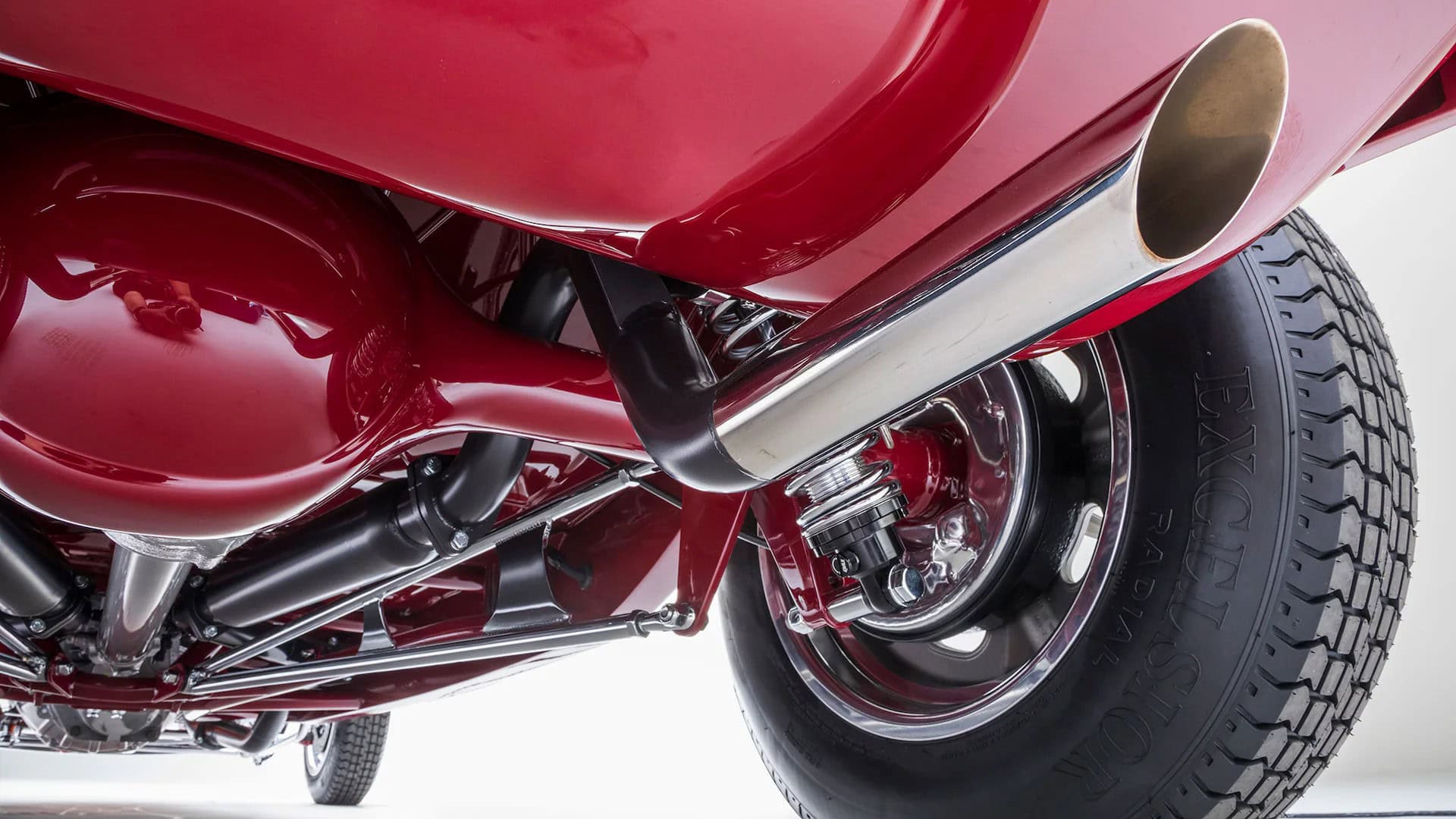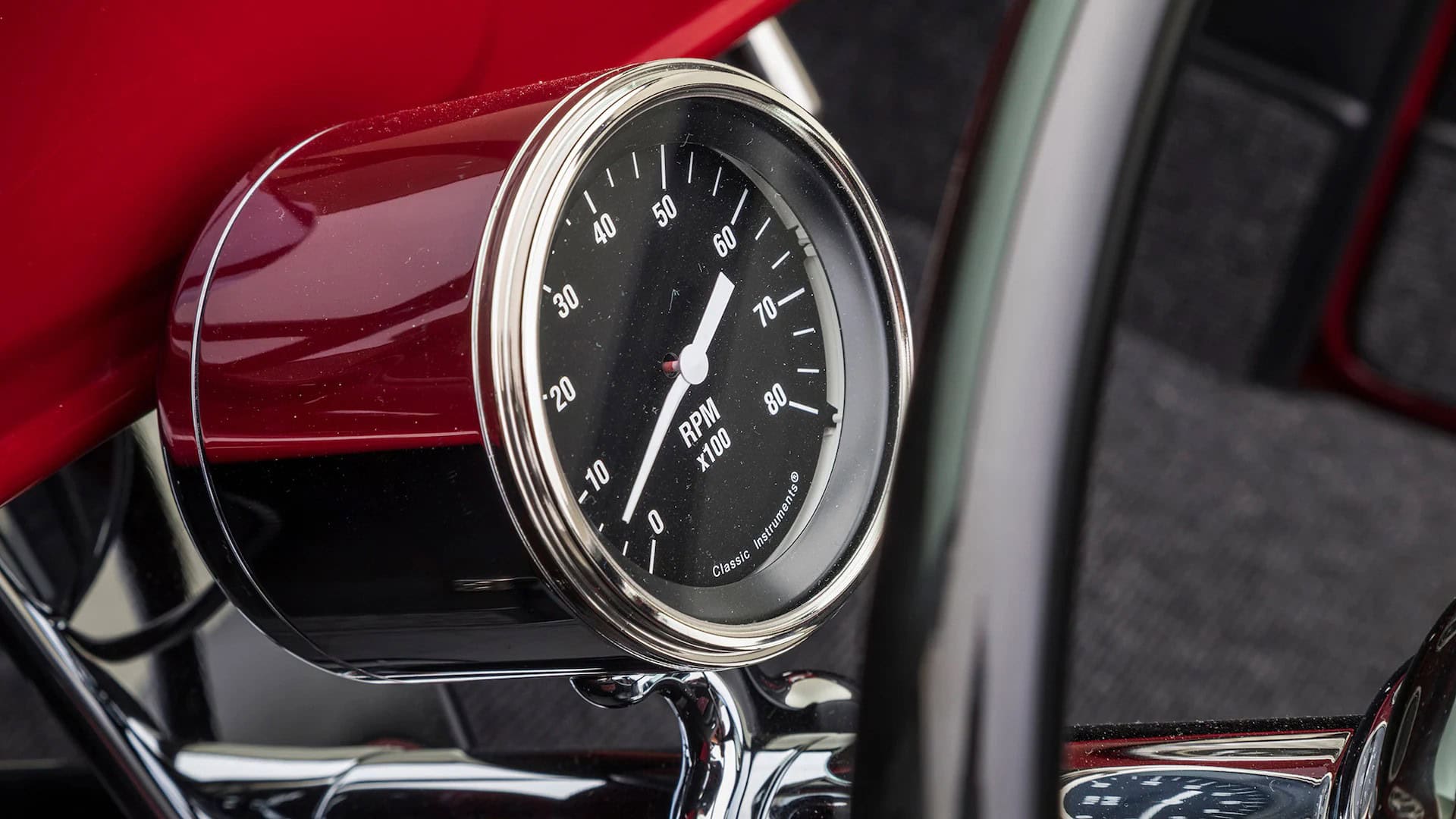 Les panneaux de pont en acier au-dessus et en dessous du couvercle du coffre ont été soudés pour éliminer les coutures/soudures, une touche subtile qui, comme toutes les autres, contribue à l’impression “impressionnante” (sic !) de l’extérieur. La préparation de la carrosserie et la peinture ont été confiées à Darryl Hollenbeck de Vintage Color Studio et la peinture Jaguar Regency Red qui en résulte est la touche presque finale à l’extérieur, car si vous vous approchez, vous verrez les bandes noires et rouges ultra-fines qui courent sur toute la longueur de la carrosserie, appliquées par Real Ralph Newman. Sherm’s Plating s’étant assuré que chaque centimètre de chrome brille. Pour en revenir au style des années ’60, le choix des pneus et des jantes Big’n’ Littles est cohérent avec le style des années’60. Les jantes 16×5.5 et 18×7 E-T Indy de l’équipe III proviennent d’un premier lot limité de jantes en billette’s.
