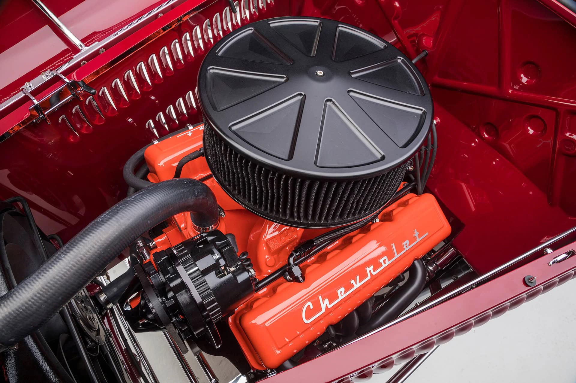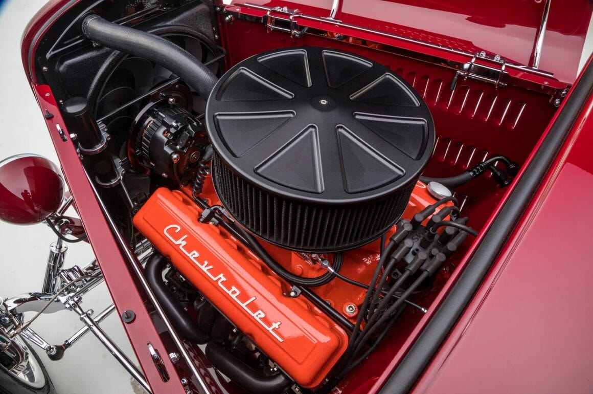 Les pneus minces (5.00-16 et 7.00-18) Excelsior de Coker ressemblent à ce qu’ils étaient sortis des premiers jours, mais ont l’avantage d’une construction radiale. Dans les années ’60, les Chevrolet small bloc étaient devenus les moteurs de prédilection des Street Rodders. Le moteur Don Hardy Performance Engines 383ci à carburateur Holley avec culasses en aluminium Fast Burn dans le roadster de Joe est une variante moderne de cela, surtout lorsqu’il porte de la peinture orange et qu’il est habillé de caches-soupapes Chevy et d’un filtre à air Don Hardy. L’allumage est assuré par MSD via des fils Taylor. Un radiateur Walker, un ventilateur de composants de refroidissement et une pompe à eau Edelbrock maintiennent la température du moteur basse. Les tuyaux personnalisés recouverts de céramique transportent l’échappement des collecteurs Sanderson avec des silencieux Stainless Specialties.