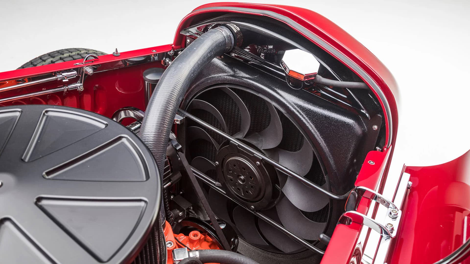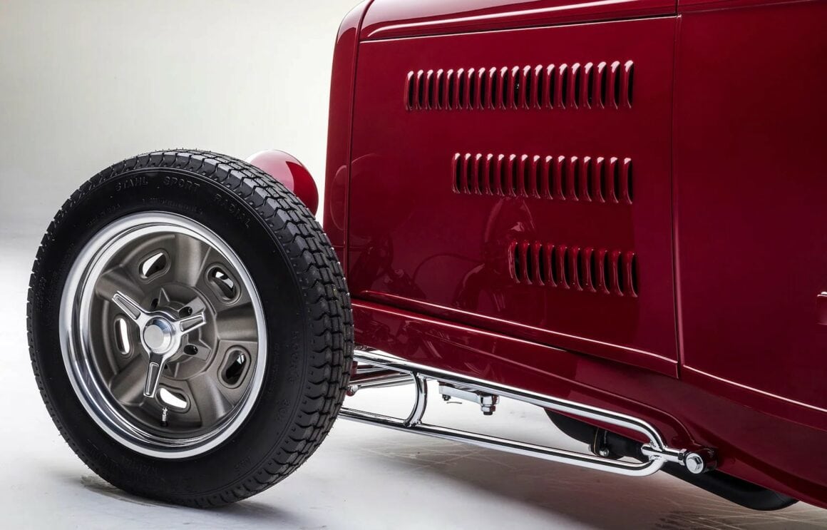 Roy Brizio a laissé sa marque en combinant le style d’antan et les standards du nouveau temps. Ce roadster est un excellent exemple de la façon dont cette combinaison fonctionne et des pièces utilisées pour l’accomplir. Le châssis est un bon point de départ. Les rails de châssis ressemblent à ceux construits par Henry Ford, mais ceux-ci ont été étirés de 2 pouces au-delà de la longueur d’origine et ont été entièrement caissonnés pour plus de solidité. Les composants de la suspension avant des années ’60 sont des pièces disponibles aujourd’hui : un essieu Super Bell à poutre en I abaissé de 4 pouces, des axes et des tiges de rayons en épingle à cheveux, des ressorts à lames transversaux de chez Posies et des amortisseurs tubulaires de QA1. L’arrière de 9 pouces de Currie Enterprises avec glissement limité en 3,89:1 est situé par les barres d’échelle de Pete & Jake pour une apparence traditionnelle.