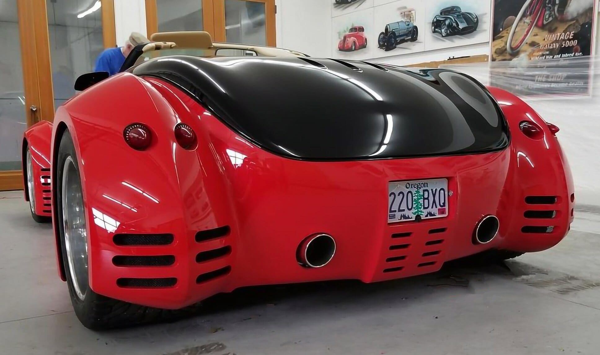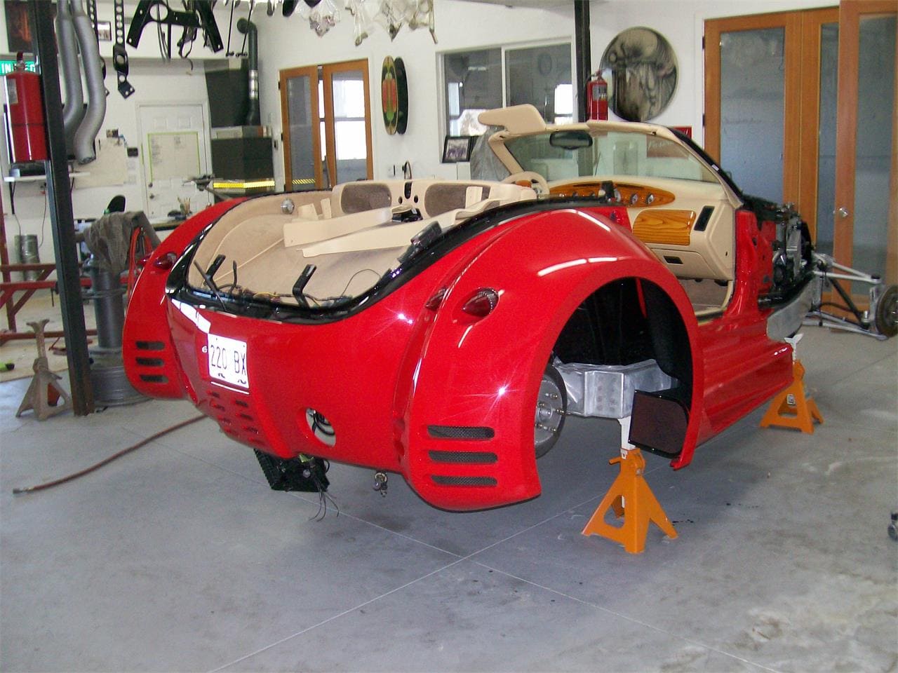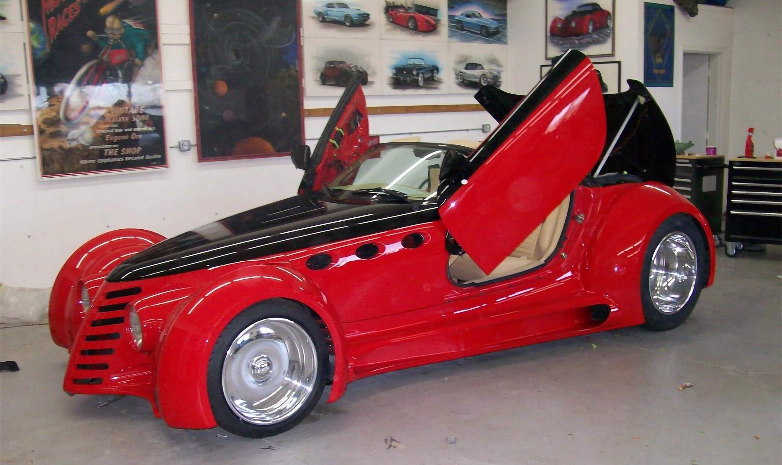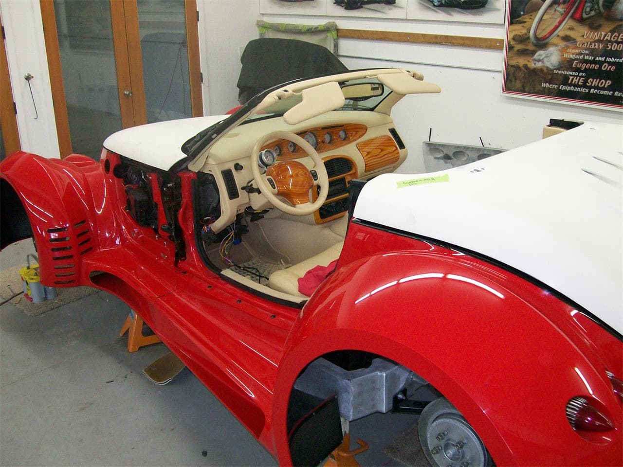 Intérieur en peau de veau beige, capote noire, toit rigide Hard-Top personnalisé intérieurement avec scène de galaxie étoilée luminescente. Nouveau système stéréo + CD. Tableau de bord en bois. Portes façon Lamborghini Countach. Ailes resculptées façon Art-déco. Jantes Smoothies avec pneus AR 20×18″. Du bel ouvrage assez spécial et décalé…