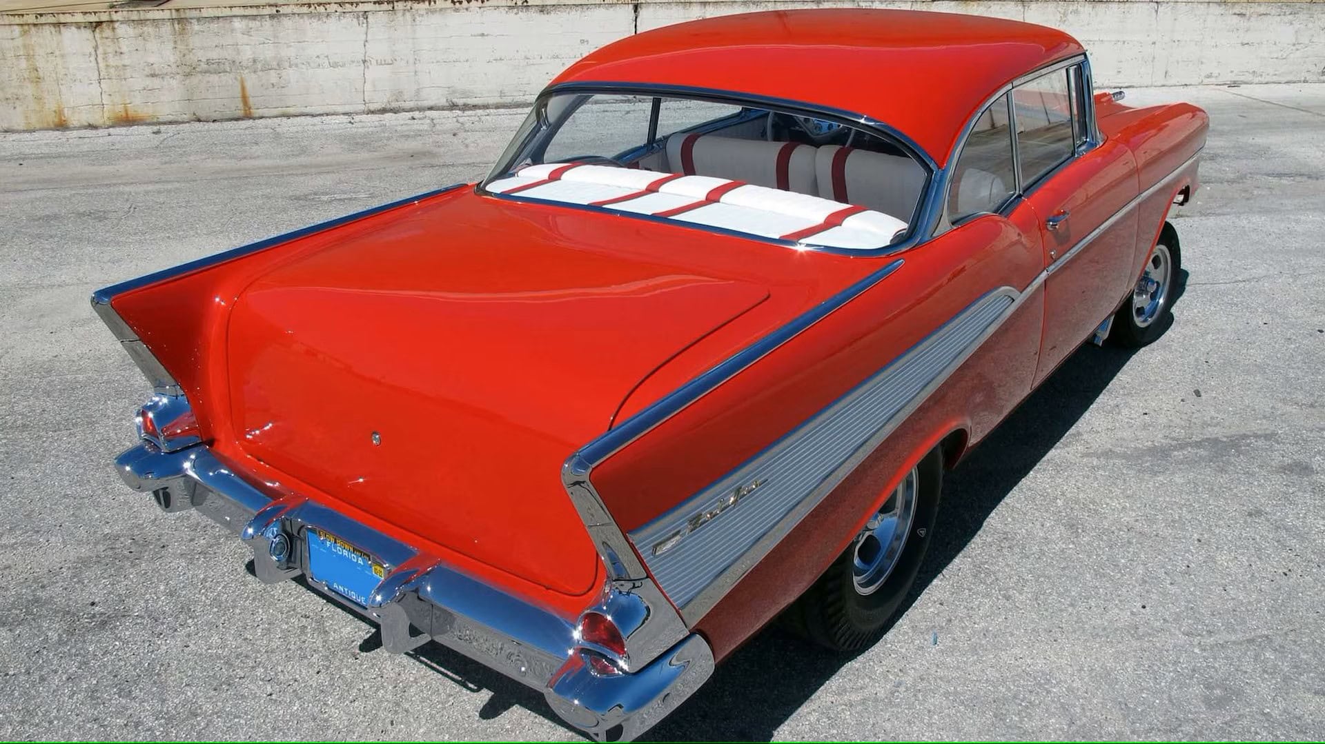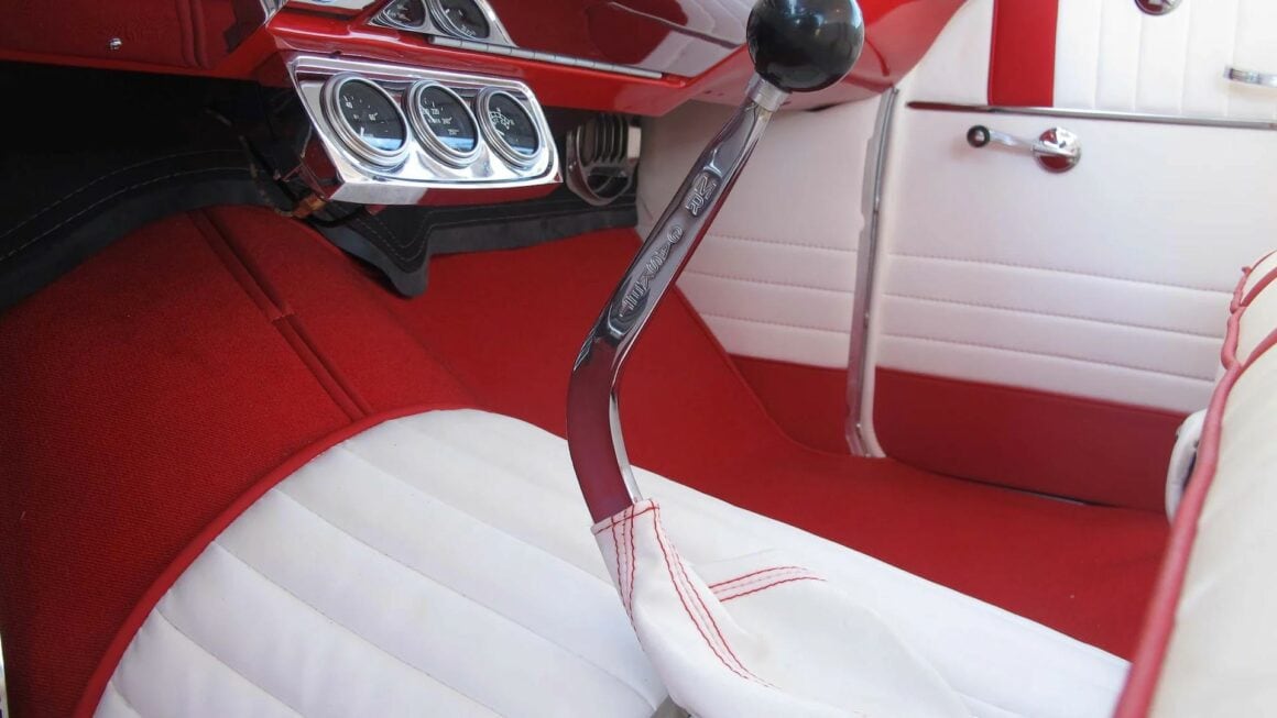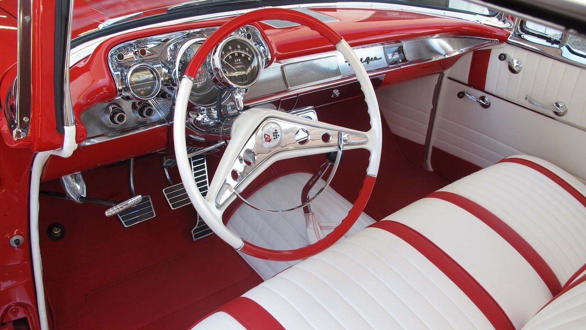 L’Intérieur est en similicuir plissé blanc et rouge avec moquette Daytona rouge assortie par Ciadella Enterprises en Arizona. Les garnitures latérales sont en acier inoxydable. Le pare-chocs arrière est d’une wagonner Nomad avec de nouvelles extrémités. Jantes en aluminium de 15 x 3po AV et 15 x 7 AR.