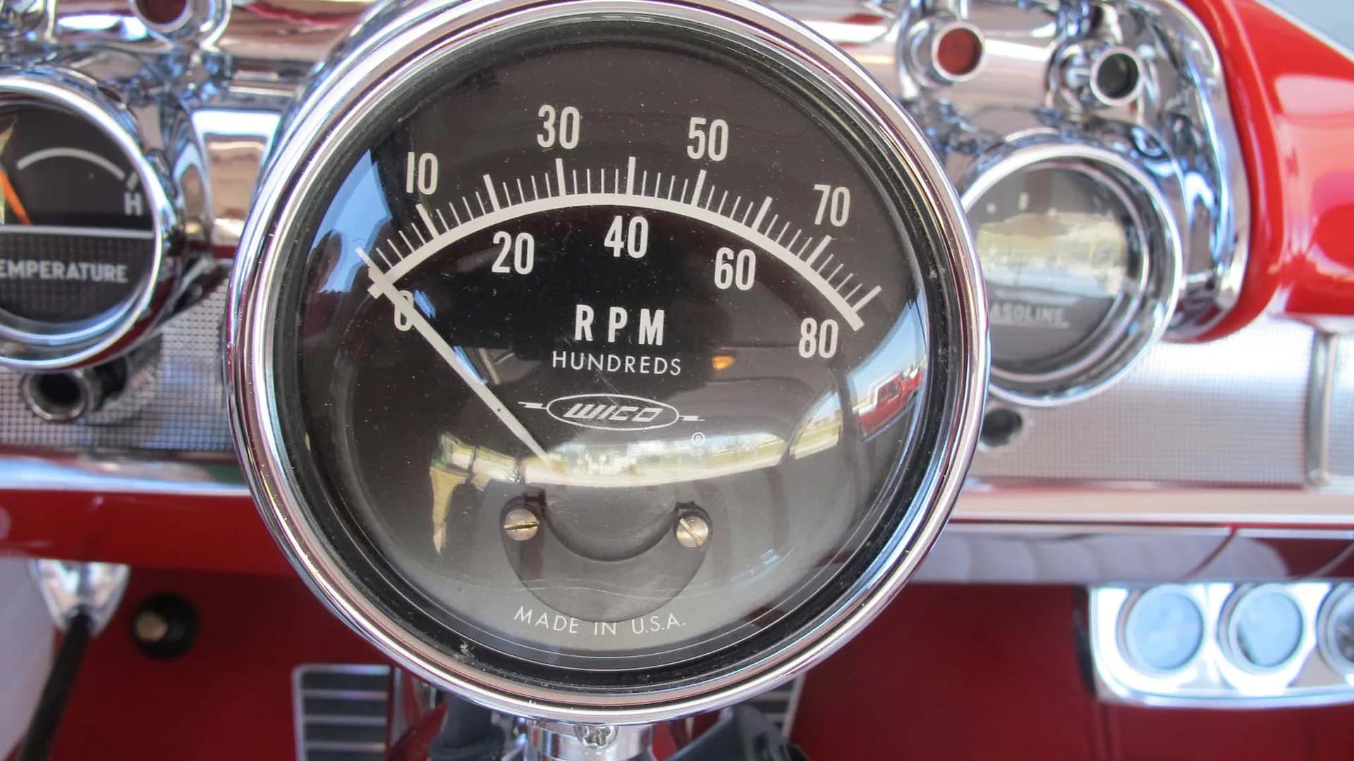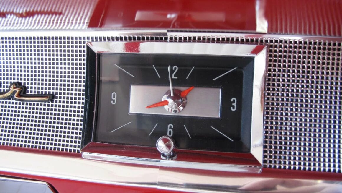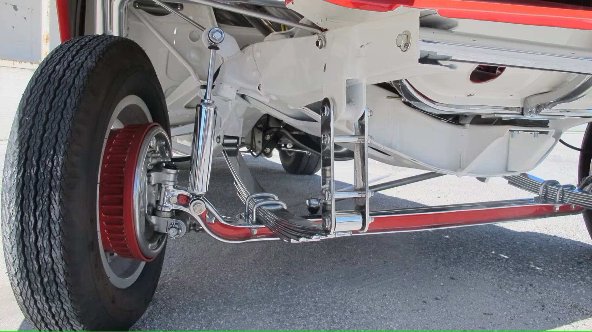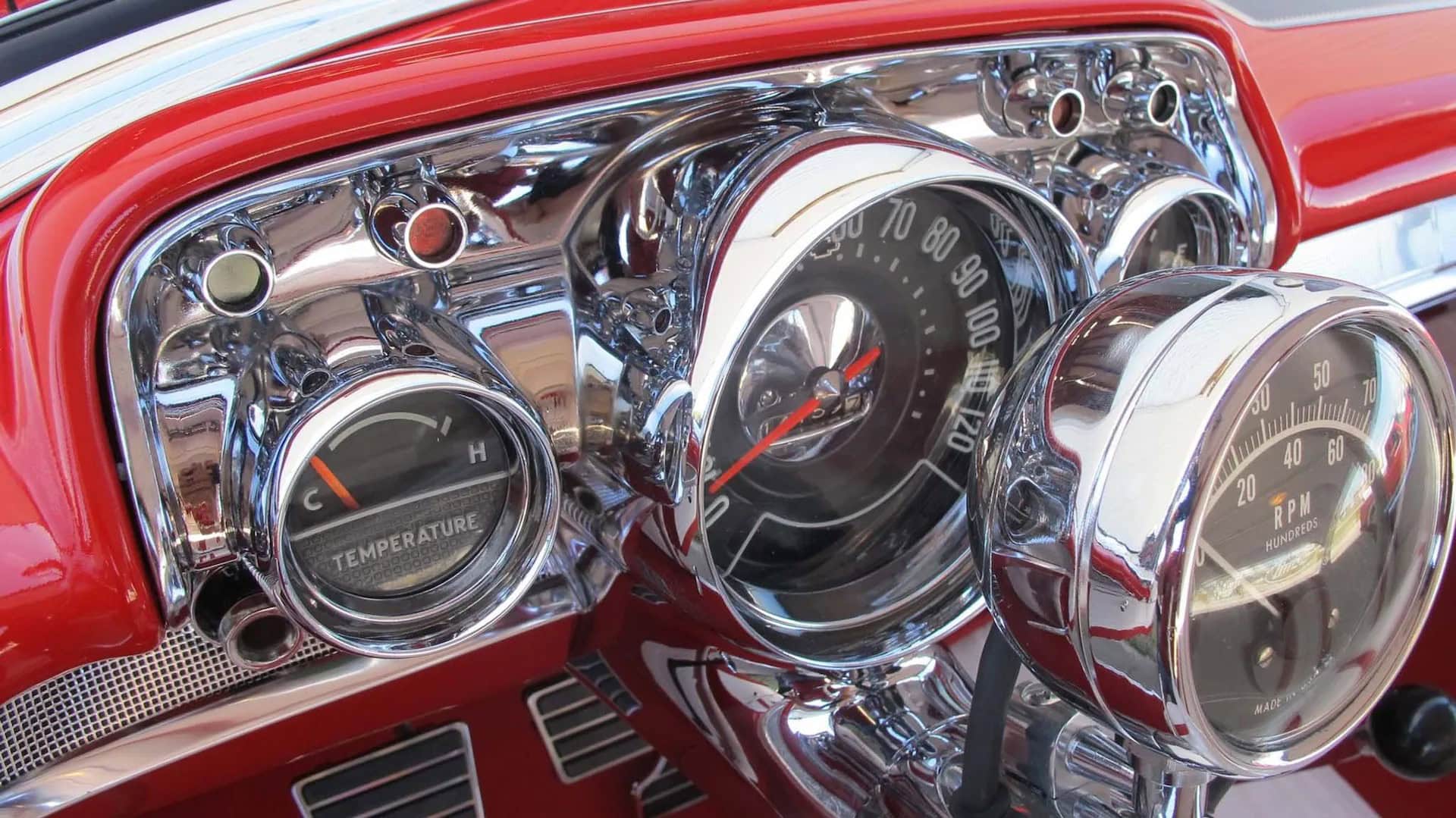 L’Intérieur est en similicuir plissé blanc et rouge avec moquette Daytona rouge assortie par Ciadella Enterprises en Arizona. Les garnitures latérales sont en acier inoxydable. Le pare-chocs arrière est d’une wagonner Nomad avec de nouvelles extrémités. Jantes en aluminium de 15 x 3po AV et 15 x 7 AR.