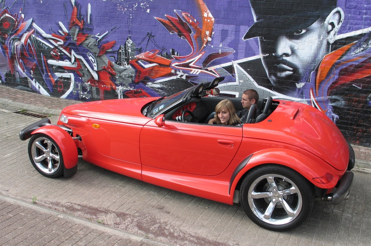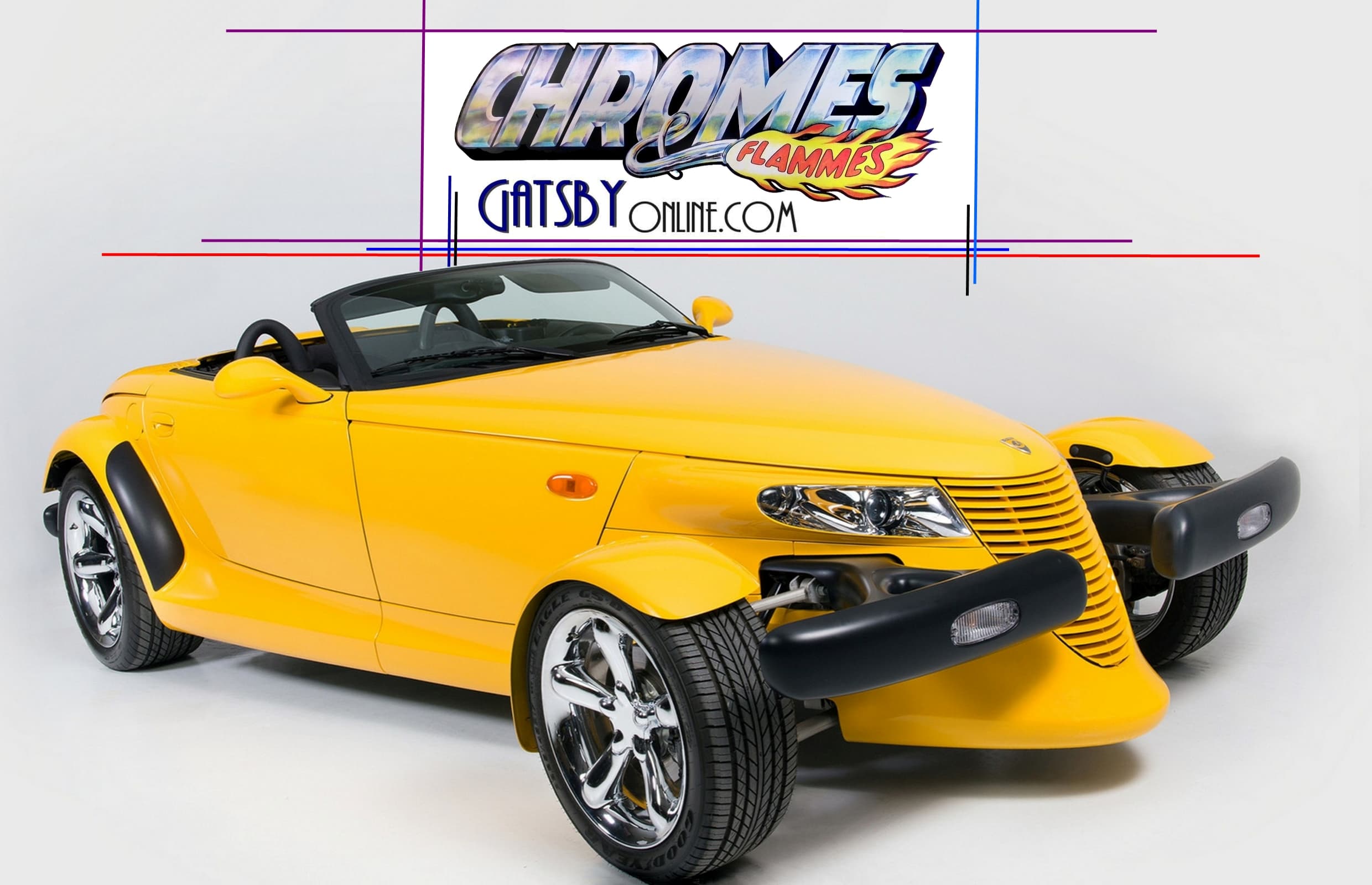 Les premiers Prowlers étaient disponibles en une seule couleur : Prowler Purple. Les premiers modèles de production comportaient un groupe motopropulseur de la série LH de Chrysler, un moteur V6 Chrysler SOHC de 3,5 litres à 24 soupapes produisant 214 chevaux. Pour 1999, ce moteur a fait place une version plus puissante : bloc aluminium et 253 chevaux couplés à une transmission Autostick à quatre vitesses. Une fois les voitures disponibles, la relation avec Chrysler Corporation et Gale a porté ses fruits. J’ai reçu un Prowler comme véhicule promotionnel. Et ce n’était pas tout. Un an plus tard, on a donné un autre Prowler à Top-Wheels version américaine de Chromes&Flammes/Gatsby. Vérifiez cela, nous avons en fait co-organisé un concours de design permettant aux lecteurs d’esquisser leurs propres concepts de conception de schéma de peinture. Le design gagnant a utilisé des flammes orange futuristes.