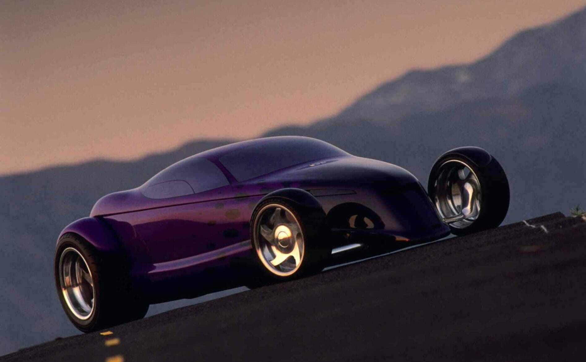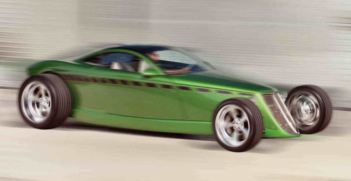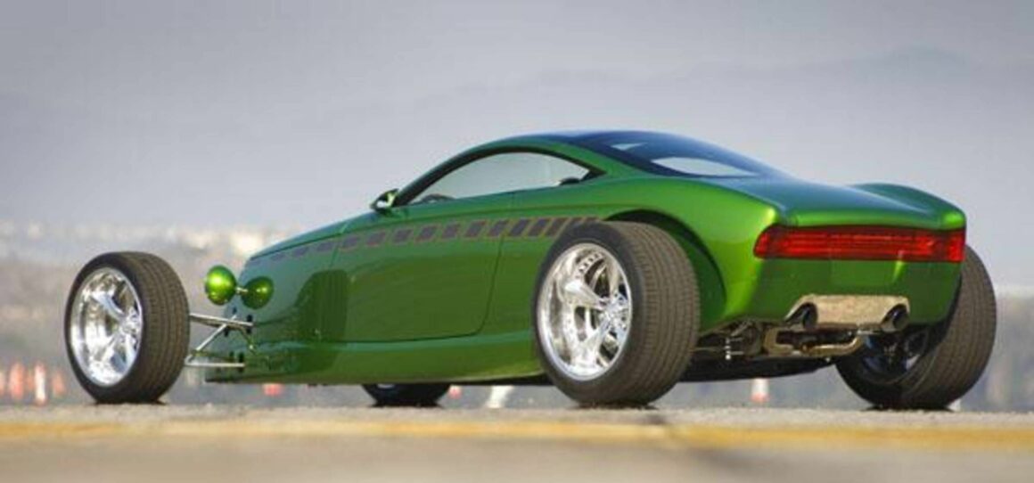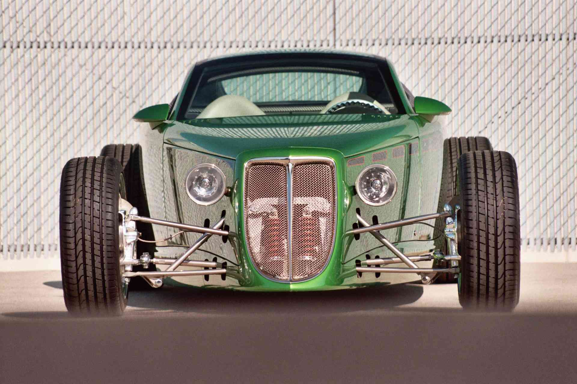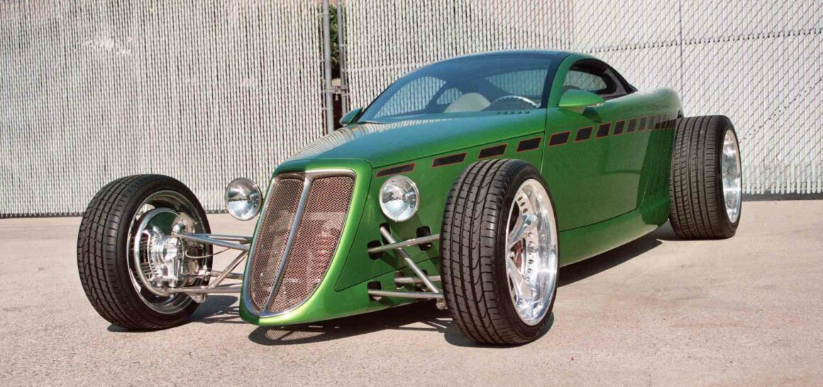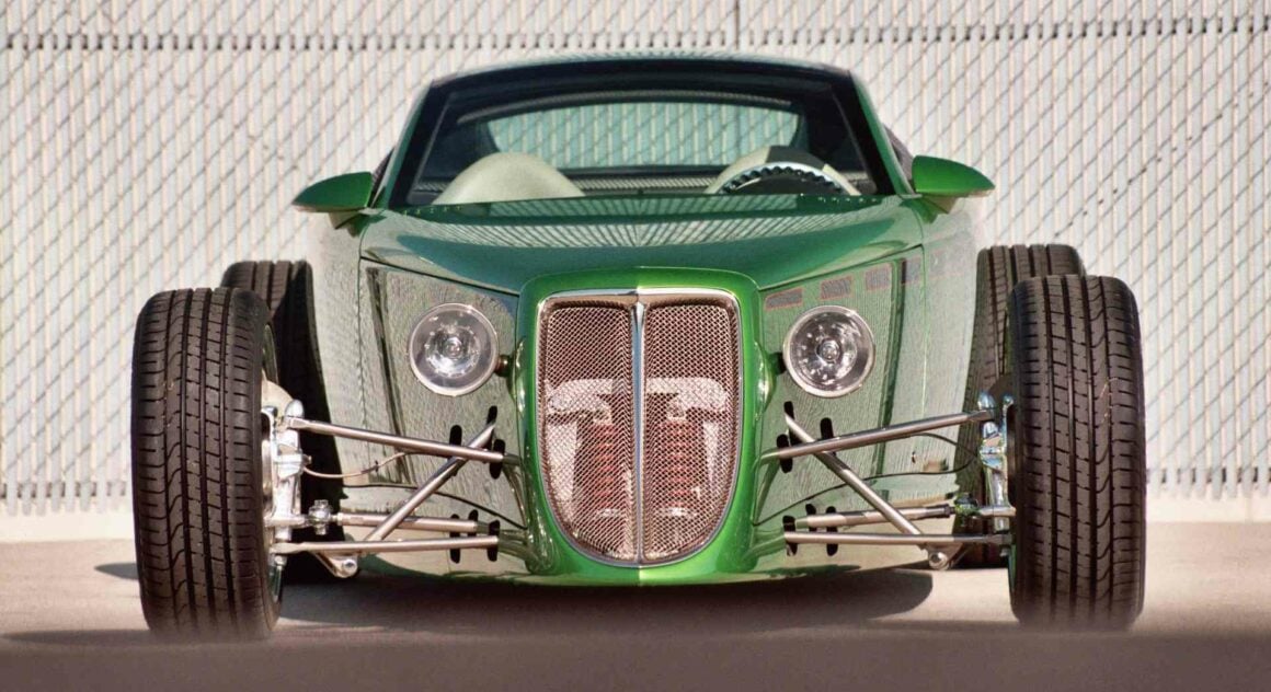 À mon avis, cependant, la Viper GTS, qui a fait ses débuts en 1996, était la Supercar américaine ultime avec les lignes de carrosserie les plus sexy de son époque. Mais l’histoire importante ici aujourd’hui concernant le Hot-Rod Hemisfear de Chips Foose, concerne les liens entre Goodguys, Tom Gale et le Plymouth Prowler, un concept-car marié au Hot-Rodding dans tous les aspects. Gale a été influencé par plusieurs sources dans les étapes de formation du Prowler, y compris Chip Foose. Alors qu’il fréquentait l’Art-Center College of Design à Pasadena, Foose a modélisé deux Hot-Rods futuristes en forme de Plymouth Prowler coin un coupé et un roadster, comme projet de thèse. Le concept de Foose était le projet qui avait contribué à engendrer les premiers concepts du Plymouth Prowler. Reprenant le concept de Foose, Gale l’a affiné avec toutes les cloches et sifflets nécessaires (phares, feux arrière, etc.) !