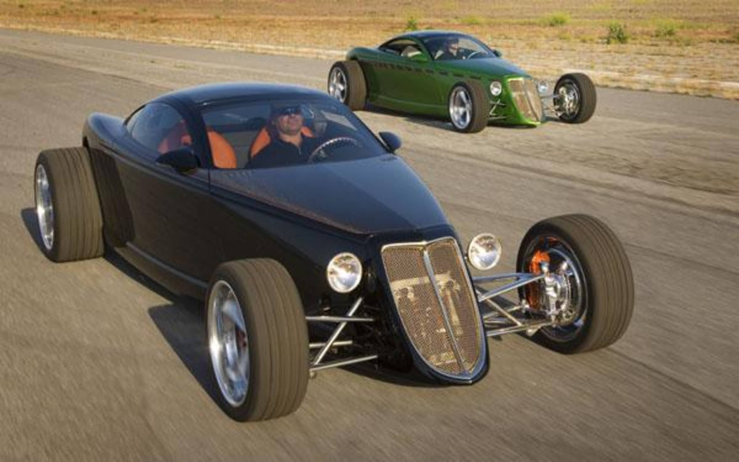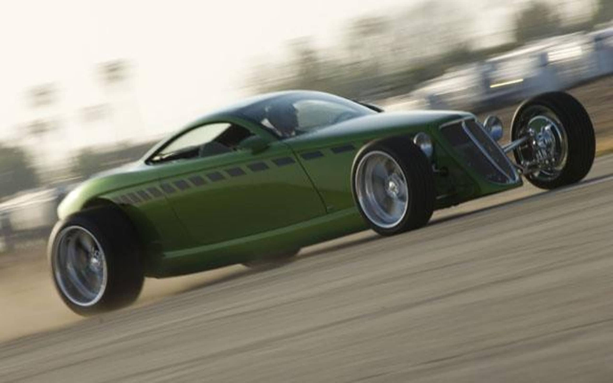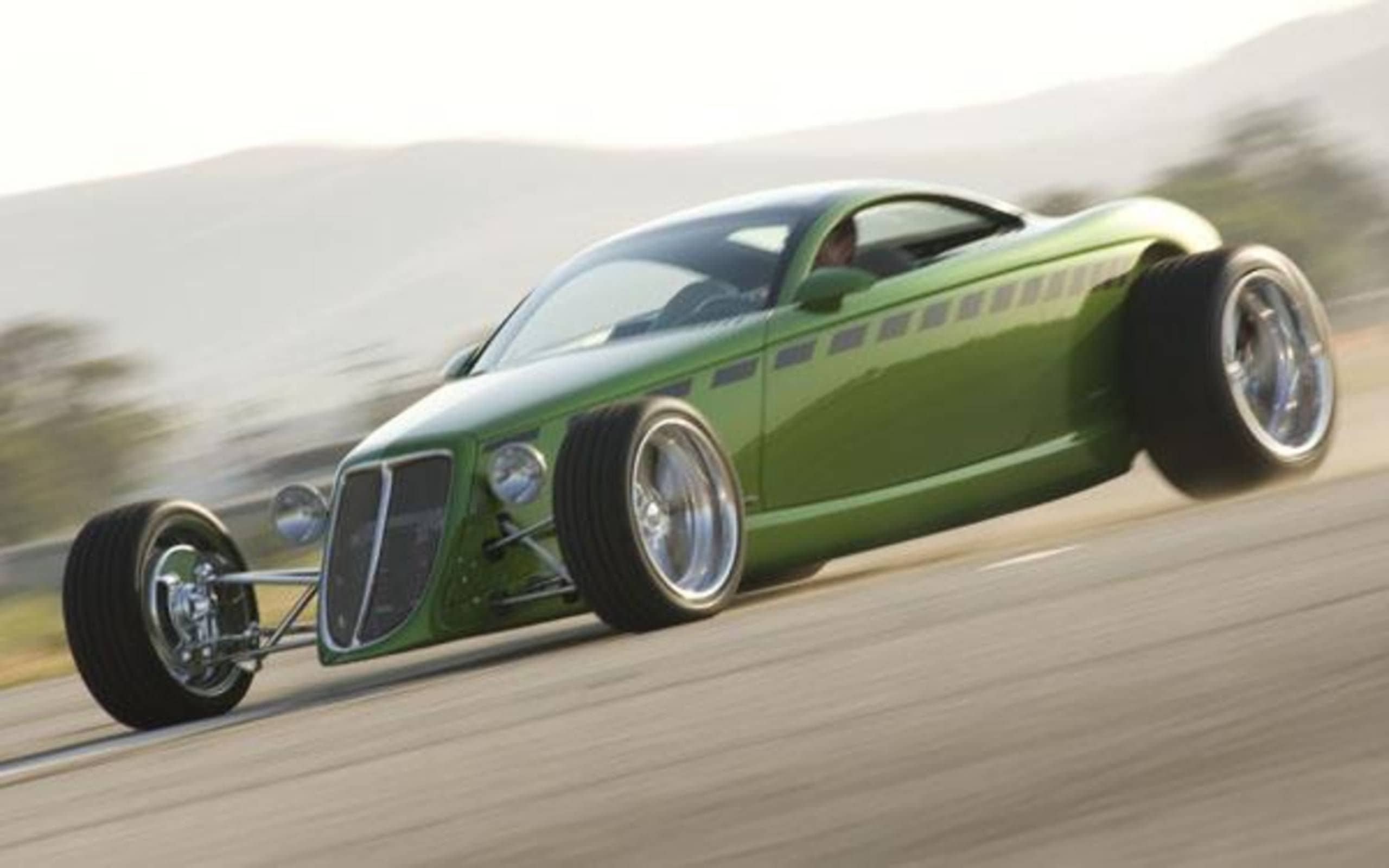 L’Hemisfear et le Foose Coupé étaient les rêves “de toute une vie” de Chip Foose, ses rêves d’adulte pour la vie. C’était il y a une décennie d’ici… Il avait dessiné la voiture quand il était étudiant à l’Art Center, et ce n’était que bien plus tard que la gloire et la fortune lui souriaient qu’il avait les moyens financiers de commencer à la construire. Et le construire, il jurait tous les dieux de la terre et au delà qu’il le ferait ; les 50 voitures devraient être sorties avant deux ans. Mais à cet l’instant d’avant d’il y a 10 ans, il n’y avait que deux Hot-Rods d’avenir, un vert et un noir ! Après les avoir entendus et les avoir vus tous les deux partir et revenir j’ai pu conduire les deux. Je vais pouvoir piloter d’autres modèles Foose au fil des ans tels le Roadstar “Where Art Meets the Pavement“, le Sportstar “Hero Branches Out” et un bon nombre de Hot-Rods plus “ordinaires”, non 100% Foose.