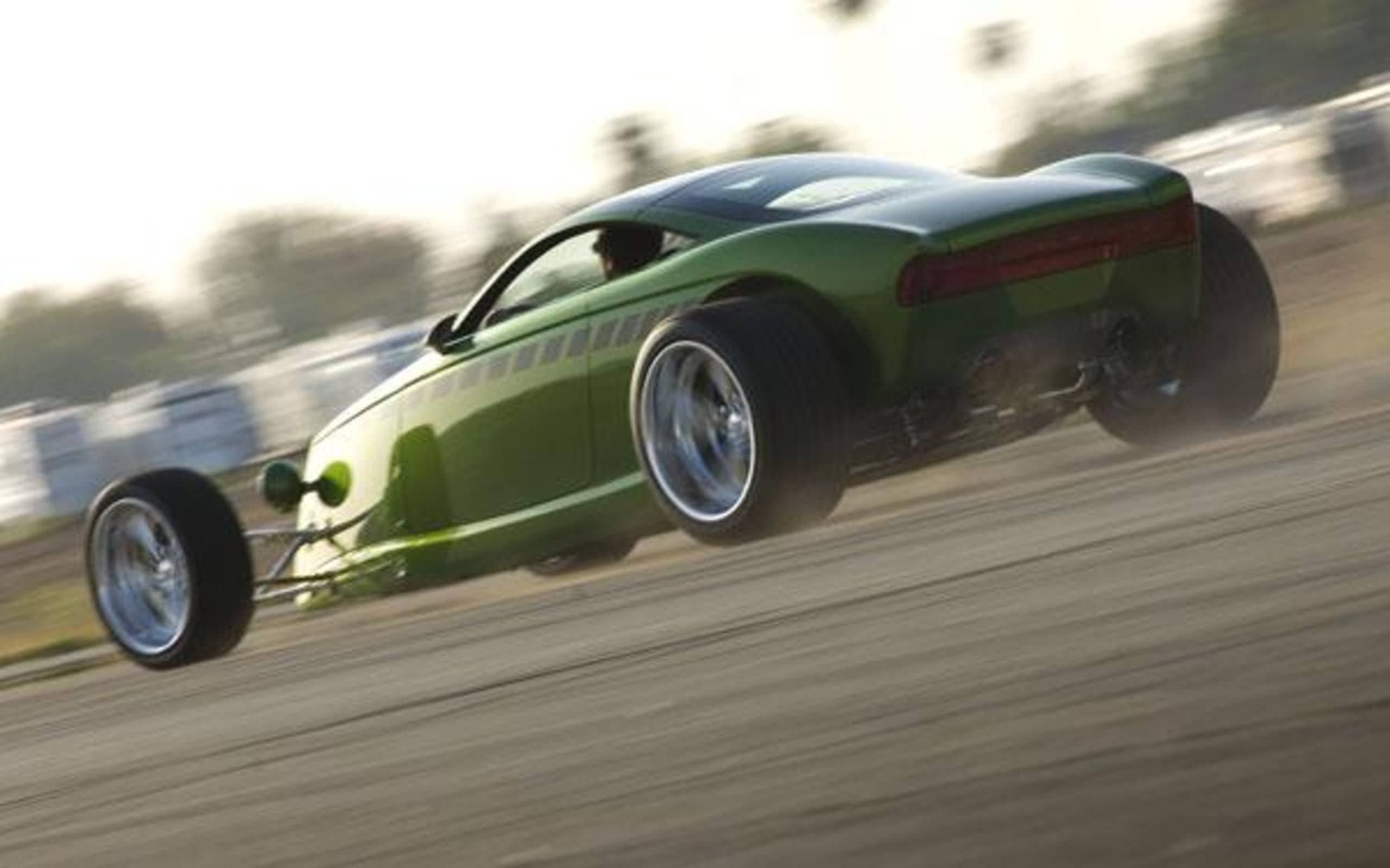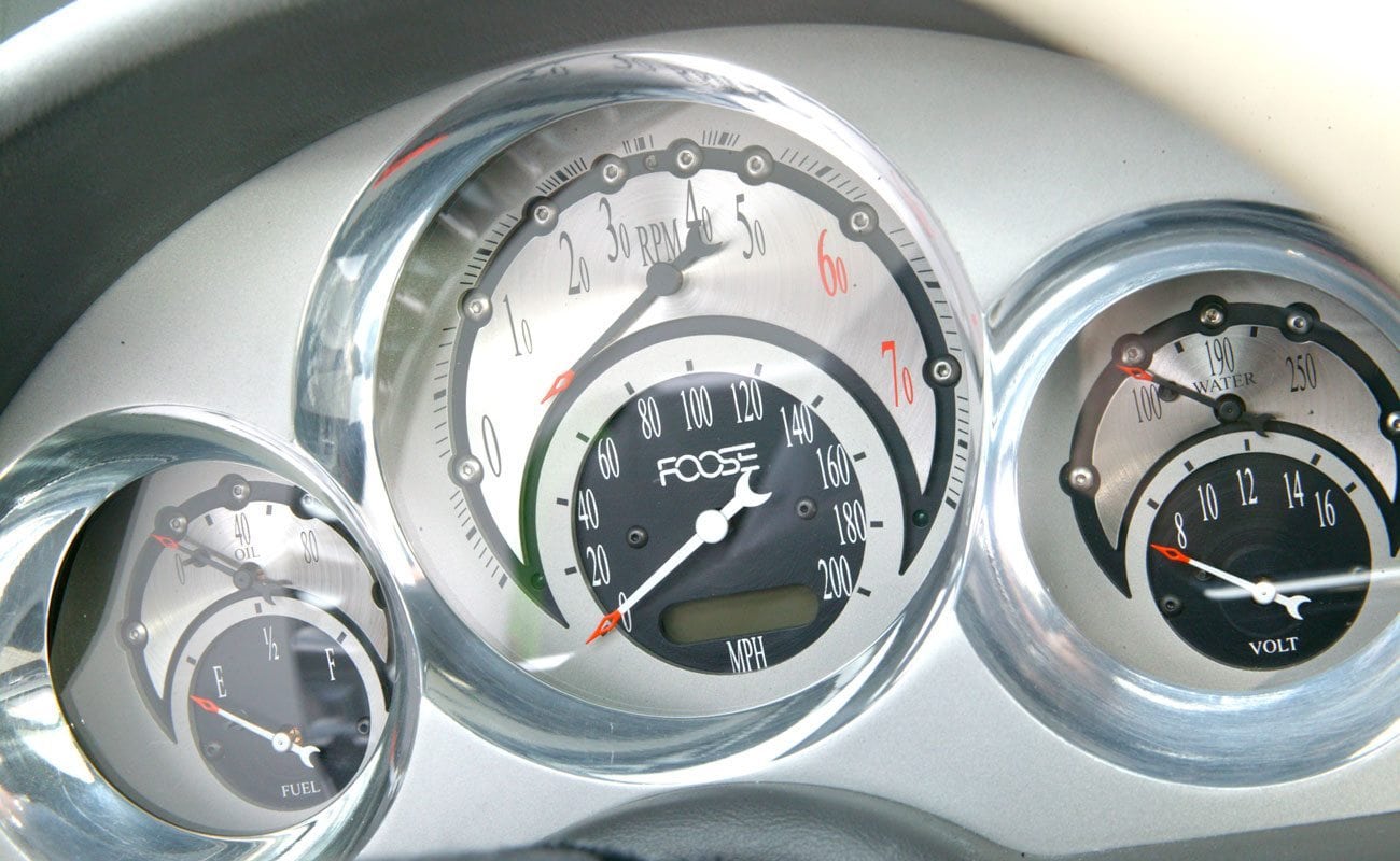 Une fois que les papillons s’ouvraient et que le mélange air/gaz soufflaient dans les chambres à la stœchiométrie principale, l’Hemisfear était tout rugissant d’accélération. Avec 550 chevaux et un poids de 2775 livres, le rapport poids/puissance était de 5 livres par cheval-vapeur, soit entre une Enzo Ferrari et une Lamborghini Murciélago. Cela faisait un raffut indescriptible, toujours, toujours, toujours et encore et donnait l’impression que Chips Foose avait fourré un Hemi dans un sac à dos. La sensation était stable, aussi. Ce n’était pas un Hot-Rod ’32 bricolé. L’ensemble semblait être du même niveau que sur certaines voitures de course. L’Hemisfear était bas et plat, stable comme un mariage du Midwest des States. Arrondissant les angles, les “G” balançaient de longitudinal à latéral et les énormes pneus s’agrippaient du mieux qu’ils pouvaient tandis que l’échappement détonnait…
