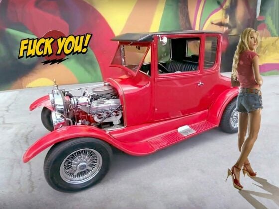 Les suspensions d’apparence Indy-car avaient été conçues et construites par Hotchkiss spécifiquement pour ces deux voitures. Ou, plutôt, avaient été redessinées et reconstruites spécifiquement pour ces deux Hot-Rods. “Ils n’arrêtaient pas de changer les points de fixation pendant qu’ils développaient la voiture”, m’avait déclaré John Hotchkiss en riant, ajoutant : “Voici le châssis, voici les roues, maintenant il suffit de relier les points”… Hotchkiss avait fait plus que les connecter. Les suspensions aux quatre coins étaient constituées de bras “A” supérieurs et inférieurs avec une barre de poussée qui pivotait sur des “coil-overs” montés verticalement, les deux avant étant visibles derrière cette calandre d’aspect ’34. Les pneus avant étaient des 225/40ZR-18s. La garde au sol était d’environ deux feuilles de papier journal ! C’était inconduisible. Il a fallu tout refaire…