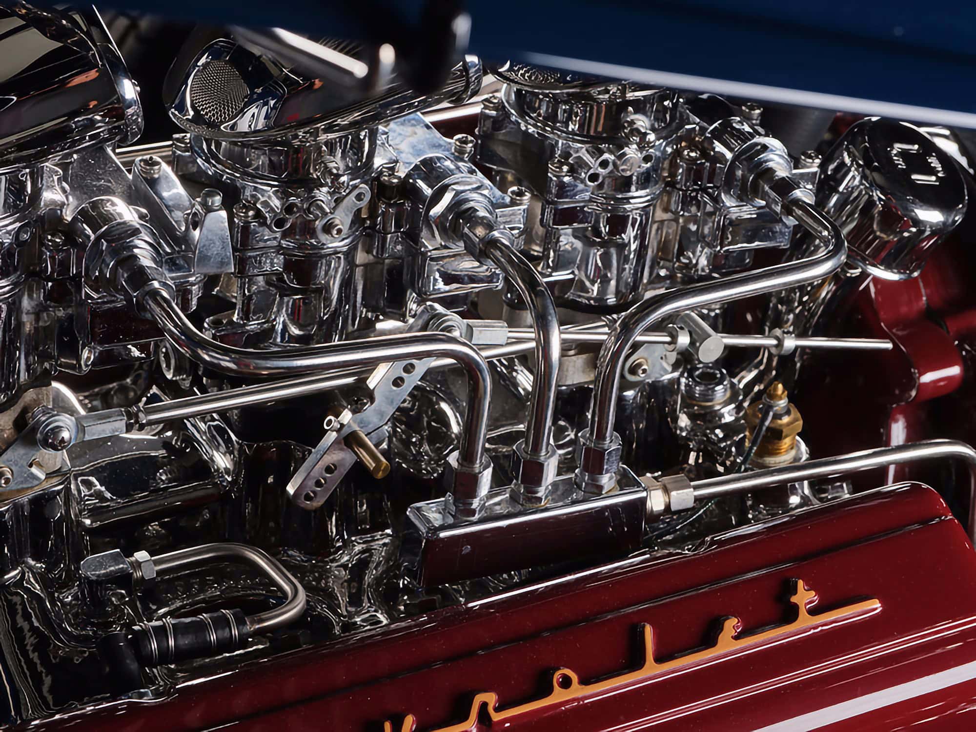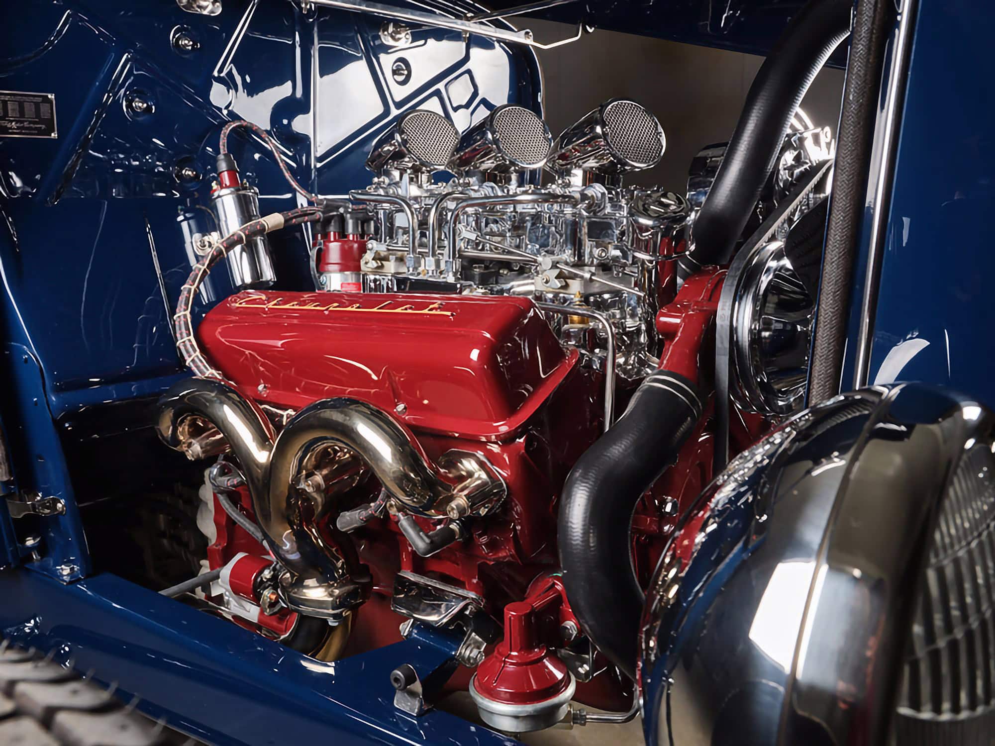 Comme dit un des proverbes des Hot Rodder’s : “Le battement de cœur de tout Hot Rod commence sous le capot”… Dans le cas de Johnny, il s’agit d’un Chevrolet 350ci small bloc qui a été soigneusement lissé et peint dans la même teinte que les jantes Ford Moselle Maroon. L’accessoire du V8 est “une paire de têtes de bosses de chameau” surmontées de caches en aluminium moulé PML, également été lissés et peints pour correspondre au bloc moteur Chevy.
