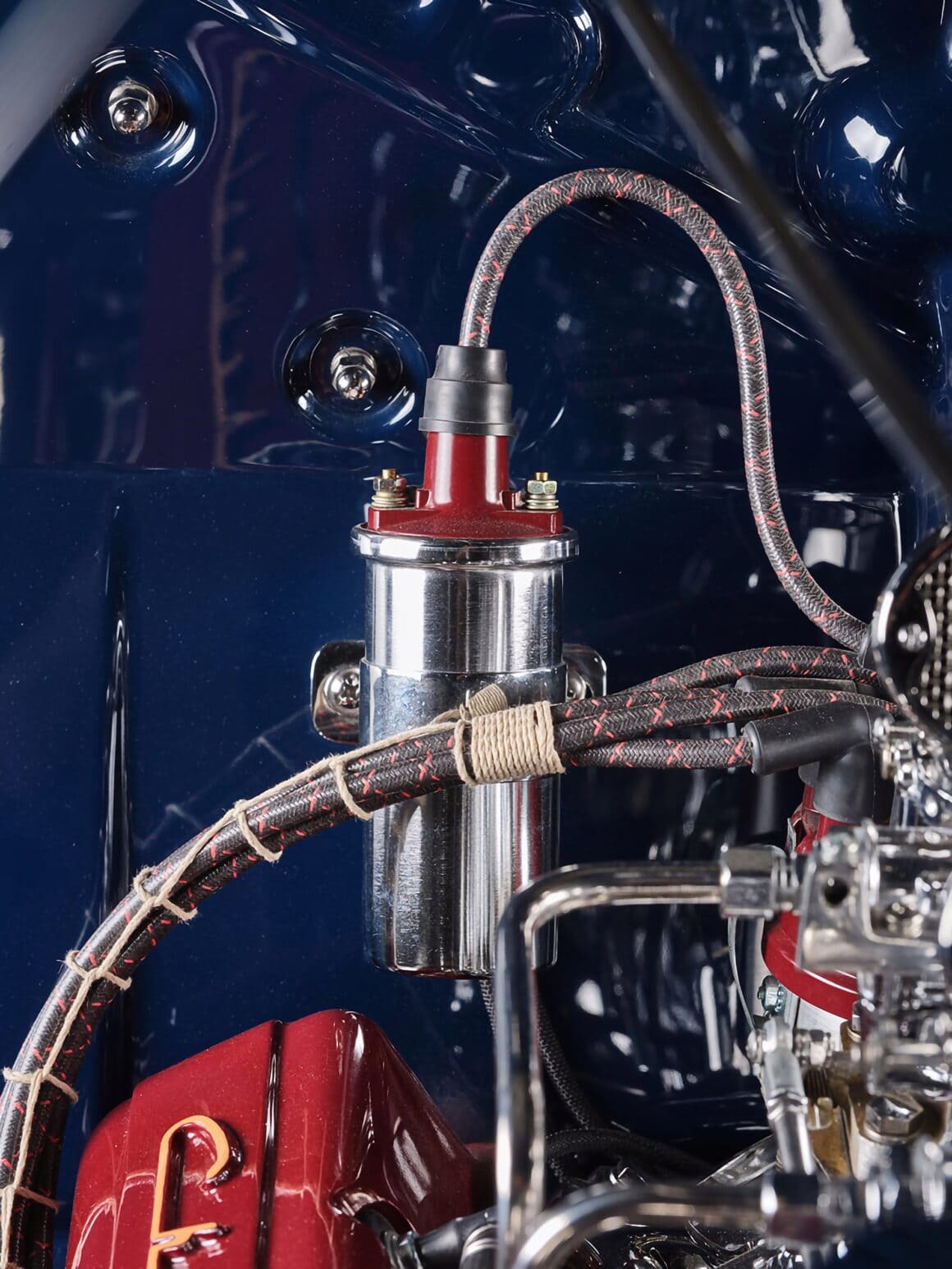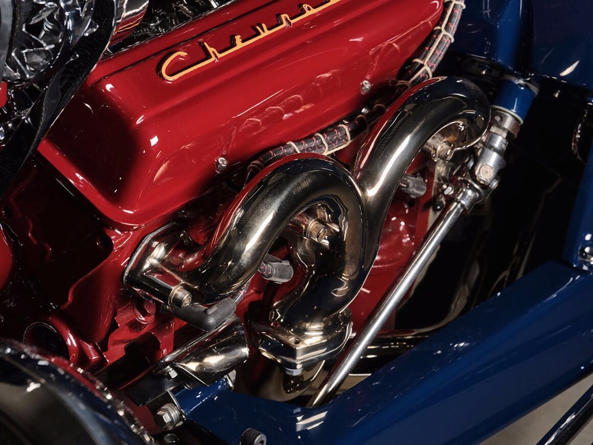 Une bobine d’allumage Mallory est fixée à la cloison pare-feu. Le distributeur utilise un ensemble de fils primaires d’apparence tissu vintage de chez Lokar. Les collecteurs d’échappement Tru-Ram en acier inoxydable poli proviennent de Speedway Motors et correspondent à un tuyau d’échappement lisse et poli en acier inoxydable et à mandrin plié et poli de 2-1/2 pouces qui traverse une paire de silencieux Flowmaster Pro Series Shorty Hushpower.