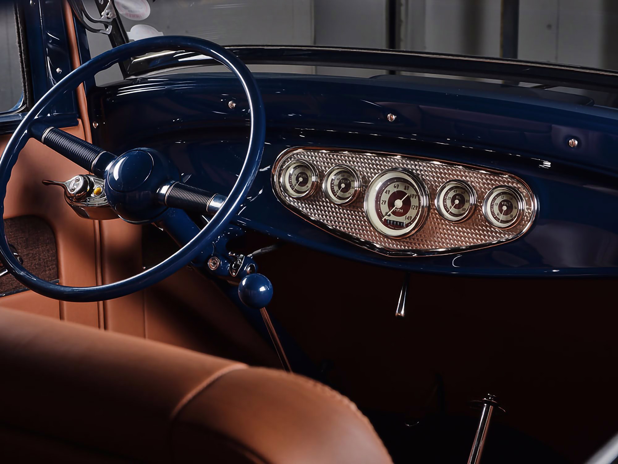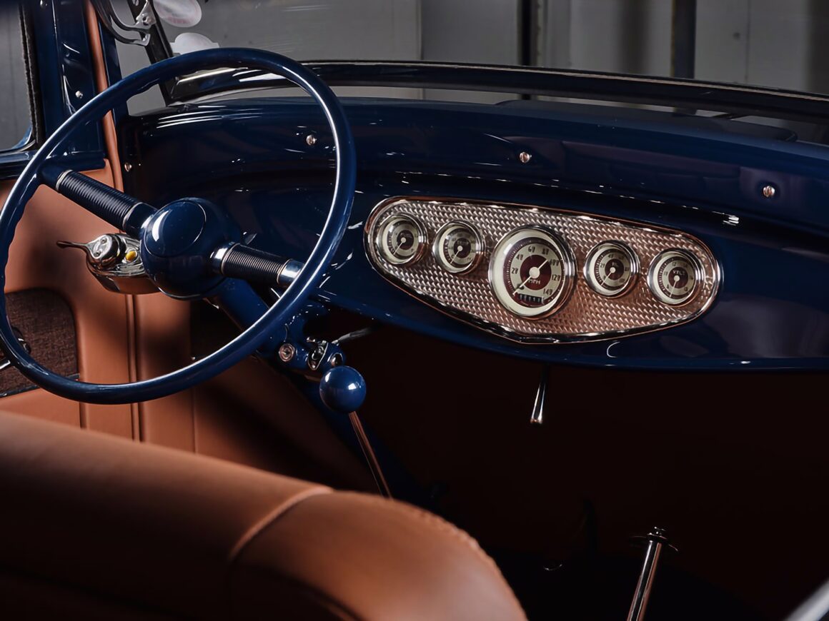 Me revoilà, pressé d’en terminer… Je cause maintenant de l’intérieur qui est toujours spacieux dans une berline et il y a donc beaucoup de place dans cette Ford Tudor’32. Vous finirez par admettre que finalement vous n’en avez rien à foutre… Donc… Le tableau de bord d’usine a été lissé et utilise un insert guilloché équipé d’un ensemble de cinq compteurs Classic Instruments… Vous écrire lesquels, ne fait que de devoir tapoter une liste inutile…