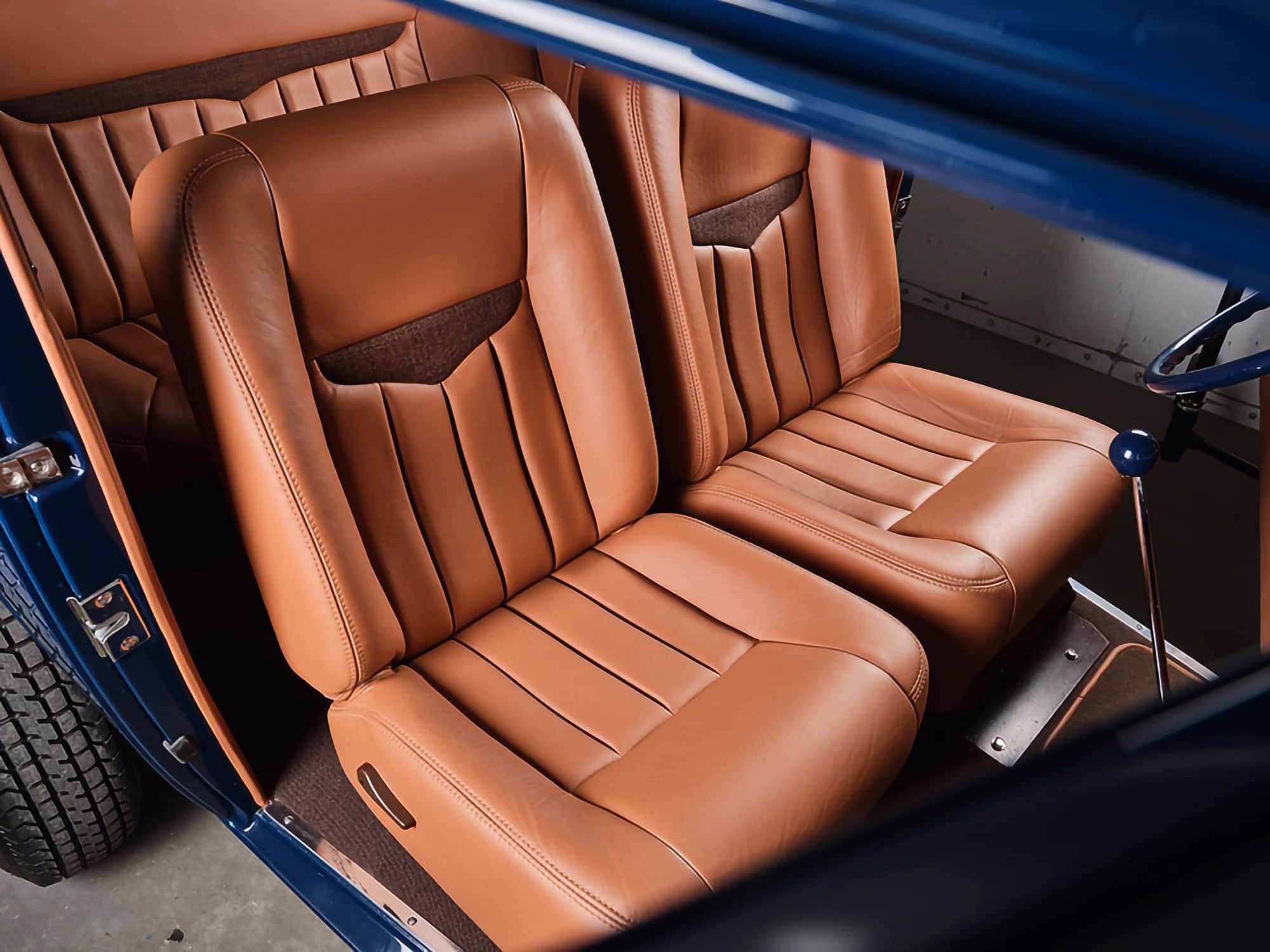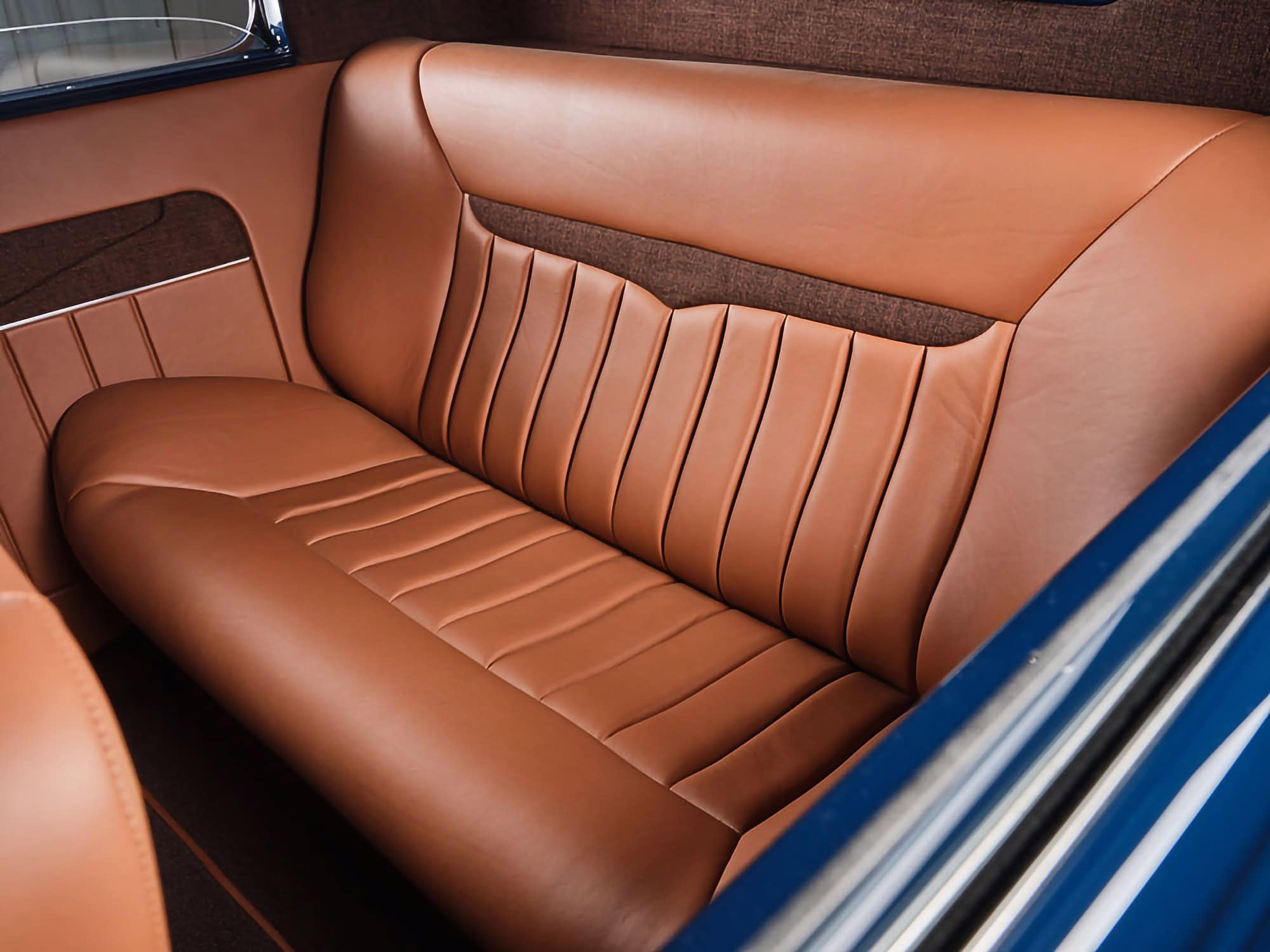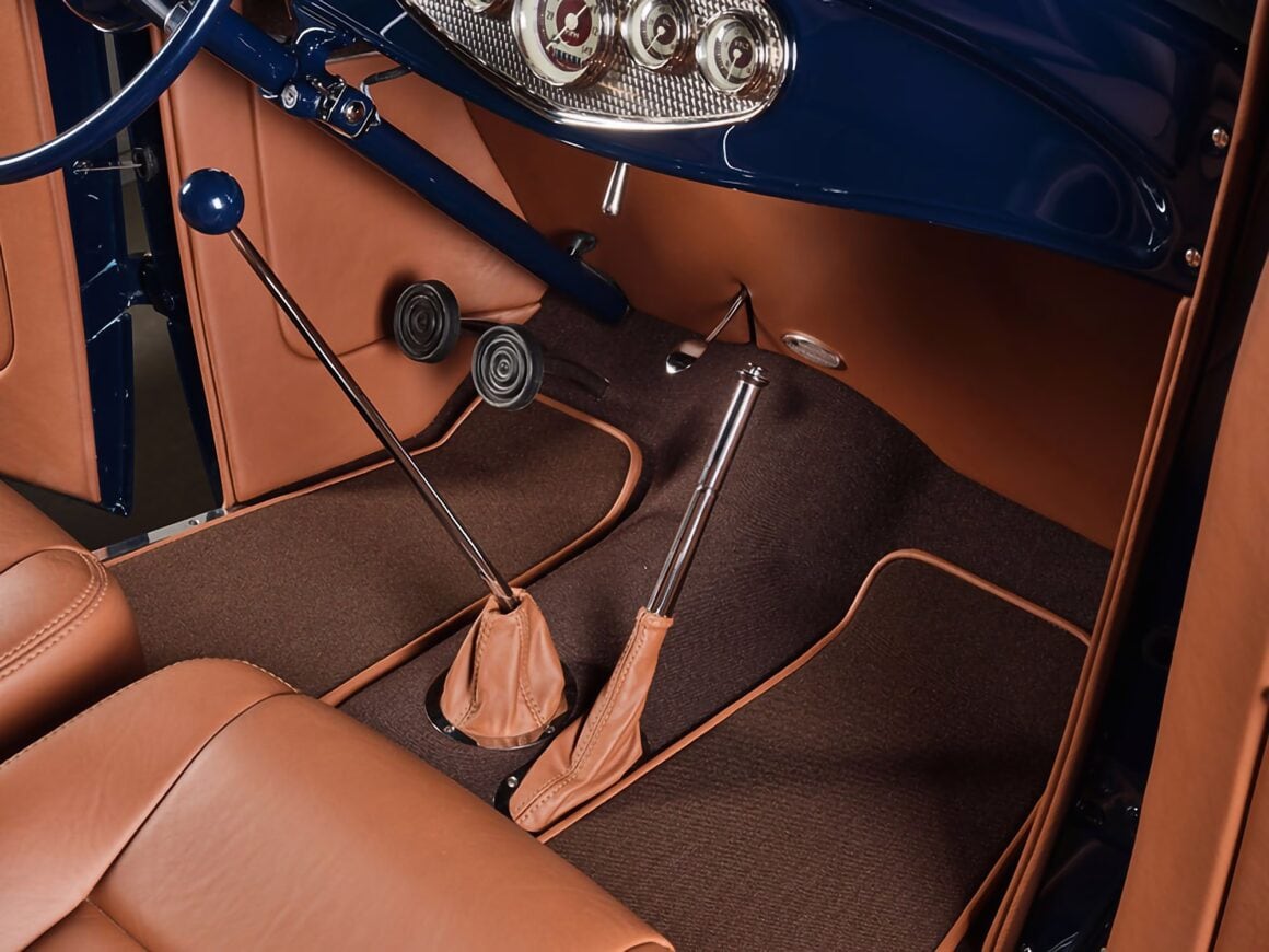 Le levier de vitesses Ford d’origine a été monté avec un support personnalisé fixé à la transmission TREMEC en même temps qu’un frein électronique Lokar. En ce qui concerne le confort, les baquets avant ont été fournis par Glide Engineering et la banquette arrière a été construite sur mesure par Steve Holcomb de Pro Auto Custom Interiors. La moquette est un tissage Daytona brun chocolat avec les tapis cousus dans le tissage Daytona garnis d’un passepoil en cuir.