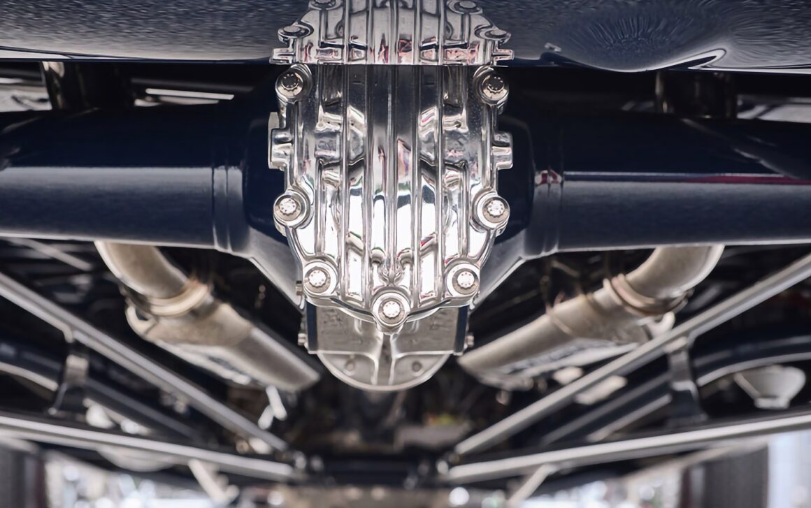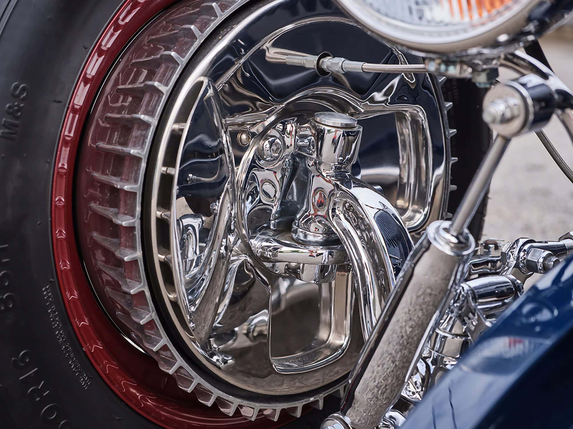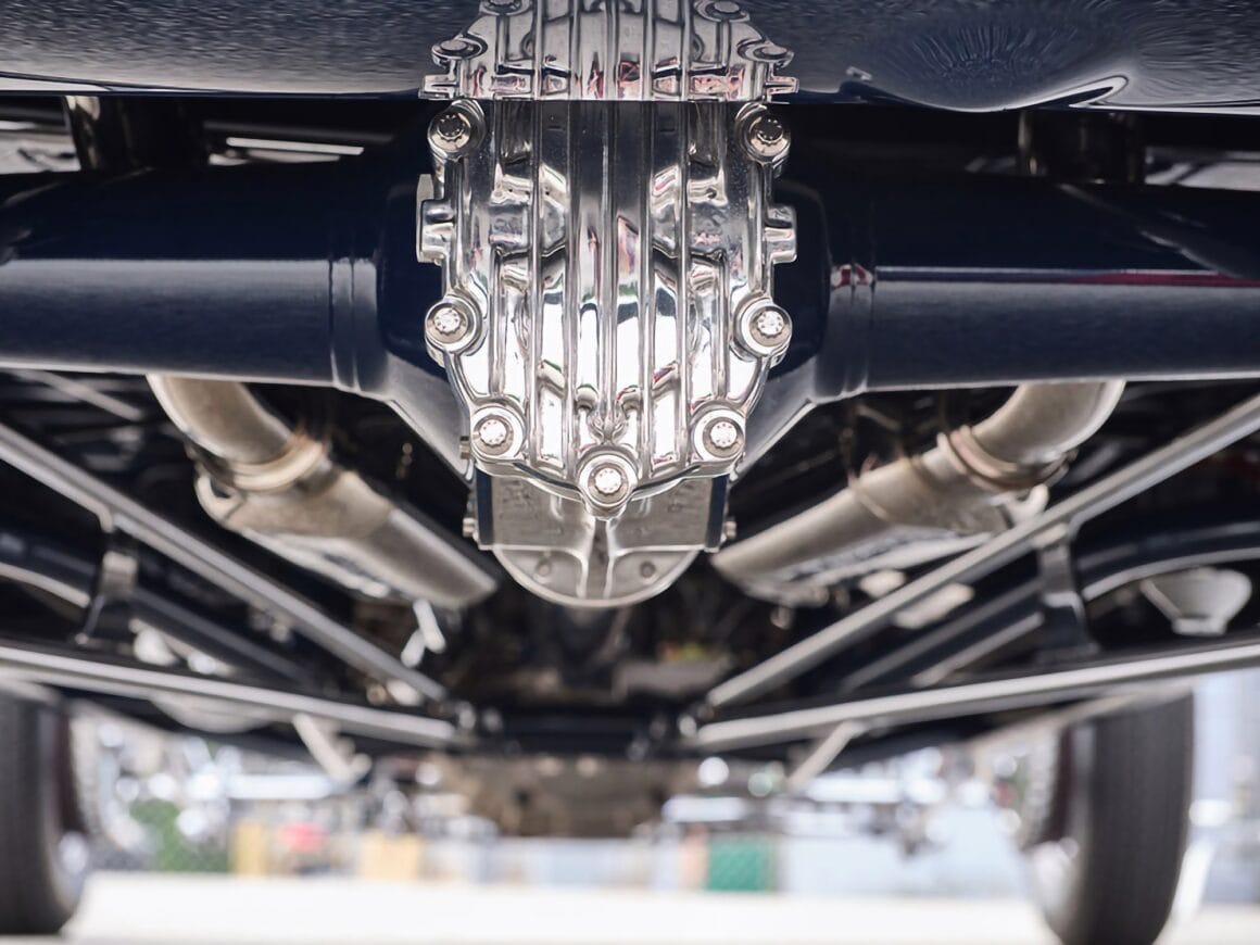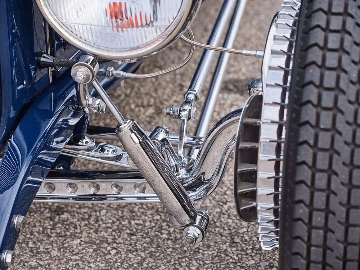 Ce sont des jantes en acier de 16po chaussées de caoutchoucs Coker Excelsior 5.50-16 et 7.50-16. Le châssis Pete and Jakes Hot Rod Parts (commandé par Honest Charley’s) a été étiré de 2 pouces au-dessus des 106 d’origine. À l’avant, l’essieu Super Bell chromé et percé dispose d’amortisseurs retravaillés par Pete et Jakes. À l’avant, les freins donnent l’apparence de tambours de freins vintage et à ailettes Buick avec des écopes d’air… Mais la réalité est autre…