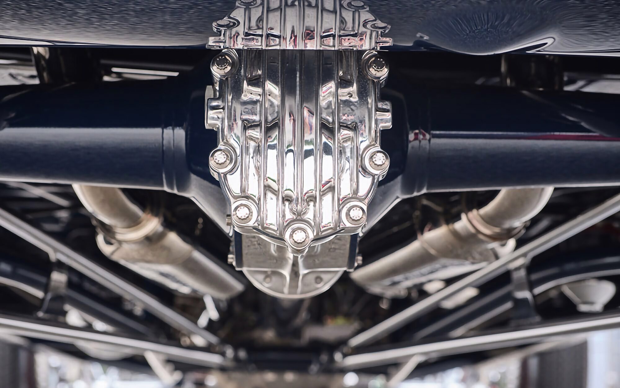 Les autres accessoires du moteur comprennent le ventilateur chromé à quatre pales avec entraînement par courroie trapézoïdale, une colonne montante de pompe à eau et un démarreur et un alternateur Powermaster. Pour ramener la puissance à l’arrière, une transmission TREMEC TKO 500 à 5 vitesses utilise le levier de vitesses d’usine modifié. D’écrire ces détails je fatigue de tant en mettre, alors que vous n’achèterez rien auprès des sociétés US indiquées.