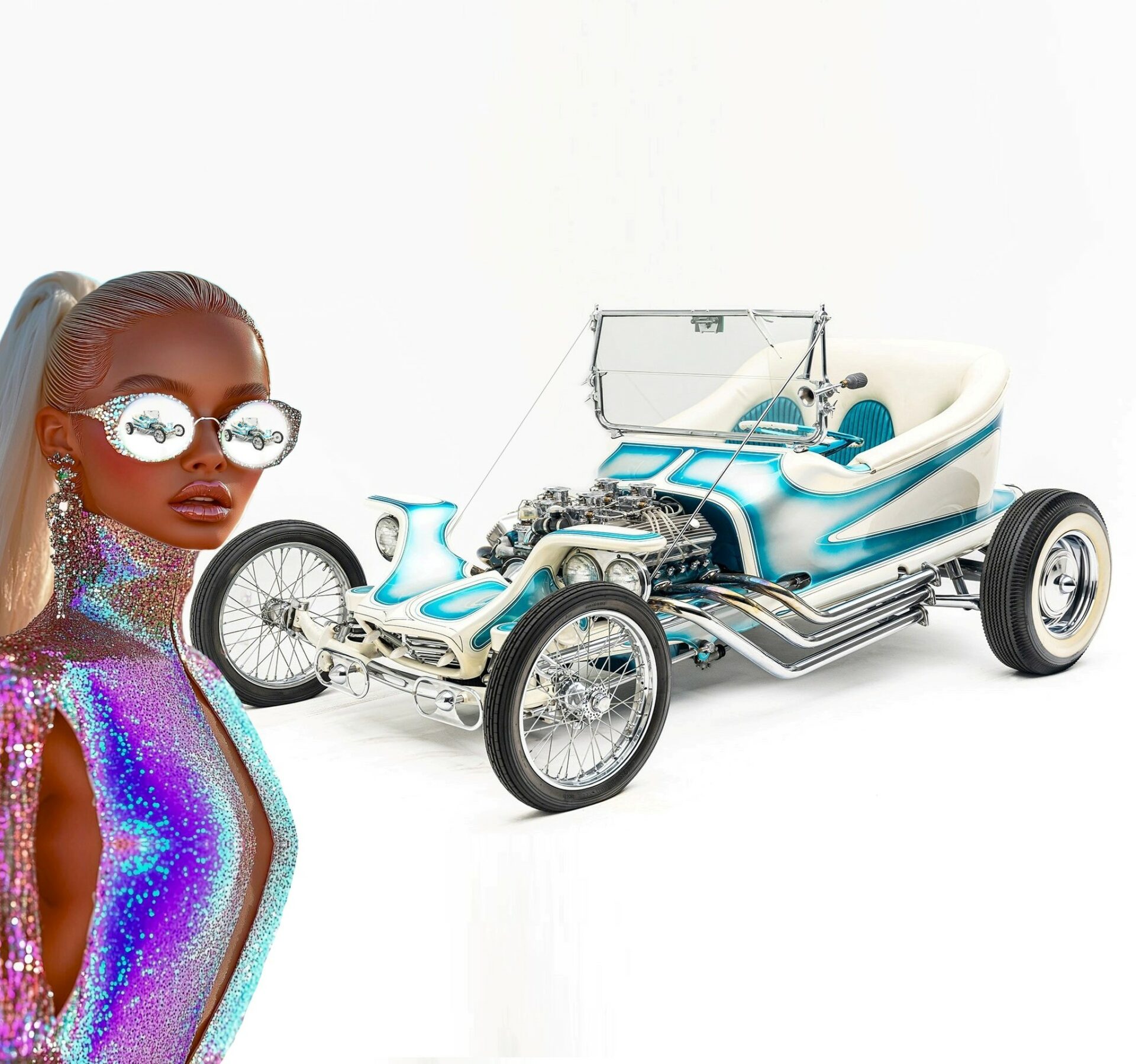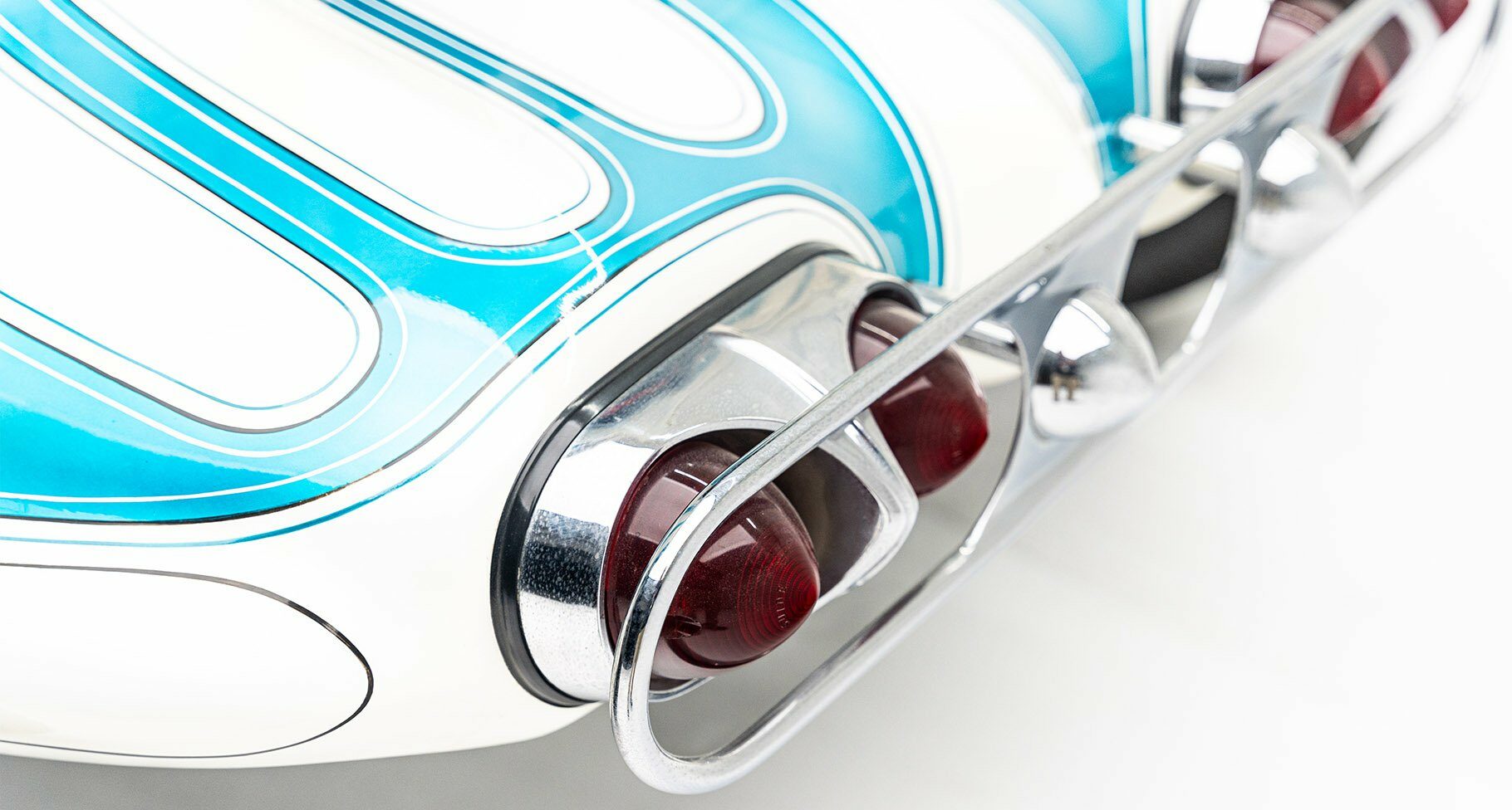 Ed a eu l’idée d’une voiture en fibre de verre après avoir vu une photo d’Henry Ford balançant, d’un pont, un marteau sur une Ford de 1941. La Ford avait un capot en fibre de verre et, selon la légende de la photo, le marteau n’a pas abimé le capot. Cela a époustouflé Roth, et il a pris une note mentale de ce nouveau matériel… Plus tard, il a été initié au mystérieux matériau à la jetée de Huntington Beach où il a vu un surfeur avec une planche de surf en bois recouverte d’un revêtement imperméable en fibre de verre…. Eurekaaaaaaa !