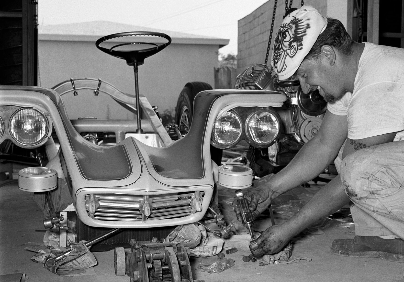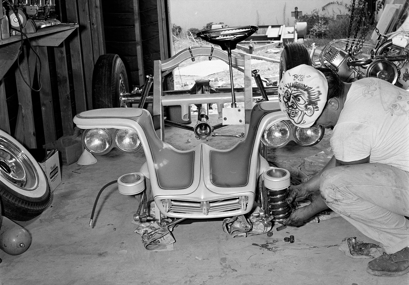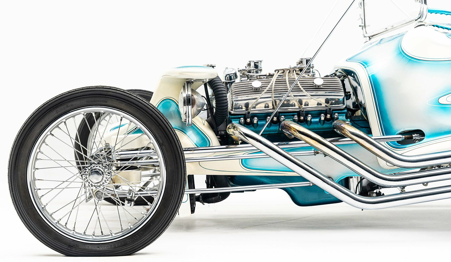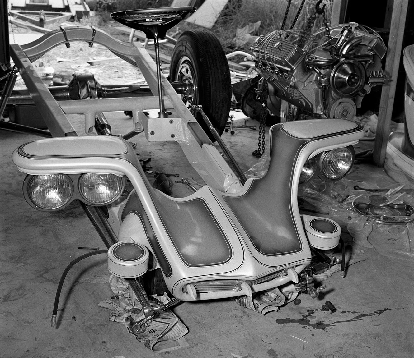 Il a reconstruit le moteur Cadillac et l’a équipé de quatre Stromberg 97 montés sur un collecteur Cragar qui provenaient d’un vol dans l’Utah… Le moteur a ensuite été équipé de caches-soupapes à ailettes Cal Custom payées avec un chèque sans provision volé a une caisse de supermarché… Un carter d’huile chromé et un ensemble de longs collecteurs zoomie sont arrivés comme par magie venant d’un vol à New-York et un essieu avant et des axes d’un Ford V8 de 1937 récupérés un samedi soir durant une nuit glauque dans un garage, ont été installés à l’avant.