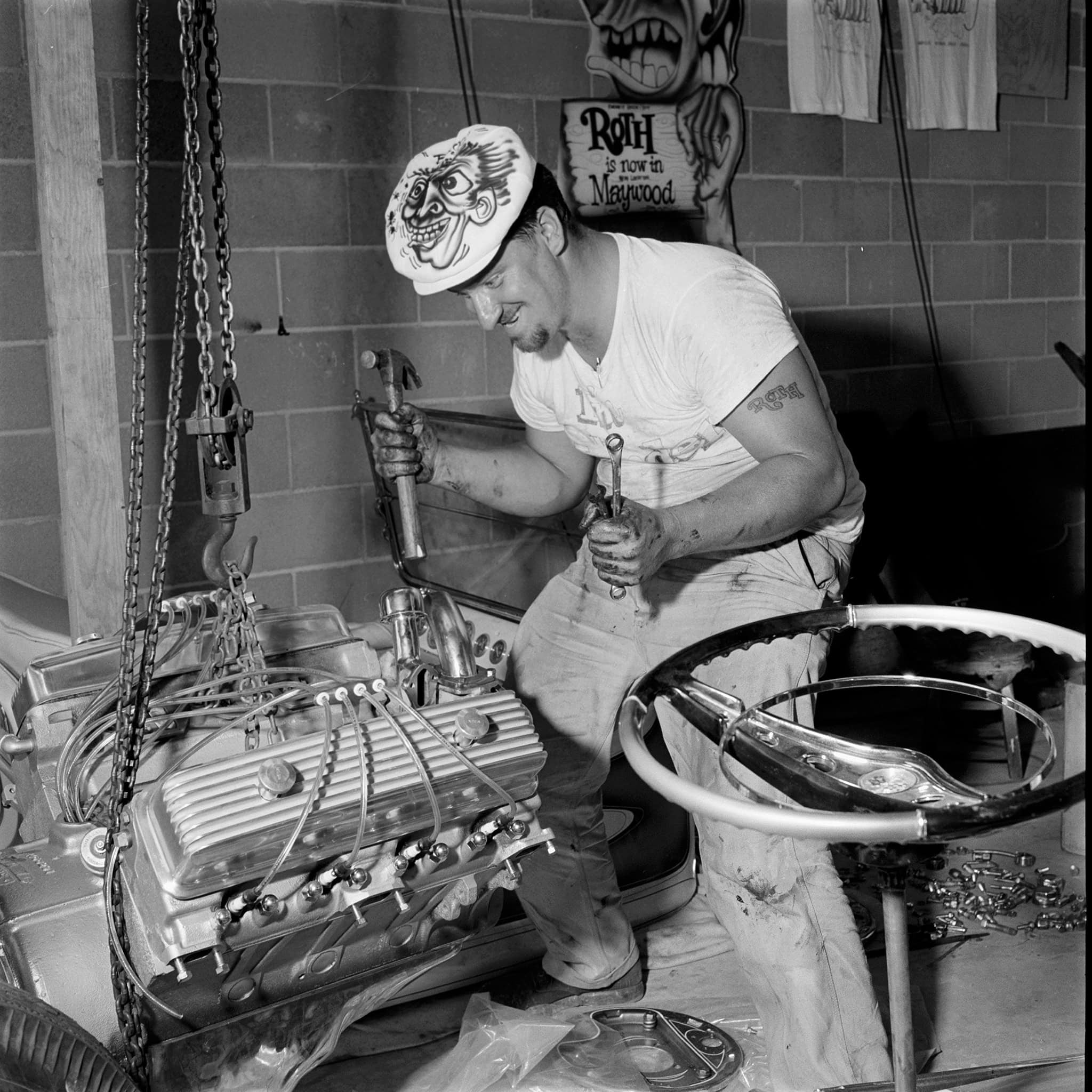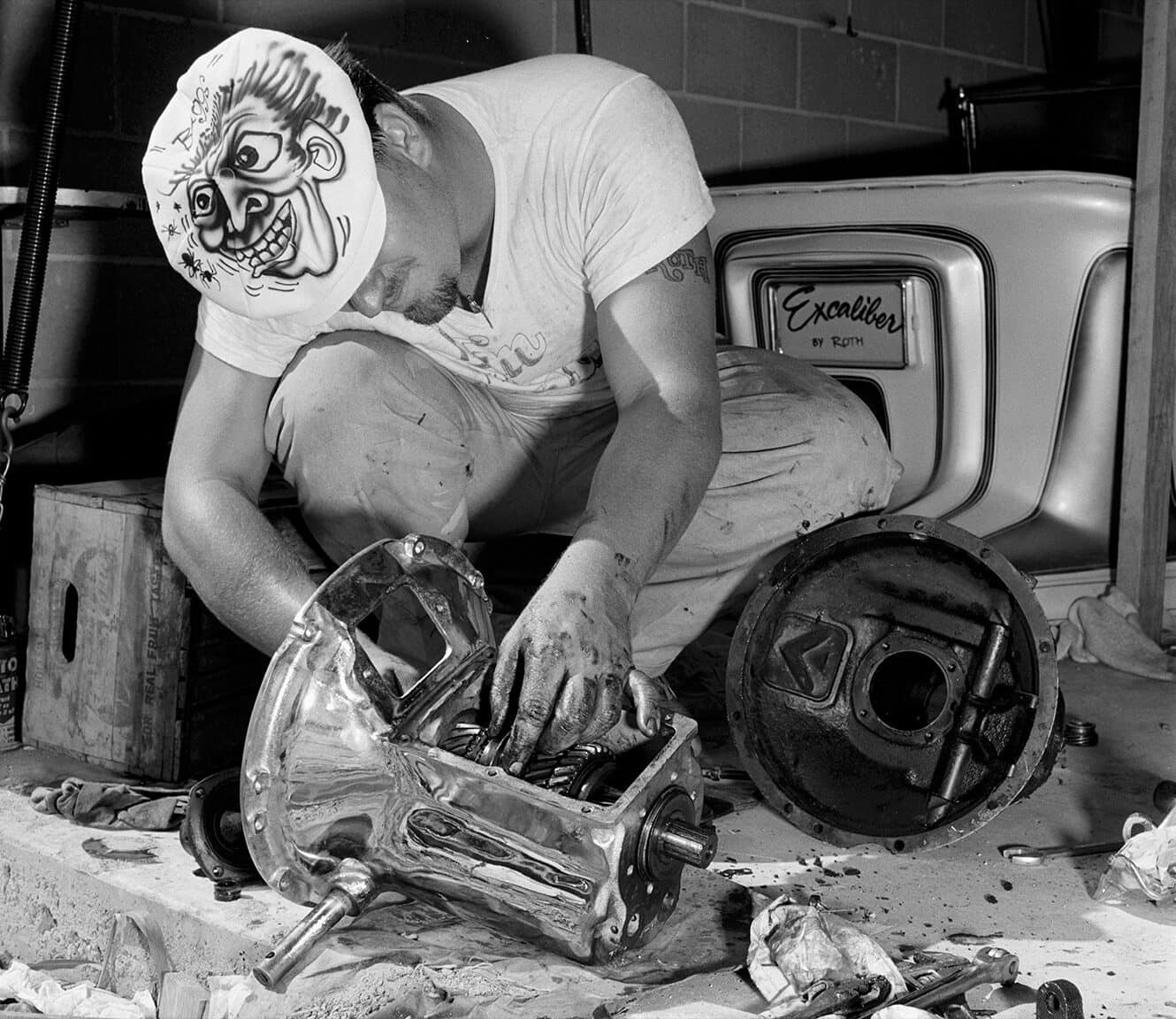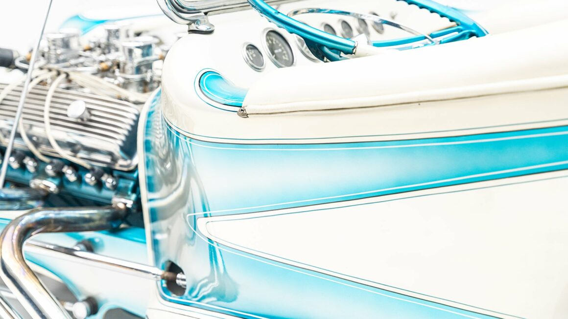Il a reconstruit le moteur Cadillac et l’a équipé de quatre Stromberg 97 montés sur un collecteur Cragar qui provenaient d’un vol dans l’Utah… Le moteur a ensuite été équipé de caches-soupapes à ailettes Cal Custom payées avec un chèque sans provision volé a une caisse de supermarché… Un carter d’huile chromé et un ensemble de longs collecteurs zoomie sont arrivés comme par magie venant d’un vol à New-York et un essieu avant et des axes d’un Ford V8 de 1937 récupérés un samedi soir durant une nuit glauque dans un garage, ont été installés à l’avant.