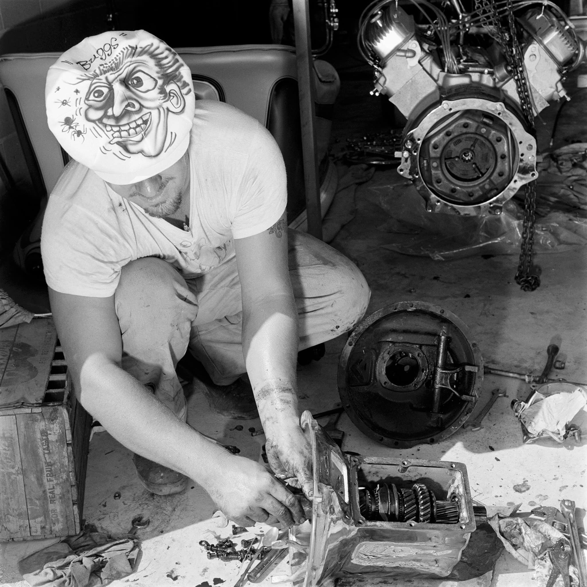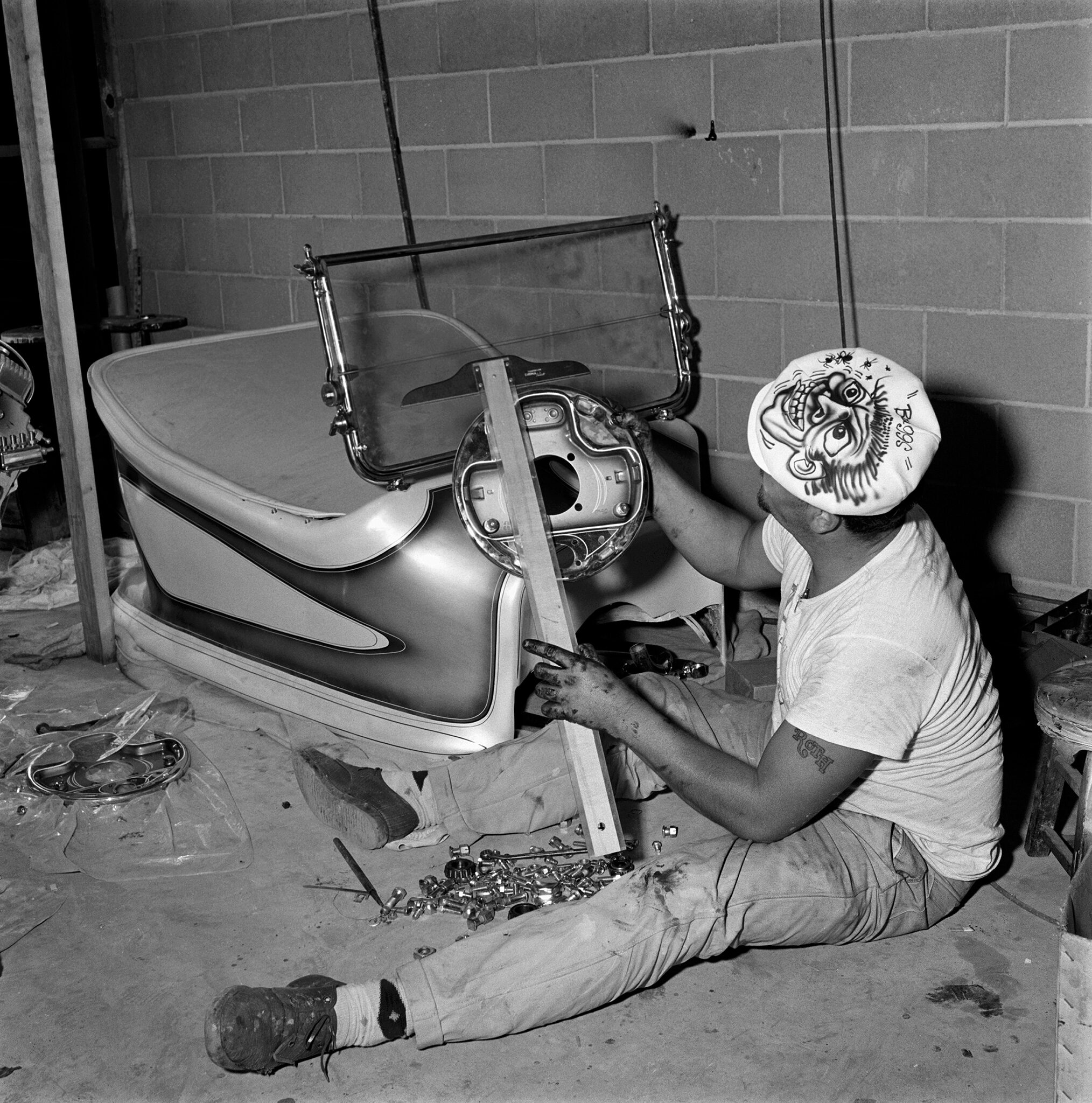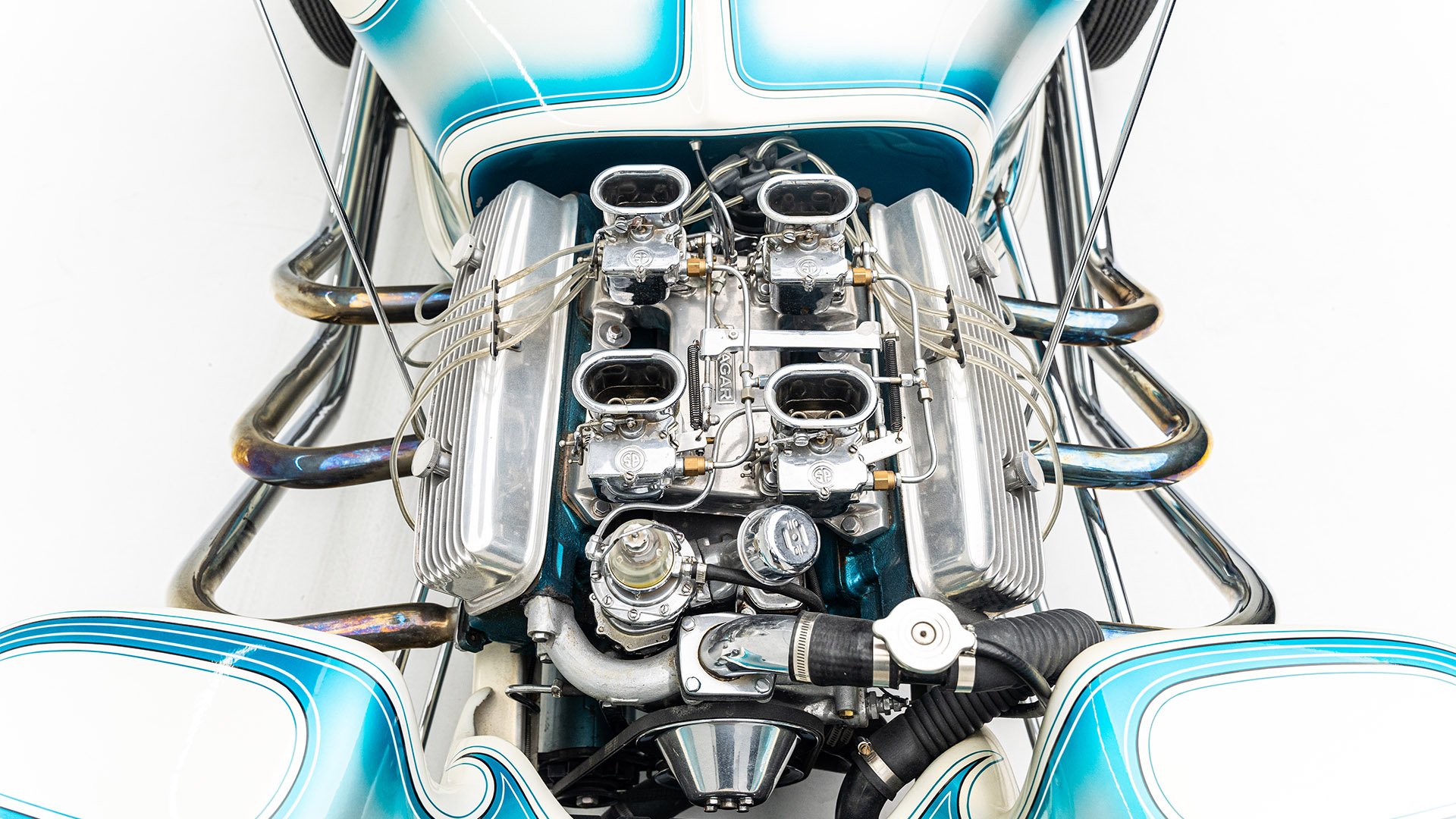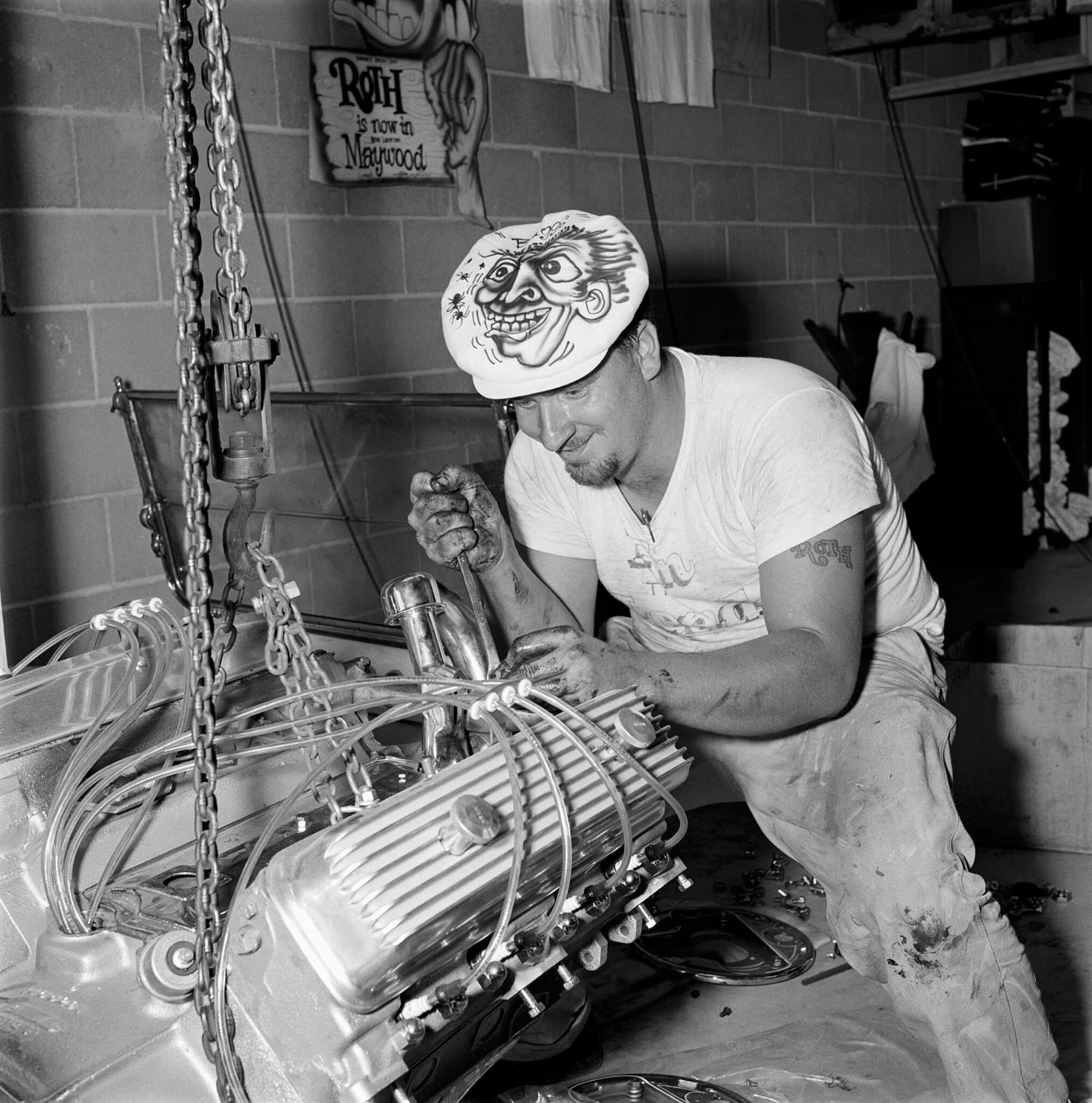 Il a reconstruit le moteur Cadillac et l’a équipé de quatre Stromberg 97 montés sur un collecteur Cragar qui provenaient d’un vol dans l’Utah… Le moteur a ensuite été équipé de caches-soupapes à ailettes Cal Custom payées avec un chèque sans provision volé a une caisse de supermarché… Un carter d’huile chromé et un ensemble de longs collecteurs zoomie sont arrivés comme par magie venant d’un vol à New-York et un essieu avant et des axes d’un Ford V8 de 1937 récupérés un samedi soir durant une nuit glauque dans un garage, ont été installés à l’avant.