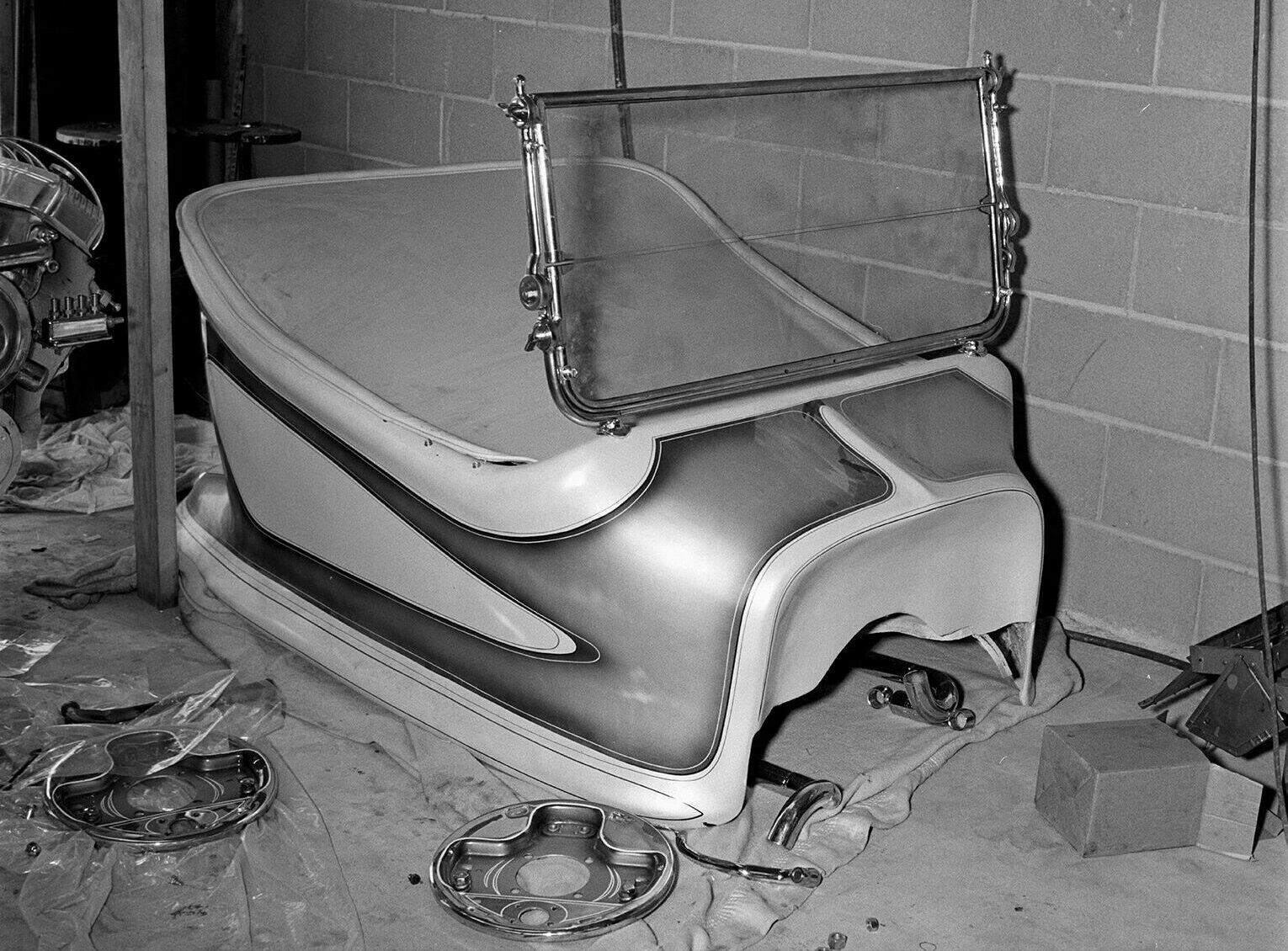 Après cela, Ed a lu l’histoire d’un Hot Rodder nommé W. R. Shadoff dans Life Magazine. Shadoff avait construit un Streamliner Bonneville appelé Shadoff Special, en fibre de verre. C’était en 1957, Ed était intrigué et, en quelques jours, il était occupé à expérimenter de la fibre de verre dans son nouvel atelier au 4616 Slauson Avenue à Maywood. Sa construction était basée sur une Ford Model A de 1929 avec un moteur Cadillac de 1950 qu’Ed avait trouvé dans une casse, qu’il a récupéré/volé et installé entre les longerons de son Streamliner.