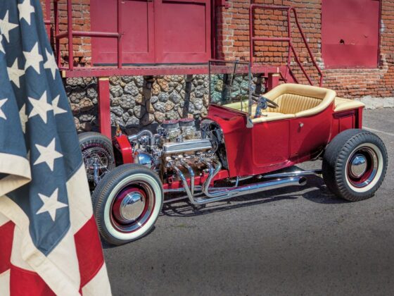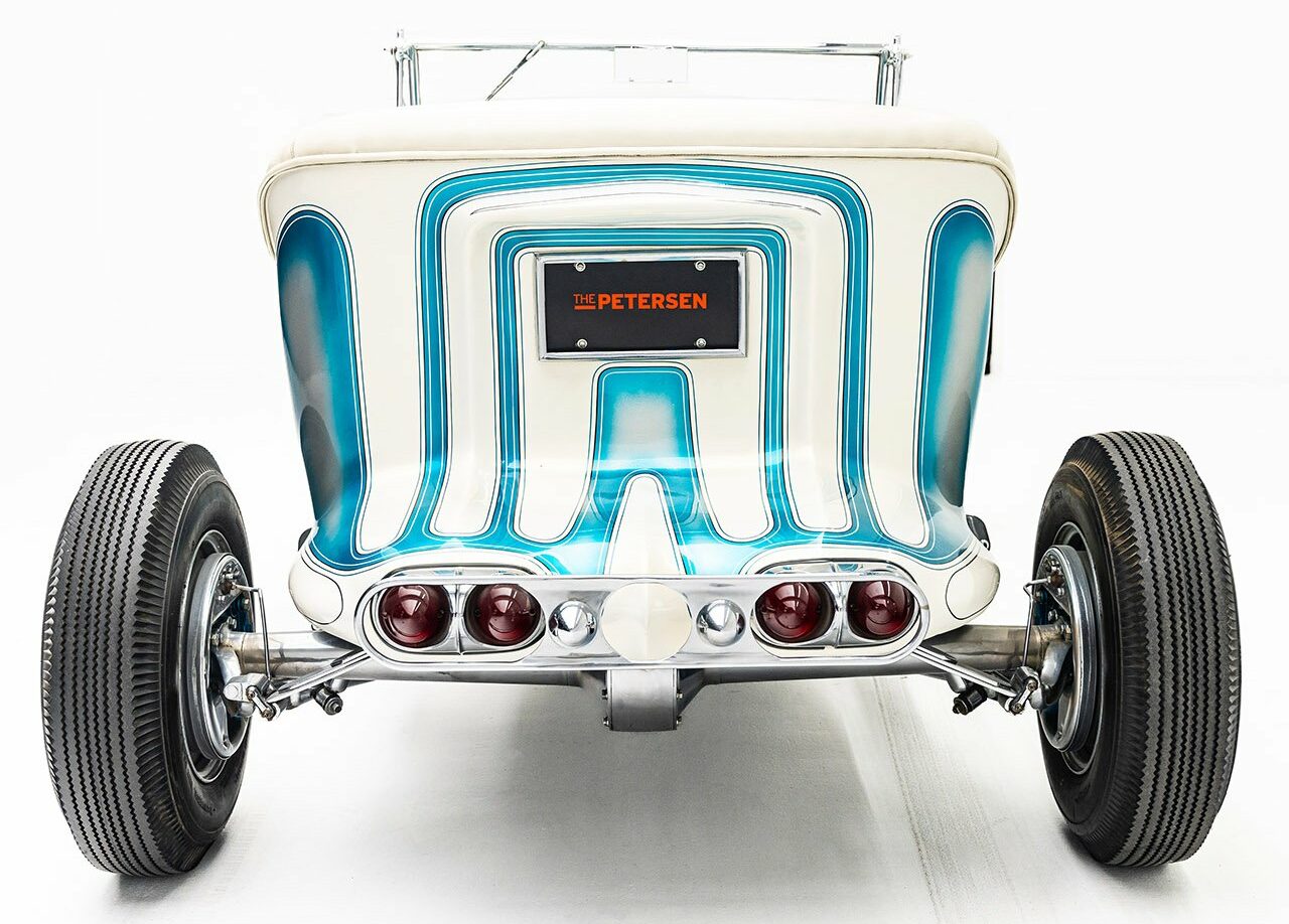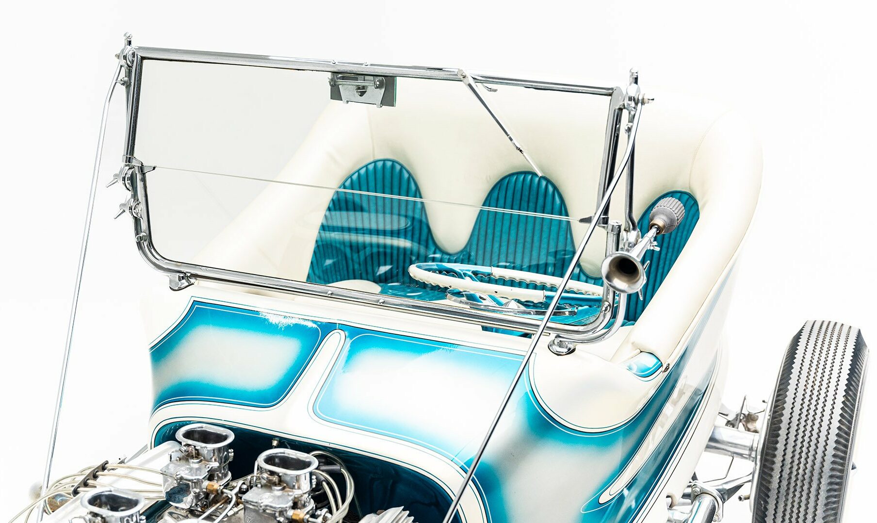 Il en fut de même pour quelques coupelles de ressorts hélicoïdaux Chevrolet de 1958. Le reste du train de roulement, à l’exception du ressort transversal arrière du modèle A, provenait d’une Ford de 1948 “découverte” dans un parking… Un boîtier de direction Ford de 1941 de provenance indéterminable a été monté du côté conducteur. La hauteur avant a été conservée d’origine, tandis que l’arrière a été surélevé. Le cadre du pare-brise provenait d’une Dodge de 1922, des feux arrière d’une Chevrolet Bel-Air de 1958 également découverte dans un parking ont été équipées de lentilles Chevrolet de 1956…