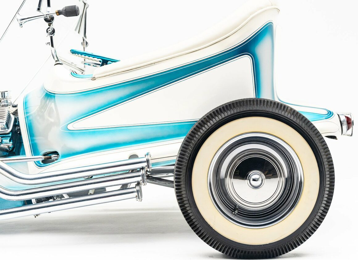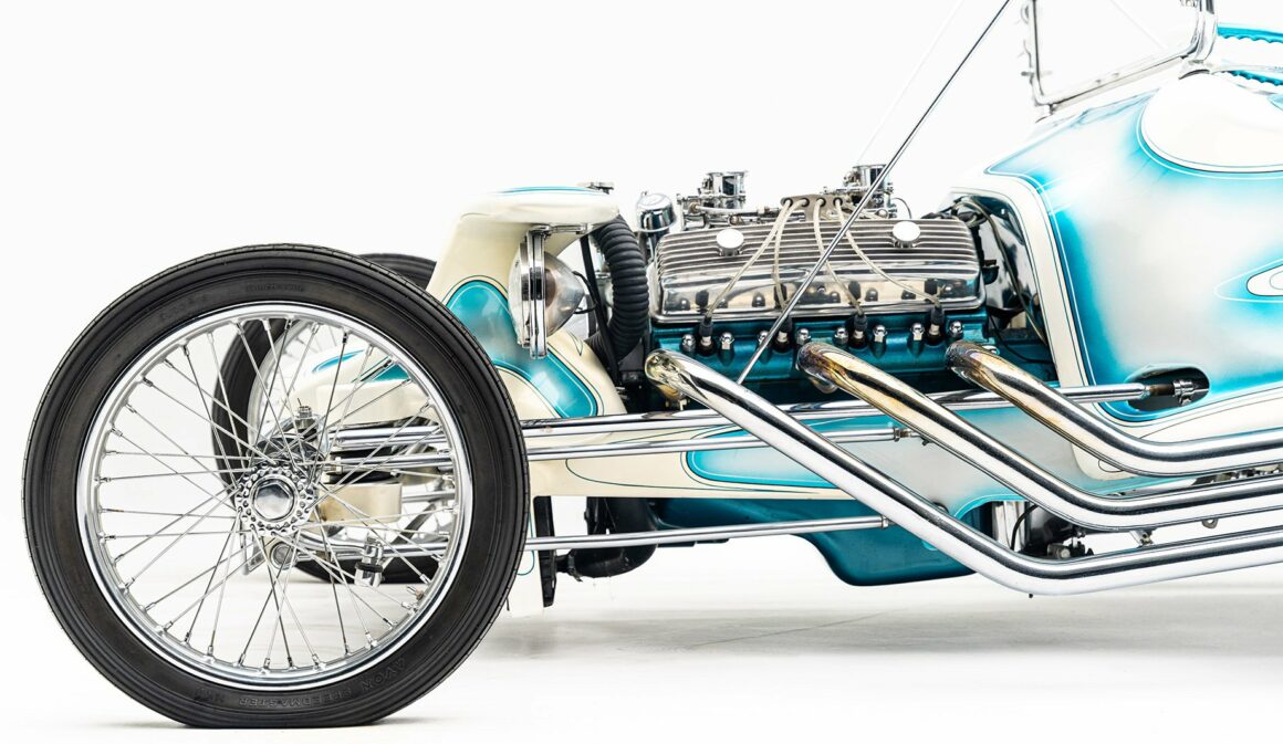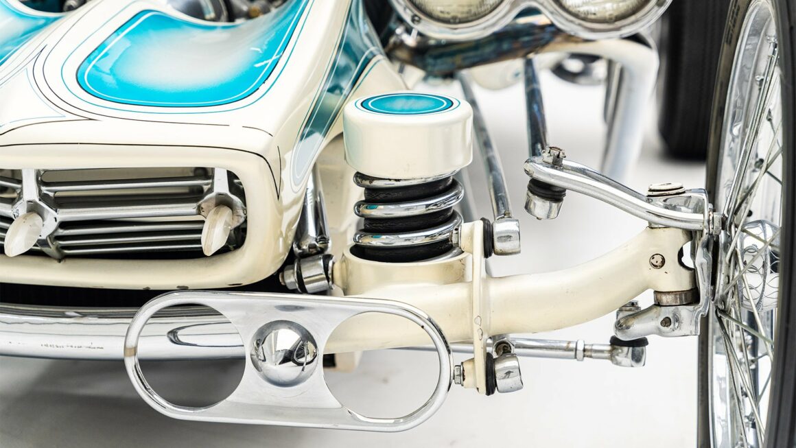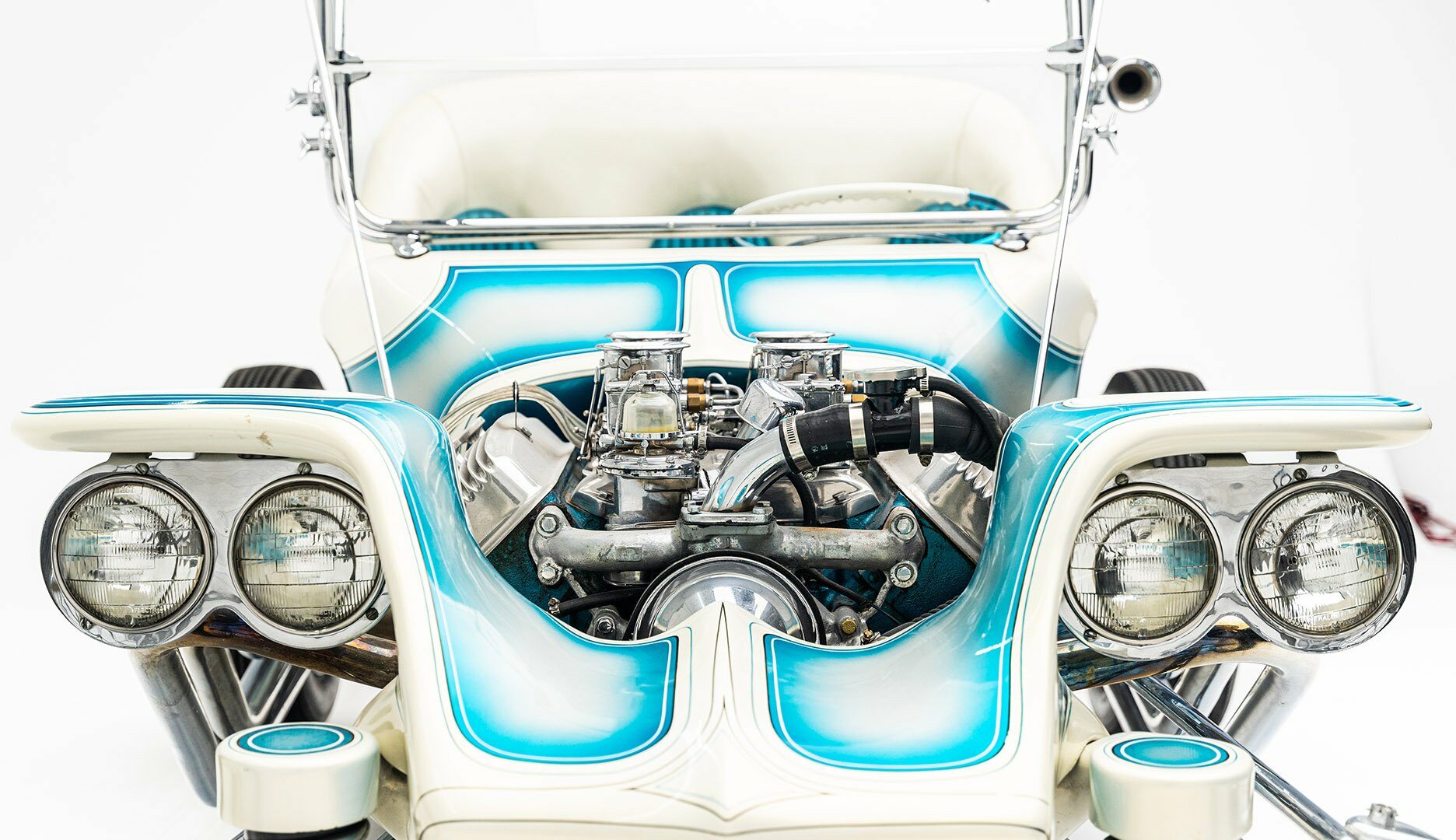 Les phares quadruples d’une Rambler de 1959 en attente d’entretien dans l’Iowa ont été installés à l’avant (Les phares étaient montés sous les ailes dans un anneau spécial). La calandre a été fabriquée à partir d’une partie d’une calandre Chevrolet de 1959 qui semblait abandonnée en rue… et un radiateur DKW d’origine douteuse a été installé pour refroidir l’énorme moteur Cadillac. Des Nerf-bars ont été conçues et installées pour créer un look “dragster” et Larry Watson de Watson’s House of Style a peint gratuitement la voiture pour Ed sur une vague promesse d’un retour de commandes.