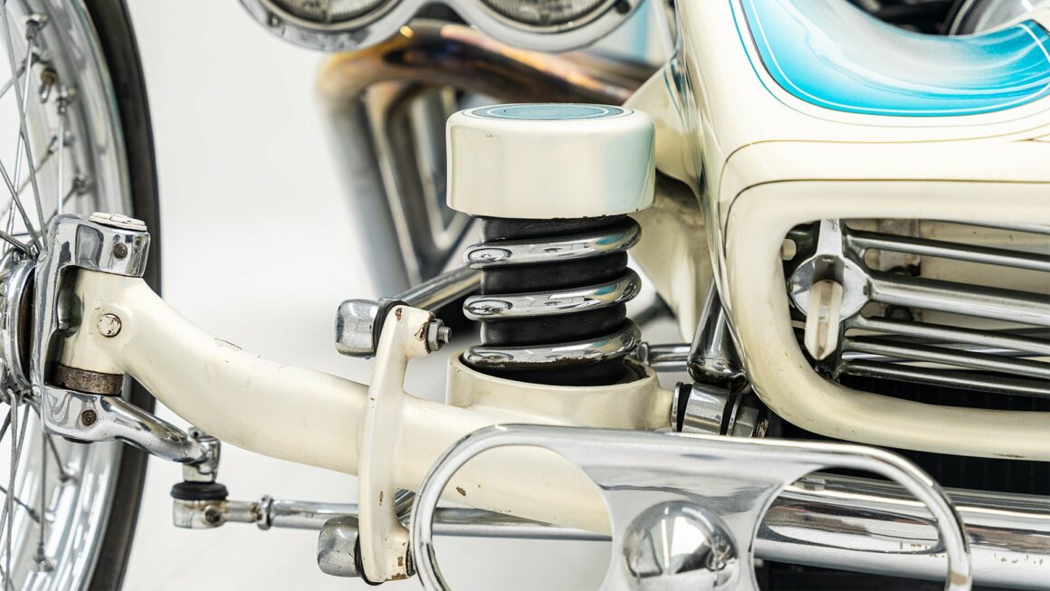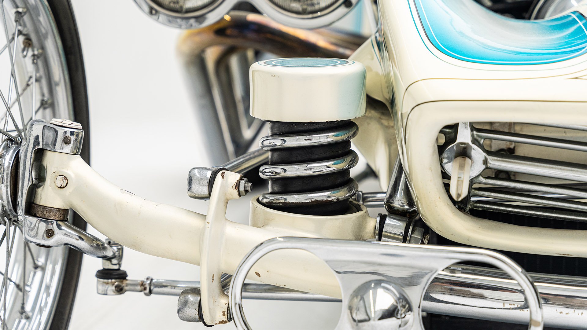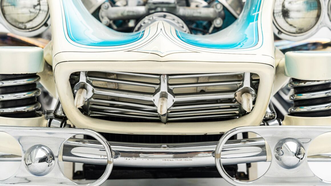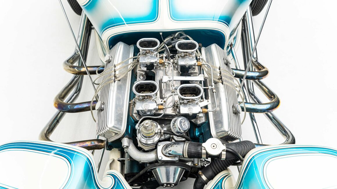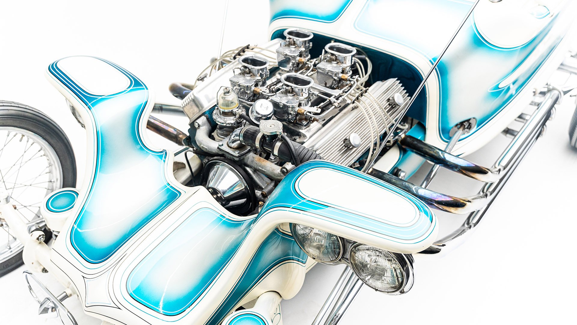 Les phares quadruples d’une Rambler de 1959 en attente d’entretien dans l’Iowa ont été installés à l’avant (Les phares étaient montés sous les ailes dans un anneau spécial). La calandre a été fabriquée à partir d’une partie d’une calandre Chevrolet de 1959 qui semblait abandonnée en rue… et un radiateur DKW d’origine douteuse a été installé pour refroidir l’énorme moteur Cadillac. Des Nerf-bars ont été conçues et installées pour créer un look “dragster” et Larry Watson de Watson’s House of Style a peint gratuitement la voiture pour Ed sur une vague promesse d’un retour de commandes.