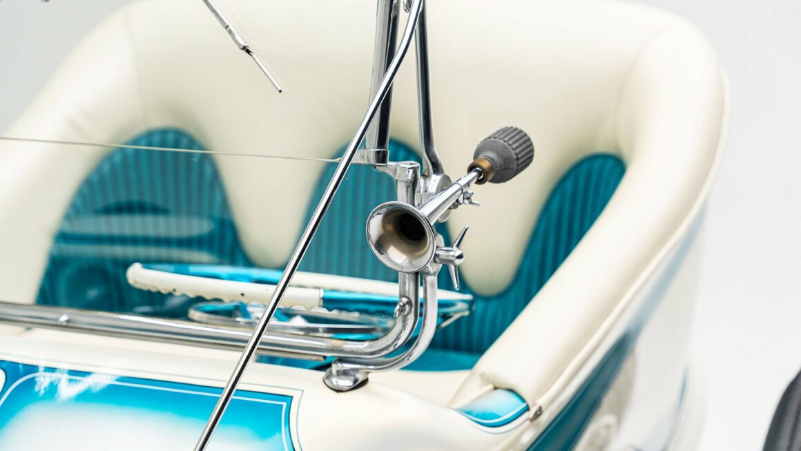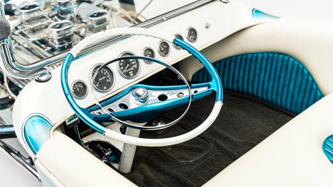 La carrosserie a été peinte en blanc perle avec des panneaux vert bonbon “embués”. À l’intérieur, Ed a installé un volant Chevrolet Impala de 1958 et sept compteurs Stewart-Warner de provenance indéterminable… L’Outlaw, initialement nommé “Excaliber”, a fait ses débuts au “Disneyland Car Club Day and Autocade Show” le 5 septembre 1959. Le nom “Excaliber” venait d’une épée qu’Ed utilisait comme levier de vitesses. L’épée était un souvenir de la guerre d’indépendance qui provenait de la famille de sa belle-mère. Comme personne ne pouvait prononcer le nom de la voiture, il l’a changée en “Outlaw” en’60.