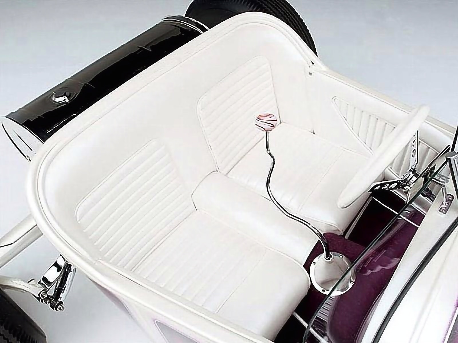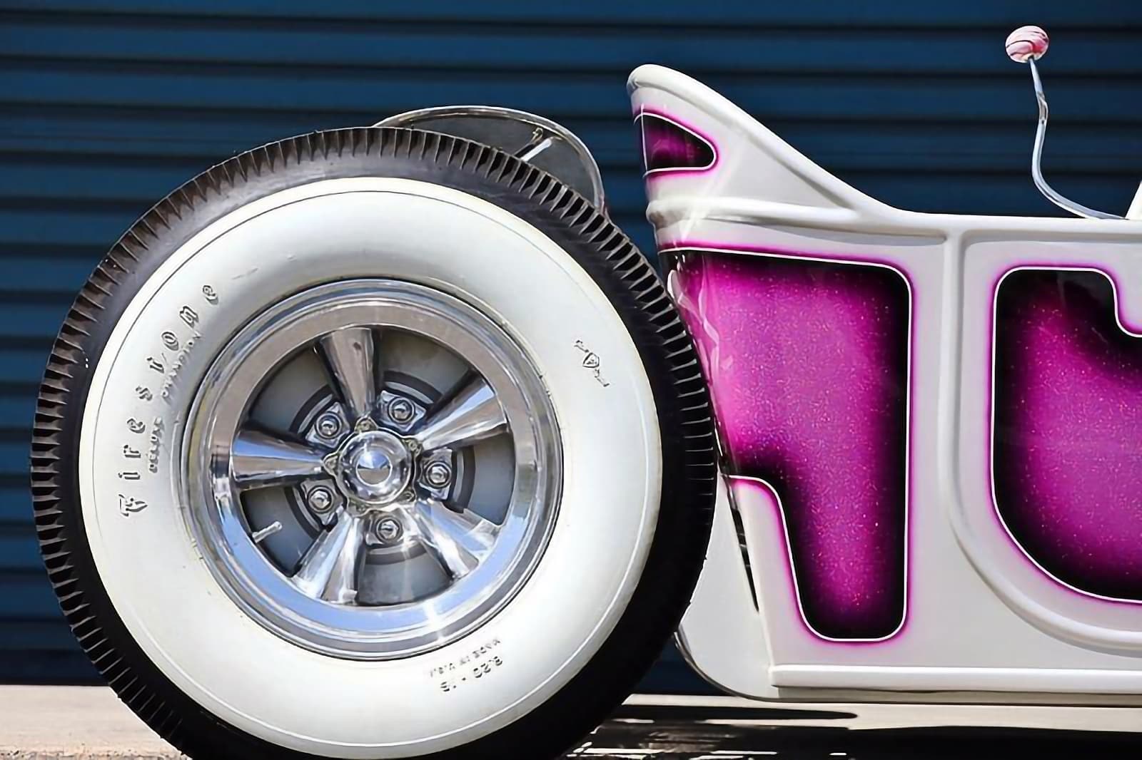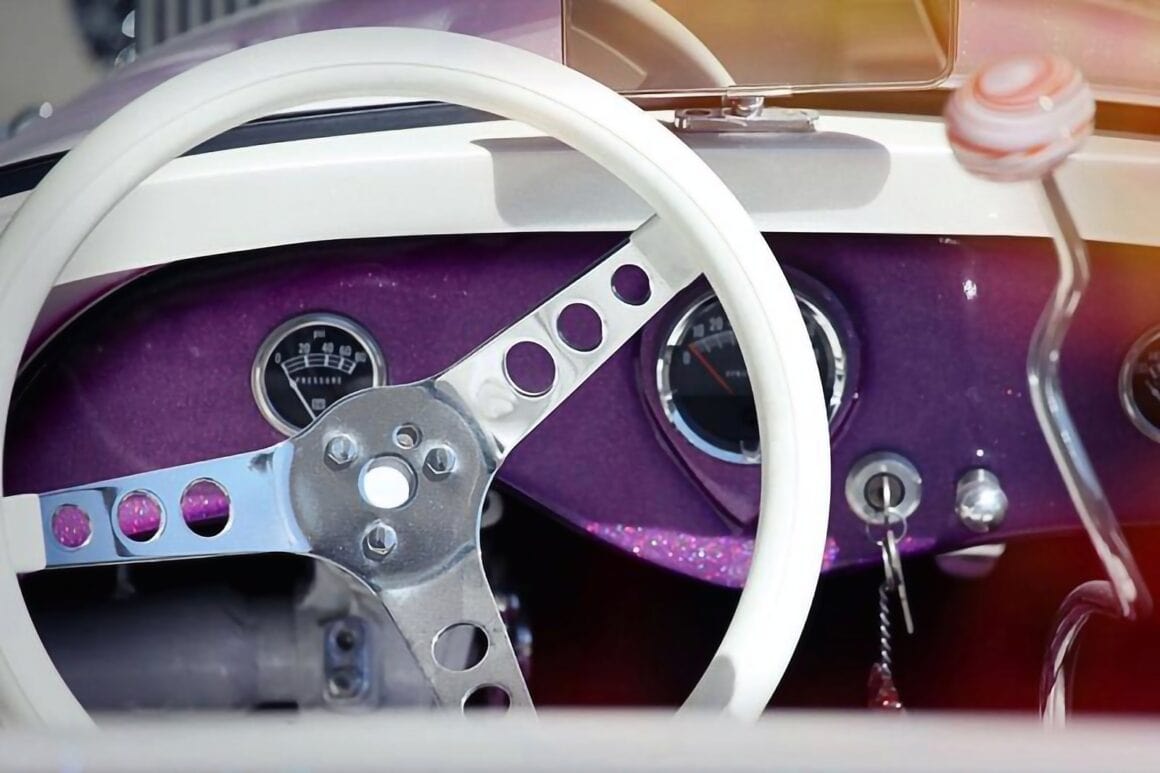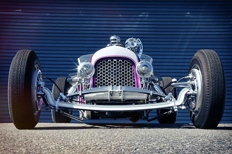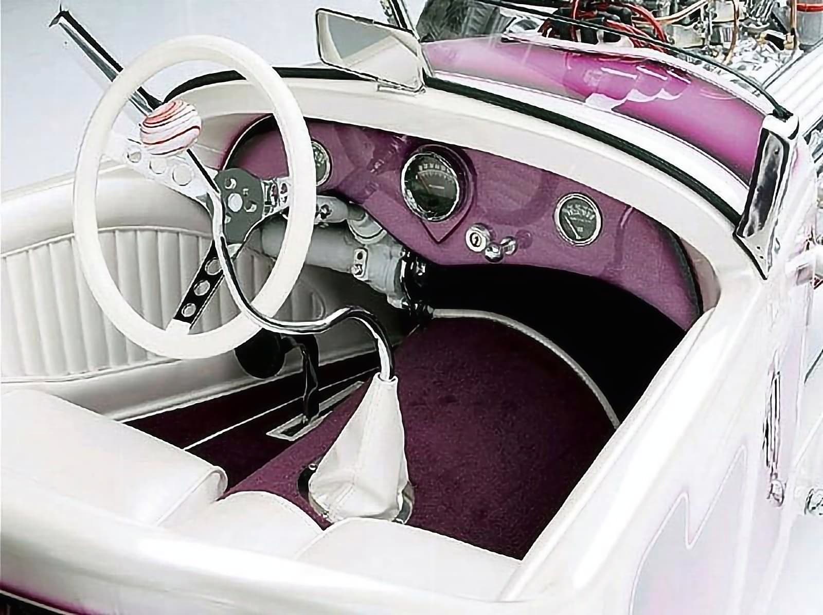 – Croyez-le ou pas, la carrosserie était une épave quand Dan et Tiffany Collins l’ont sauvée d’une quasi-désintégration. Dan et Neil ont changé chaque partie de la ’27 Chevy qui était une 4 portes ! Le Rod est devenu un modèle 2 portes. La calandre du radiateur a été confectionnée au départ d’un avant de ’58 Thunderbird par Boydd Coddington, Californie. C’est Nick O’Teen à Sun Valley, en Californie également, qui a réalisé la peinture sur base d’un perlé-blanc Dupont, avec diverses nuances de pourpre. C’est Willy Downtown à Carson-city, en Californie, qui a réalisé les sièges personnalisés en vinyle blanc-perlé plissé de chez Carpet-Land. La moquette pourpre a été choisie pour s’harmoniser avec les panneaux extérieurs. Le tableau de bord provient d’un camion des années ’20 . Le volant est un Mooneyes, les boulons sont des Tratec, les écrous également. L’huile a été fournie par Trans Oil Rod, l’essence est de l’Exxon spéciale, le pare-brise et les autres vitrages viennent de chez Super-Glas-Fever à Los Angeles, le pédalier est un Pédal-Factory de San Francisco, tandis que les freins Brembo sont gérés par un répartiteur Super Heavy Works d’Atlanta, calibré pour des flexibles Flex-o-net de Talahassee (le listing des fournisseurs et leurs coordonnées se trouvent en fin d’article, découpez le bon et obtenez 5% de remise).