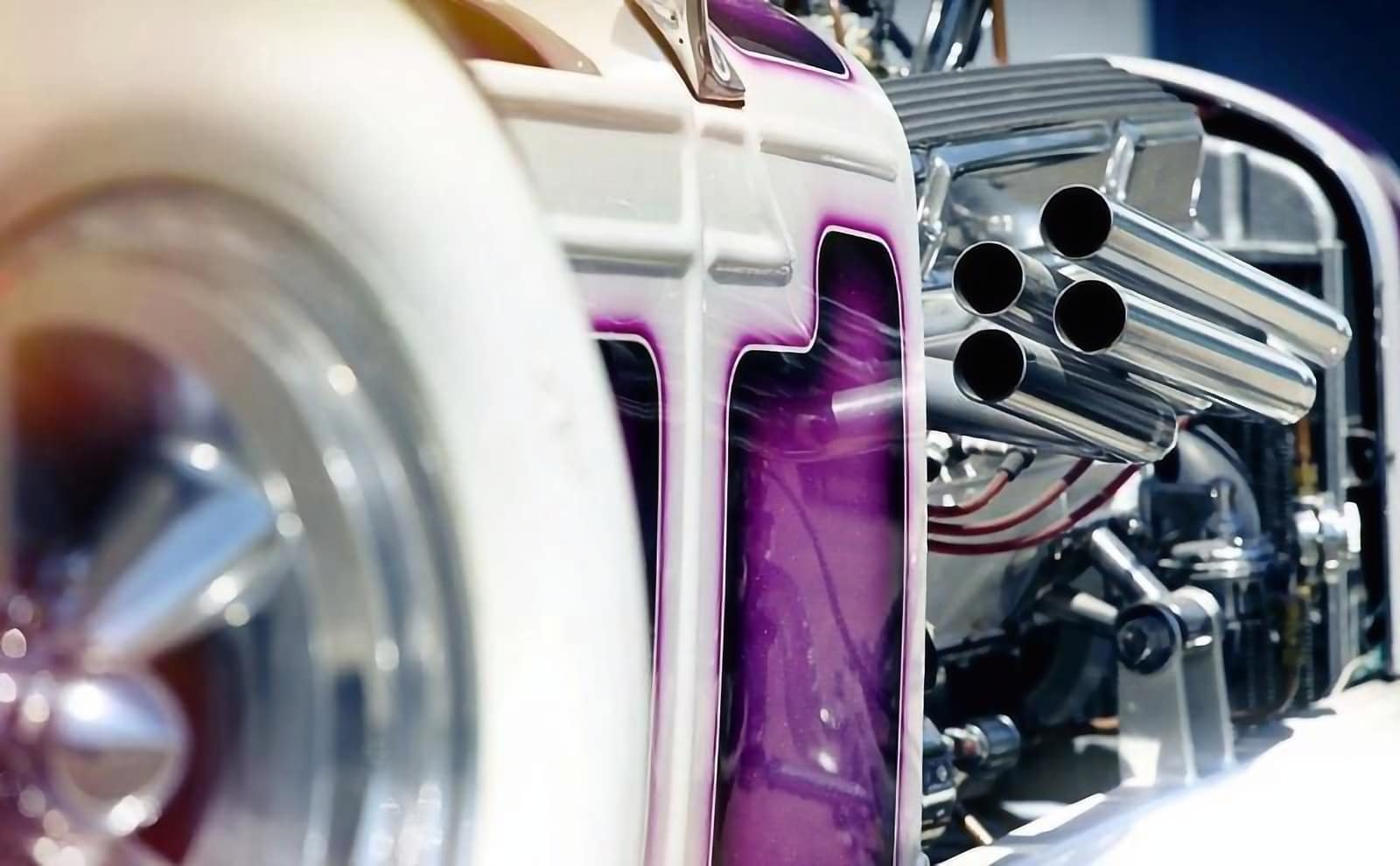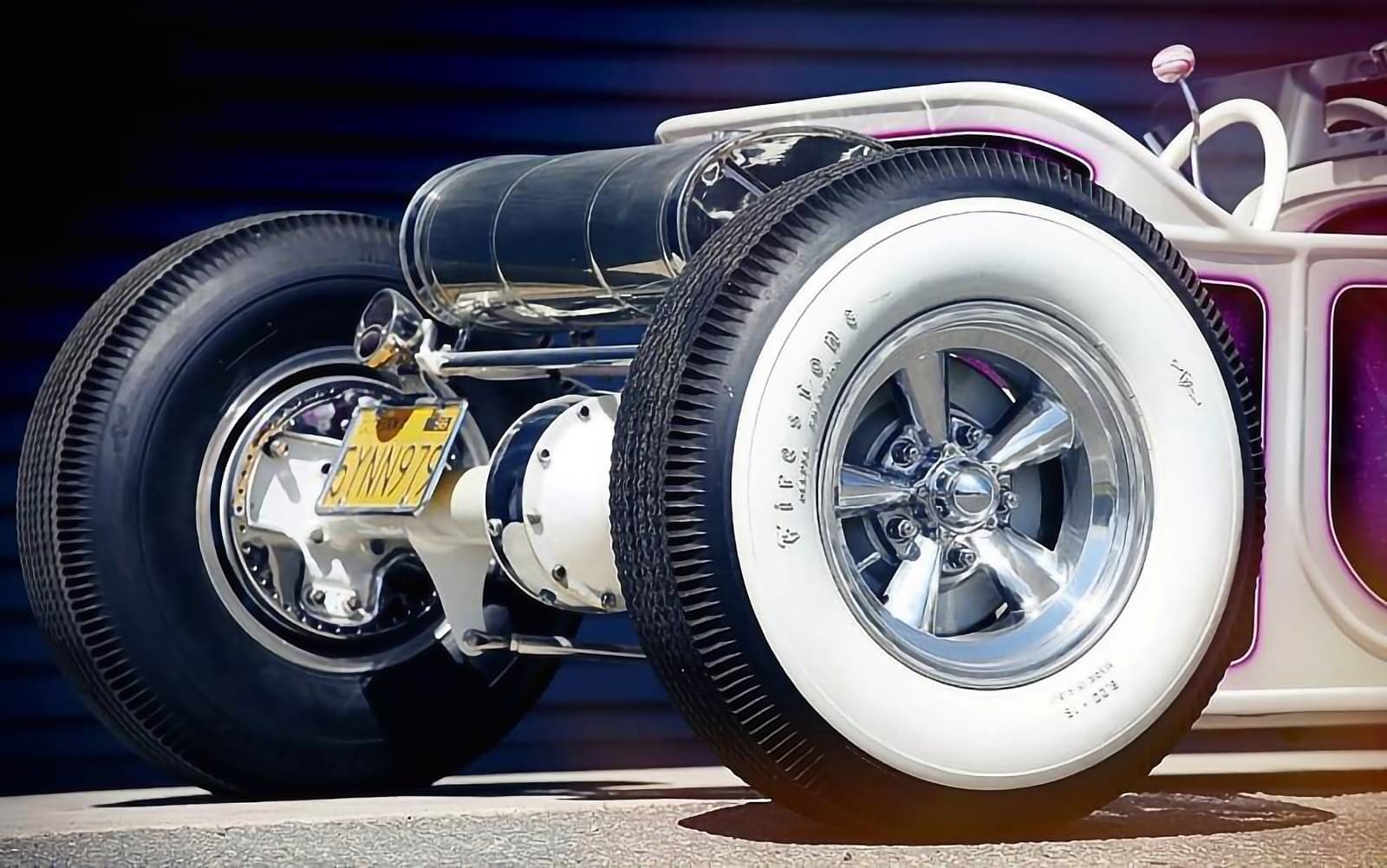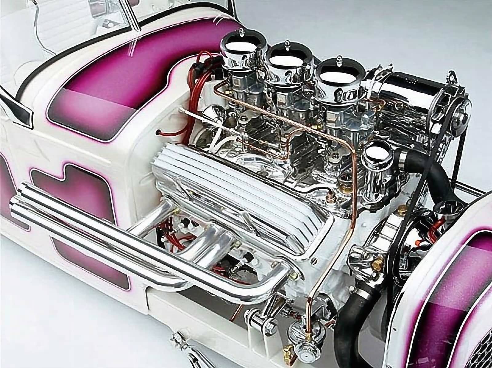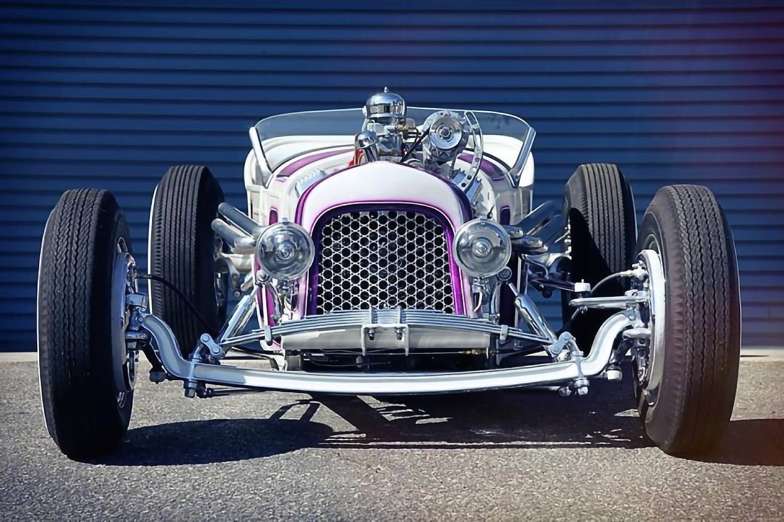 – Croyez-le ou pas, la carrosserie était une épave quand Dan et Tiffany Collins l’ont sauvée d’une quasi-désintégration. Dan et Neil ont changé chaque partie de la ’27 Chevy qui était une 4 portes ! Le Rod est devenu un modèle 2 portes. La calandre du radiateur a été confectionnée au départ d’un avant de ’58 Thunderbird par Boydd Coddington, Californie. C’est Nick O’Teen à Sun Valley, en Californie également, qui a réalisé la peinture sur base d’un perlé-blanc Dupont, avec diverses nuances de pourpre. C’est Willy Downtown à Carson-city, en Californie, qui a réalisé les sièges personnalisés en vinyle blanc-perlé plissé de chez Carpet-Land. La moquette pourpre a été choisie pour s’harmoniser avec les panneaux extérieurs. Le tableau de bord provient d’un camion des années ’20 . Le volant est un Mooneyes, les boulons sont des Tratec, les écrous également. L’huile a été fournie par Trans Oil Rod, l’essence est de l’Exxon spéciale, le pare-brise et les autres vitrages viennent de chez Super-Glas-Fever à Los Angeles, le pédalier est un Pédal-Factory de San Francisco, tandis que les freins Brembo sont gérés par un répartiteur Super Heavy Works d’Atlanta, calibré pour des flexibles Flex-o-net de Talahassee (le listing des fournisseurs et leurs coordonnées se trouvent en fin d’article, découpez le bon et obtenez 5% de remise).