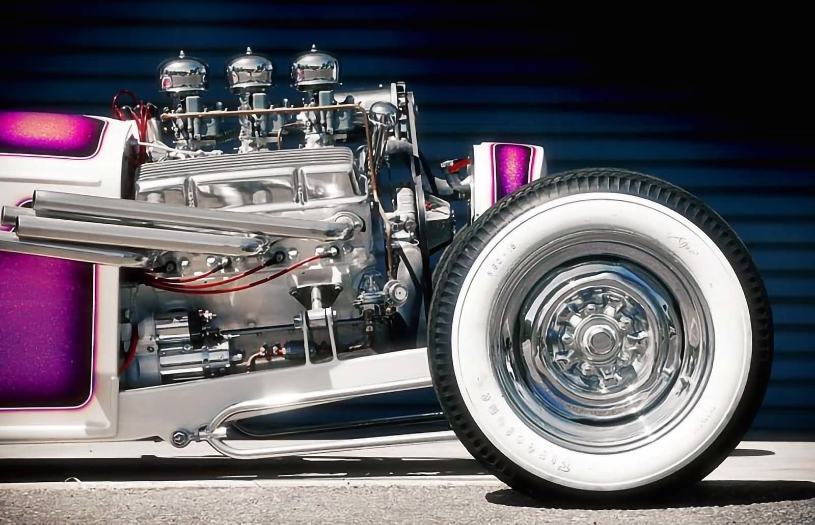 – Le châssis handbuilt est aussi impressionnant que le moteur, la carrosserie et l’intérieur. Dan et Tiffany Collins se sont fait aider par John McLutz patron de Body-Top un garage spécialisé en transformations automobiles situé à Boston, et ils ont conçu et construit le châssis-cadre en tubes de 2×4 pouces fourni par Big-Metal Works de Santa-Ana, pour faire correspondre les contours de la carrosserie. Le moteur est un small bloc Chevy 283ci récupéré d’un Limelight ’38 Ford pick-up, refait par la société V8-Forever de Washington, il y a quelques années, monté avec trois 94’s Holley avec des cloches à air de chez Stelling & Hellings, montés sur une pipe Offenhauser polie par Fun-Metal-Craft de Los Angeles. Les radiateurs d’huile et d’eau sont des Burbank’s, la distribution est une Pertronix… Trans-Shop-Pop a modifié une boîte auto 350 équipée d’un shif-geat B&M. Les jantes en 15×7 American Racing TTO cinq rayons à l’arrière, sont en contraste avec les Steelies 15×5 chromées à l’avant. Les pneus sont des Firestone 8.20×15 et 5.60×15 (le listing des fournisseurs et leurs coordonnées se trouvent en fin d’article, découpez le bon et obtenez 5% de remise).