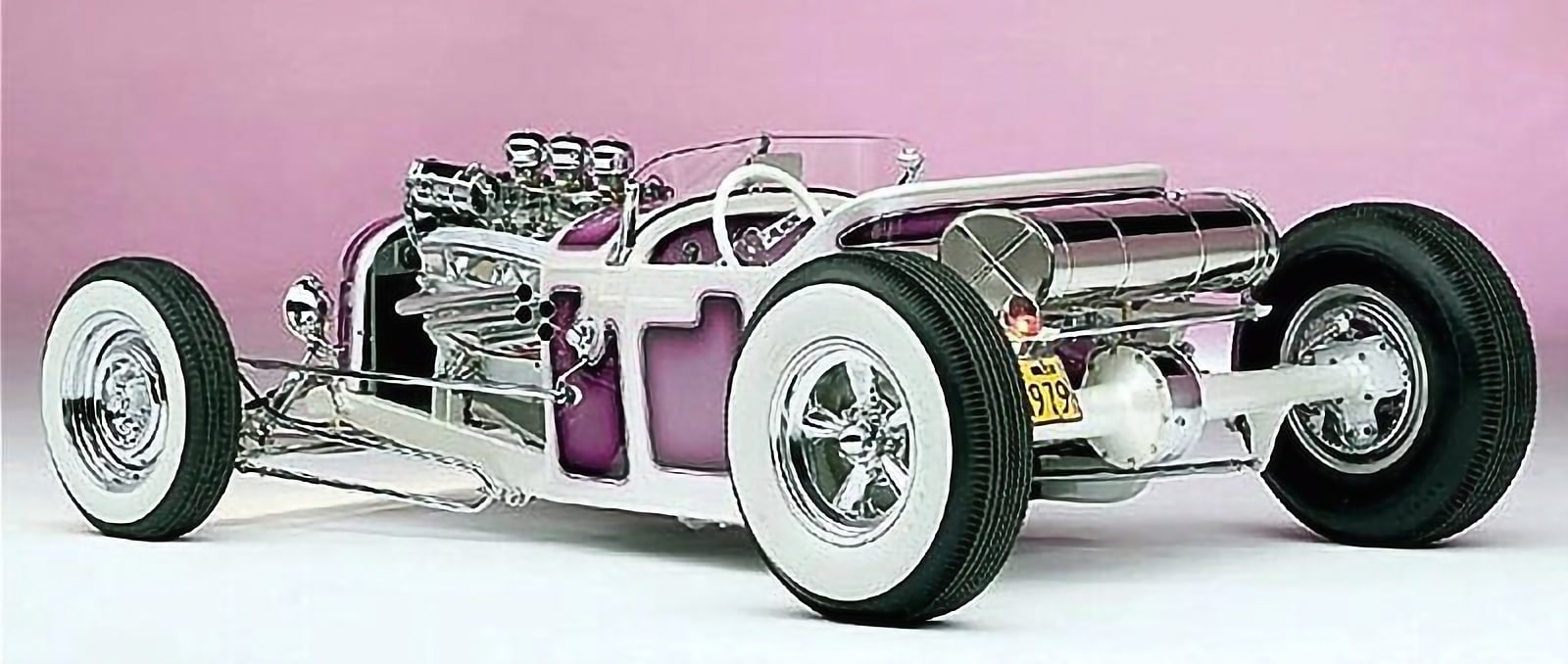 Soyons honnêtes : le corrélât est d’une telle intensité qu’elle (l’intensité, pas le corrélât), ne peut décemment pas être maintenue durant le temps nécessaire à la lecture de cet article… Certes, c’est un peu décevant… mais d’un autre côté, ce n’est pas un mal en soit ! Qui accepterait en effet de ne pouvoir lire tout ceci que dans le périmètre immédiat d’une unité d’urgence cérébrovasculaire ? Le rythme de mes mots et phrases va donc tranquillement redescendre jusqu’à connaître un dosage plus “planplan” en ce milieu, avec une perte malheureuse de sa dimension space-opéra, avant de conclure en une beauté apocalyptique.. Mais oh ! N’allez pas pour autant croire que je m’ennuie. Mais revenons-en donc à cet engin… Sachez que le magazine de Hot-Rod qui a quasi inventé le concept “Dan et Tiffany Collins”, n’était pas dupe quant à la qualité artistique de ce qu’il proposait, affichant sans complexe sa volonté de faire plaisir à ses lecteurs, alors que comme je n’en ai rien à f… de tripper sur les concepts les plus fumeux, je préfère m’amuser à soulever les voiles en détruisant systématiquement (s’il le faut) tout ce qui est construit sur du sable… Quel sacerdoce… Bref, cela ne peut que renforcer l’éminente sympathie que l’on ressent pour Dan et Tiffany Collins et leur Hot-Rod loufoque…