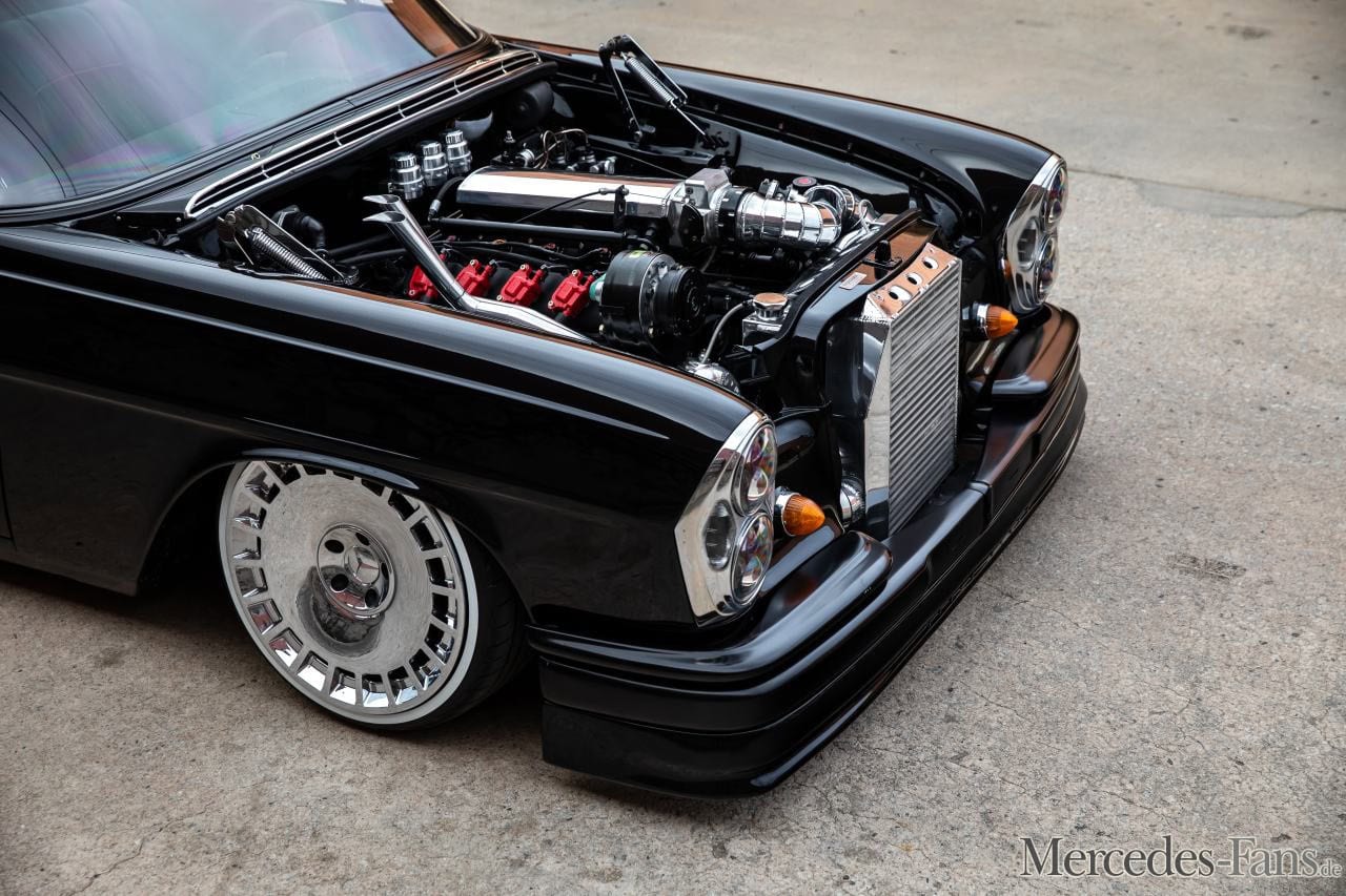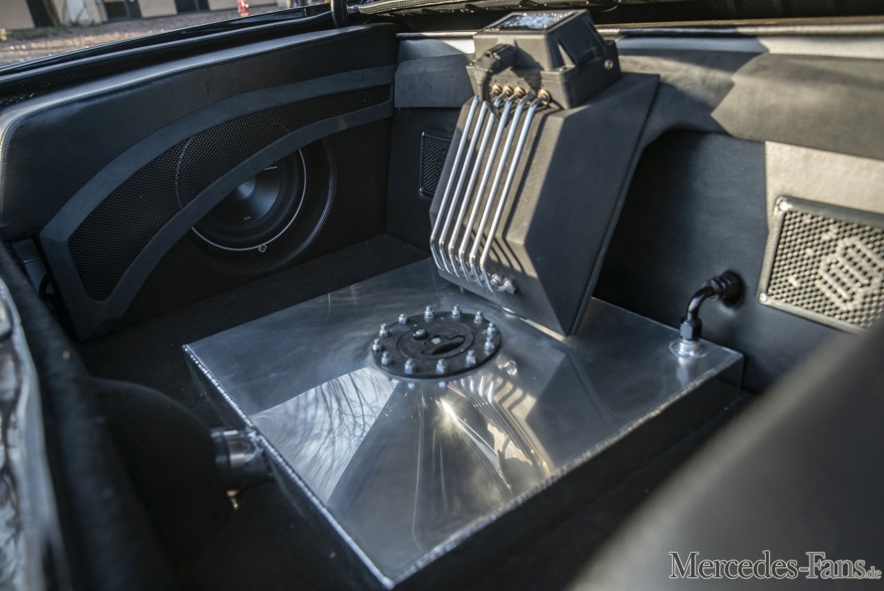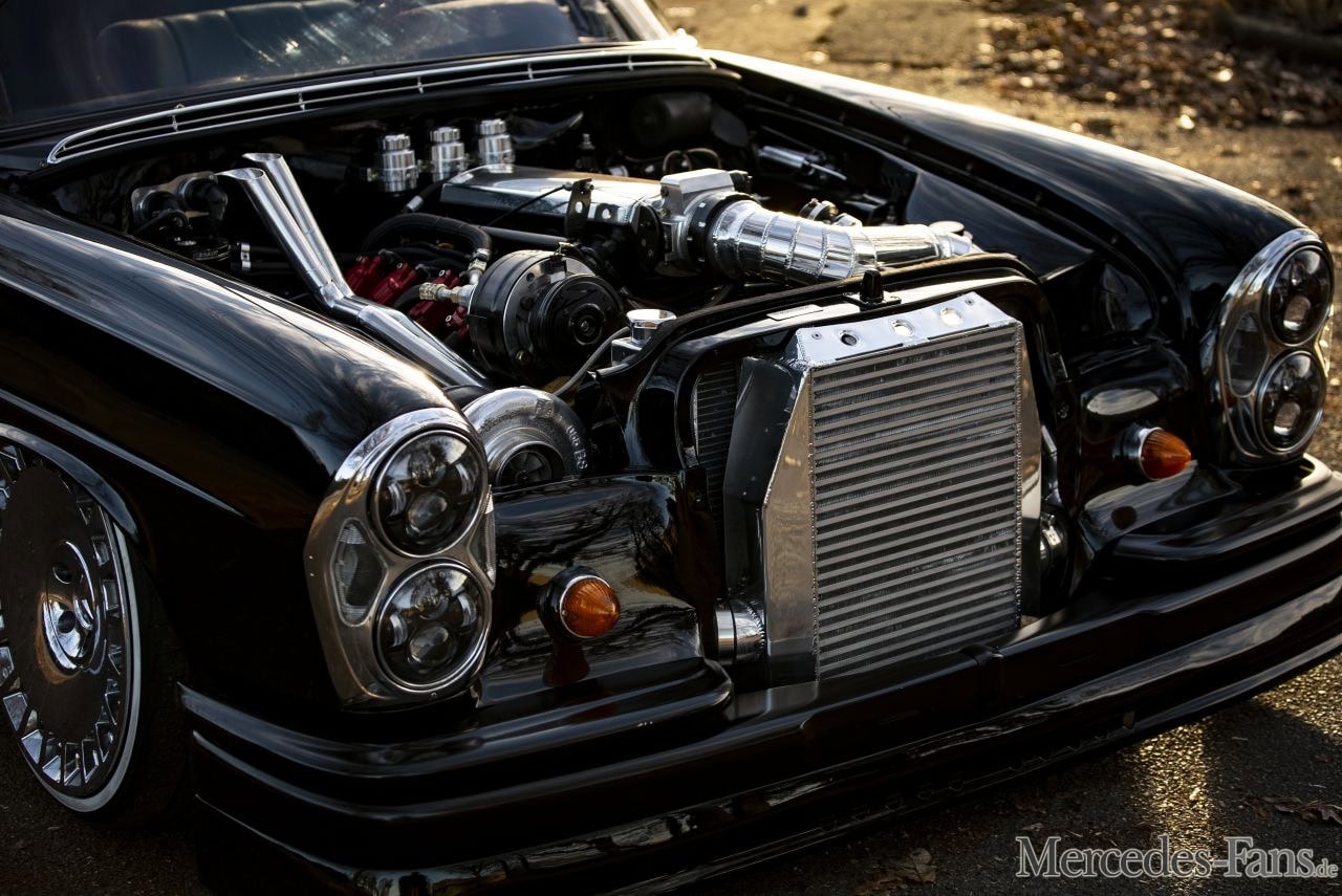 Vous n’avez pas besoin de quelque chose comme ça ici. L’omission du capot moteur ne signifie pas une perte, mais un gain considérable dans l’esthétique du genre extraordinaire. La source d’énergie de la W108 est un V8 Chevrolet LS de 5L3 qui est surcompréssé par un énorme turbocompresseur Borg-Warner S366. Puissance estimée de l’ensemble : environ 650cv. D’ailleurs, une transmission T56 Borg-Warner à 6 vitesses fait office de centre de contrôle. Les hauts et les bas de ce Hot-Rod-Benz sont contrôlés par une suspension pneumatique d’Air-Lift-Performance.