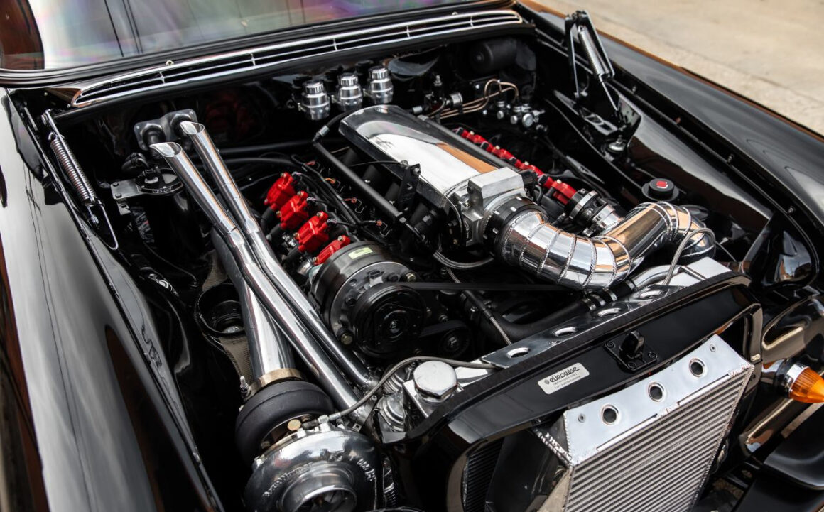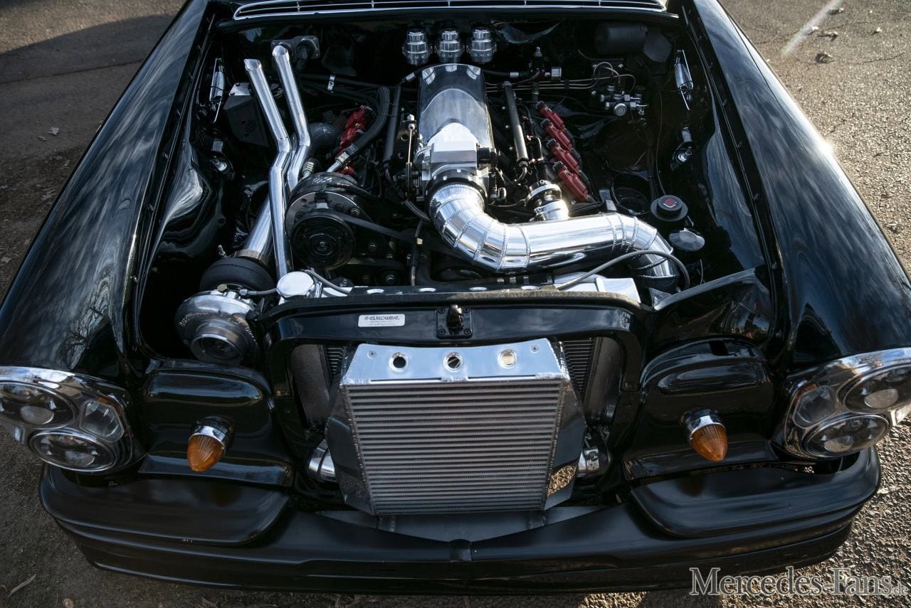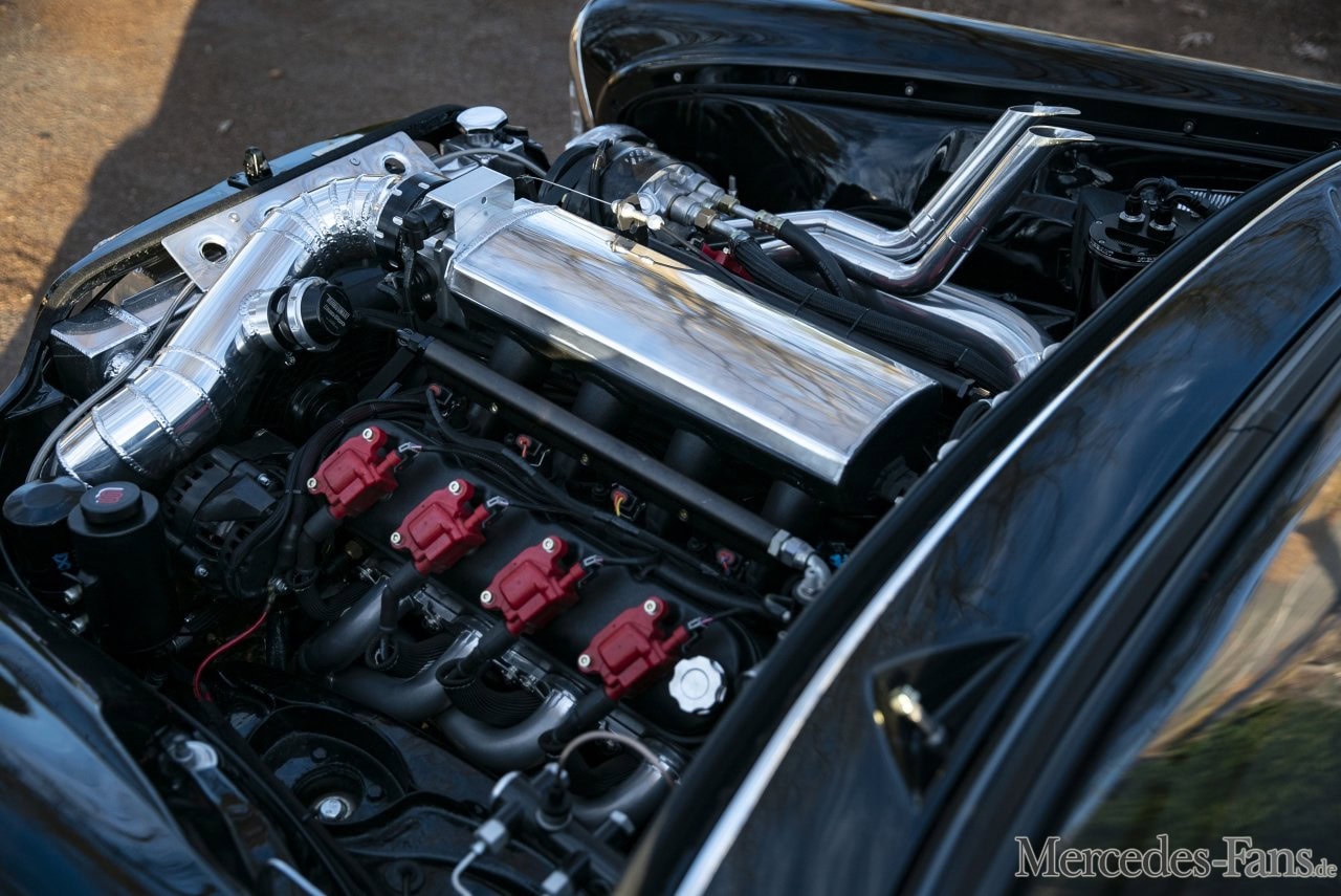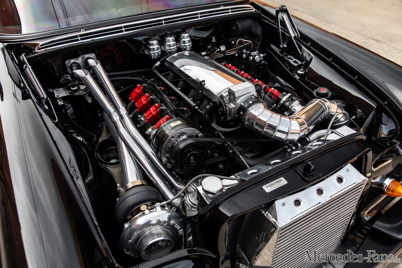 Vous n’avez pas besoin de quelque chose comme ça ici. L’omission du capot moteur ne signifie pas une perte, mais un gain considérable dans l’esthétique du genre extraordinaire. La source d’énergie de la W108 est un V8 Chevrolet LS de 5L3 qui est surcompréssé par un énorme turbocompresseur Borg-Warner S366. Puissance estimée de l’ensemble : environ 650cv. D’ailleurs, une transmission T56 Borg-Warner à 6 vitesses fait office de centre de contrôle. Les hauts et les bas de ce Hot-Rod-Benz sont contrôlés par une suspension pneumatique d’Air-Lift-Performance.