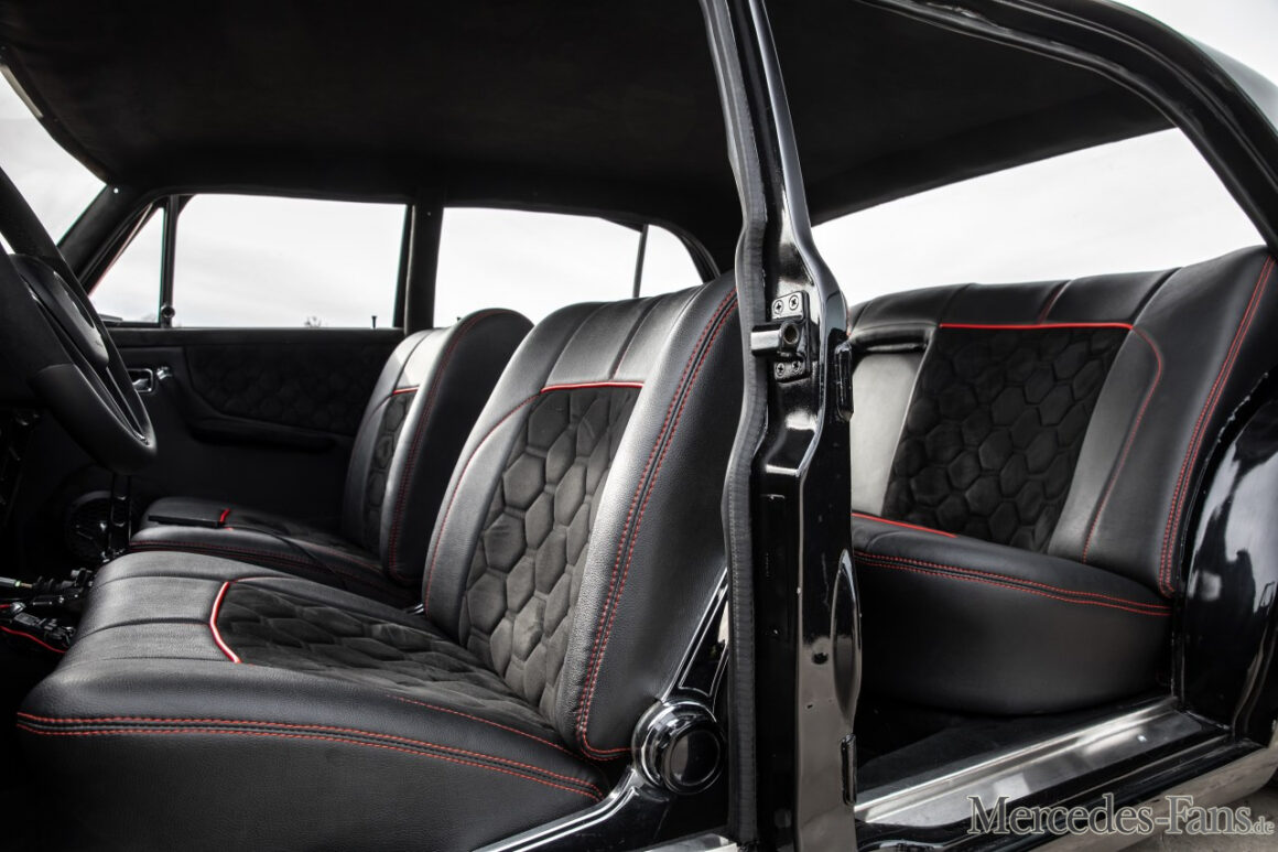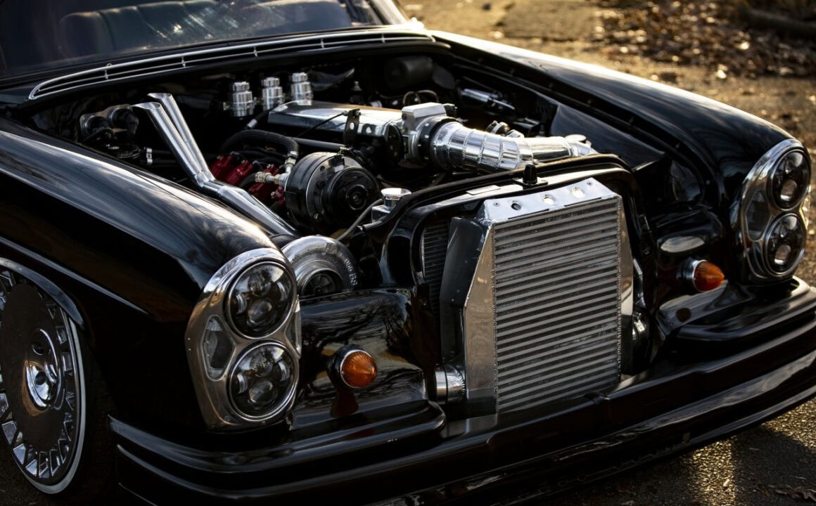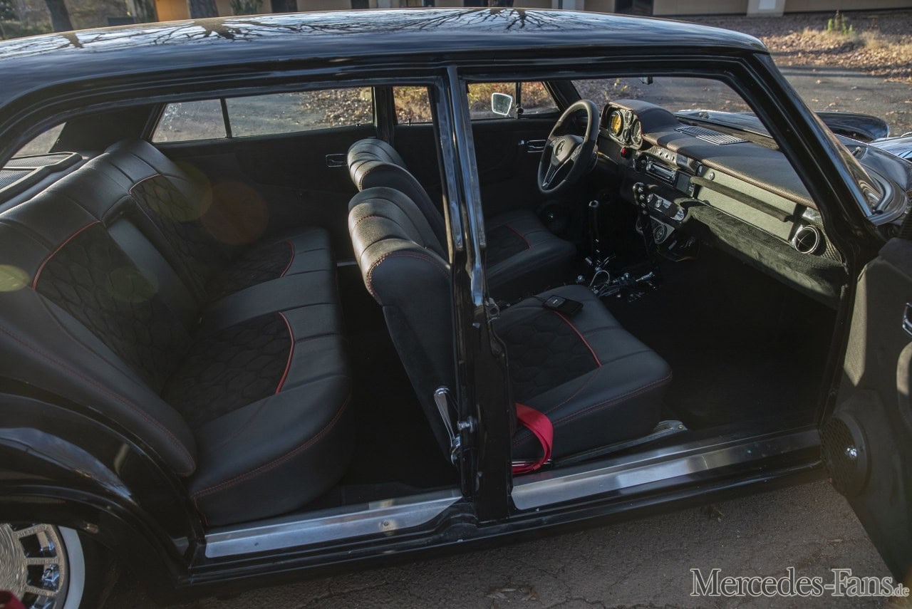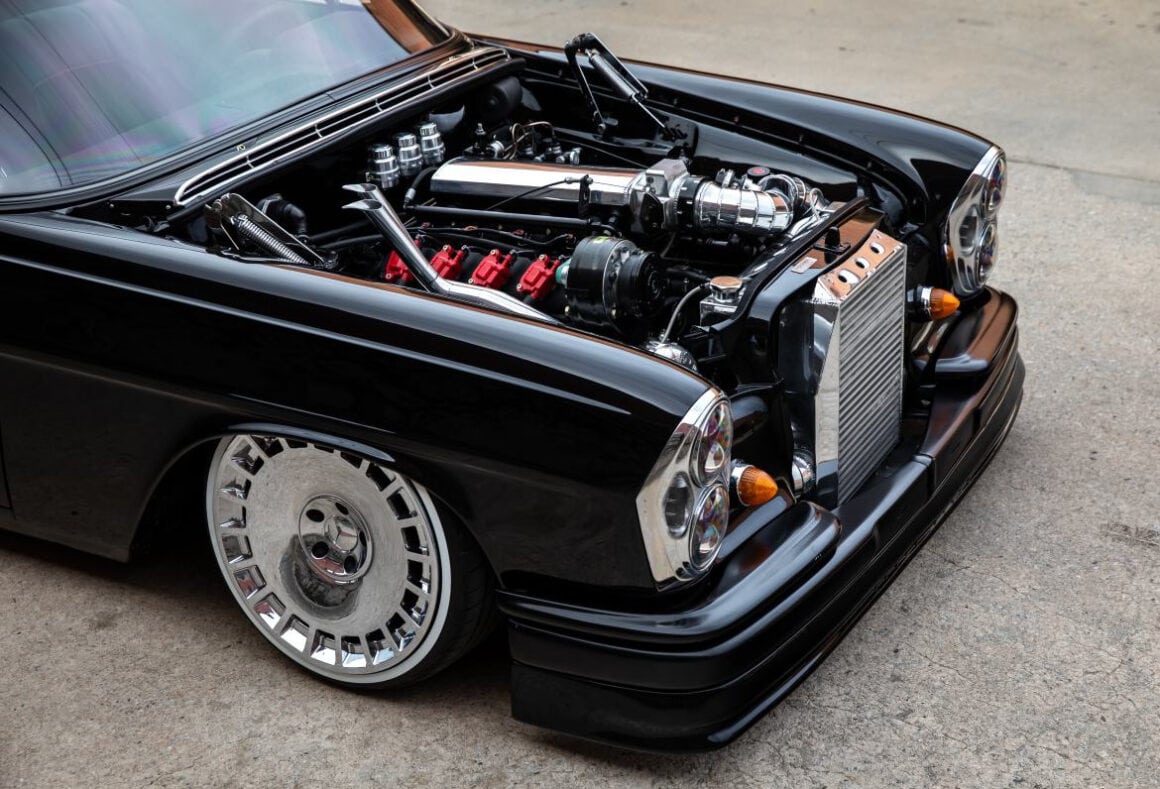 Il a même remporté la moitié de la bataille pour le facteur “wow !” de la carrosserie. Pour parfaire le look tueur, Mike a décidé d’équiper la Benz de portes suicides. Cependant, cela s’est avéré un peu délicat, car des charnières spéciales étaient nécessaires à l’arrière des portes arrière et un nouveau mécanisme de verrouillage a dû être installé à l’avant. Les ampoules de phares d’origine de la Mercedes W108 ont été équipées de quatre phares/projecteurs pour élever la qualité de la lumière à un niveau contemporain.