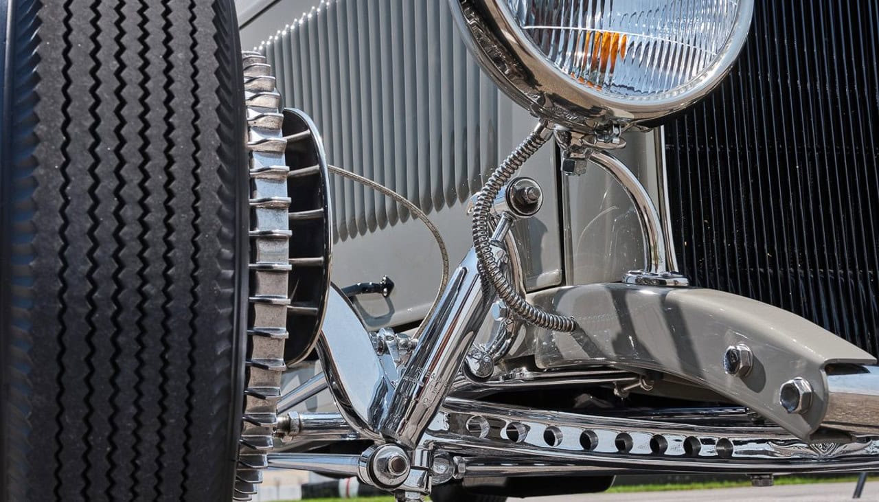 Mais parfois plus important encore, il sert de motivateur… Le propriétaire de ce Hot Rod, Chad Adams, d’Adams Hot Rod Shop, a rempli tous ces rôles sur le roadster Ford Highboy 1932 de Shane Wright, une voiture qui a nécessité trois décennies de planification et seulement neuf mois pour être terminée. “J’achète des pièces depuis 1991 pour construire cette voiture”, explique Shane… “J’ai travaillé un peu au fil des ans, puis j’ai arrêté de roder pendant un moment. Mon père est décédé il y a trois ans. Je connaissais Chad et je l’ai appelé au sujet d’une autre voiture. Il m’a demandé si j’avais encore les pièces de 32 et a dit qu’il les construirait pour moi, alors nous y voilà”. Les Hot Rods Deuce sont un territoire familier pour Adams, il a donc pu modifier rapidement le châssis et l’assembler avec un essieu Super Bell abaissé et percé de toud-trous, des épingles à cheveux Pete & Jakes et une suspension arrière à quatre barres triangulaires.