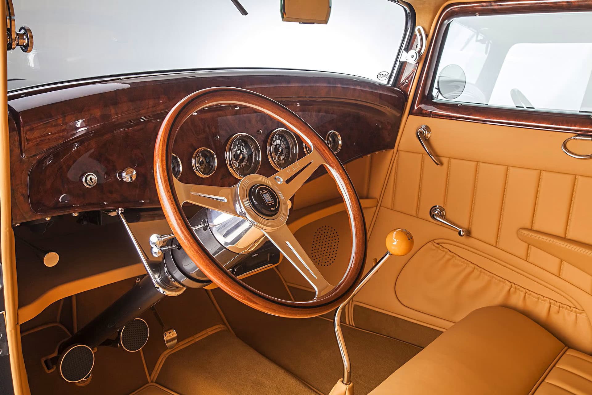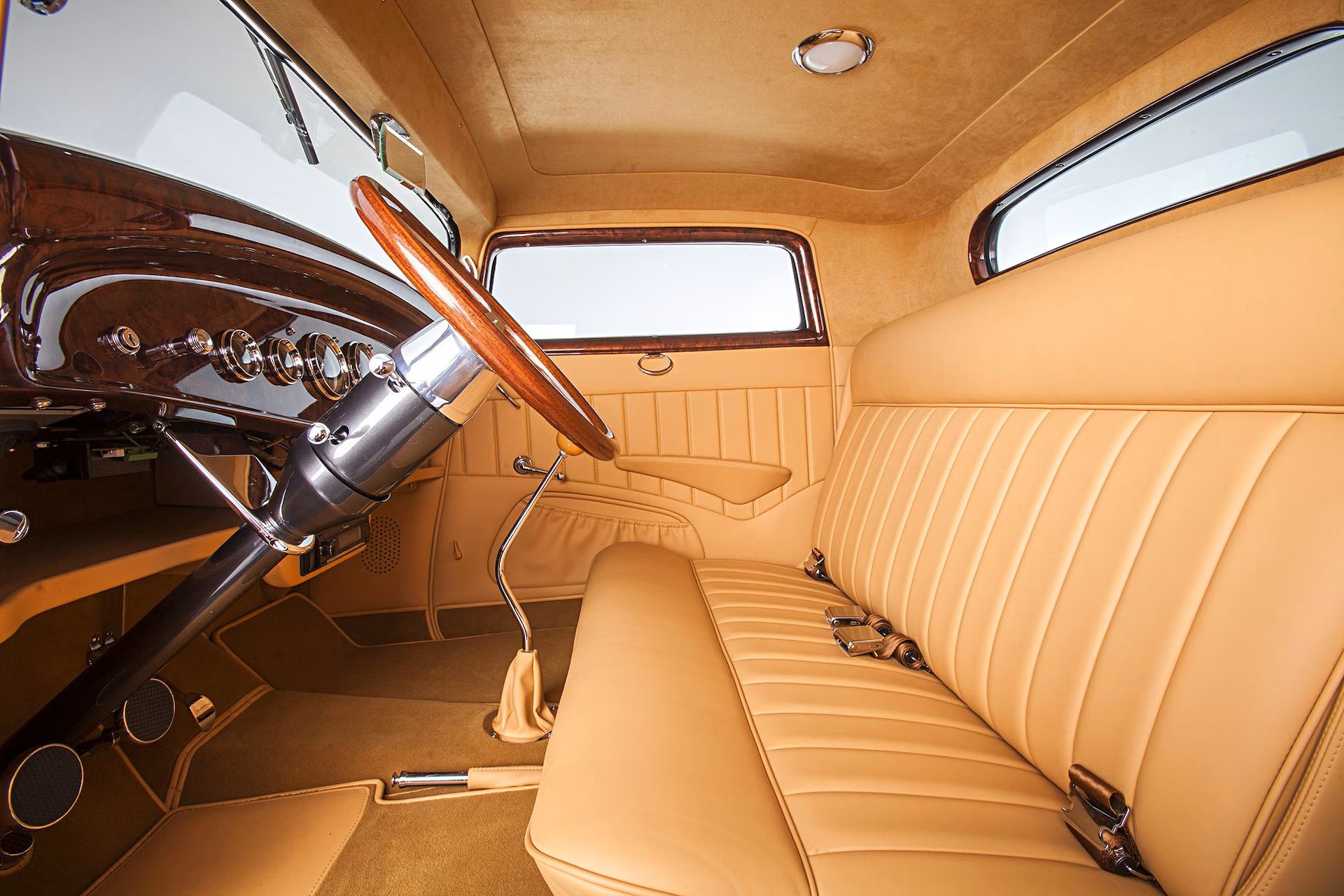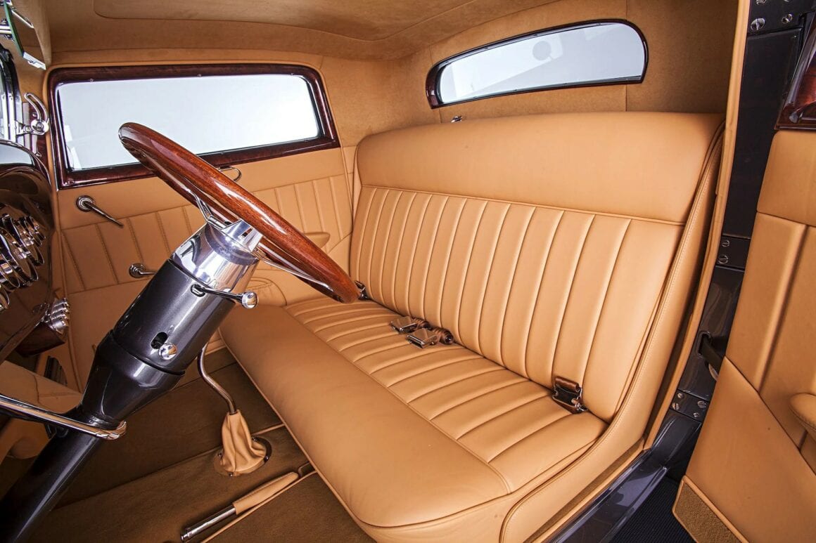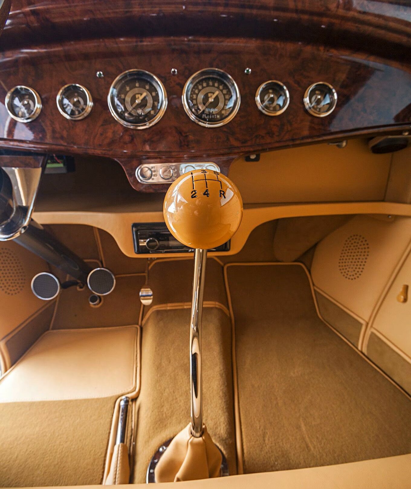 De plus un arbre de transmission venant de San Leandro, en Californie, relie une transmission à cinq vitesses Tremec TKO 600 équipée d’un levier de vitesses Lokar avec une surmultiplication de 0,64 à la cinquième vitesse. Le système de refroidissement se compose d’un radiateur Walker en laiton et à ailettes en cuivre avec une pompe à eau Ford d’origine assistée d’un ventilateur électrique Cooling Components. Un alternateur Powermaster à ampérage élevé achemine le jus de 12 V à travers un faisceau de câbles personnalisé de Jim Vickery pour répondre à toutes les demandes électriques. En regardant à travers un pare-brise et une vitre homologués DOT de Bob’s Classic Auto Glass de Blachly, dans l’Oregon, on découvre l’aménagement intérieur.