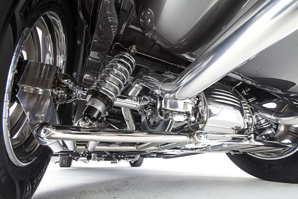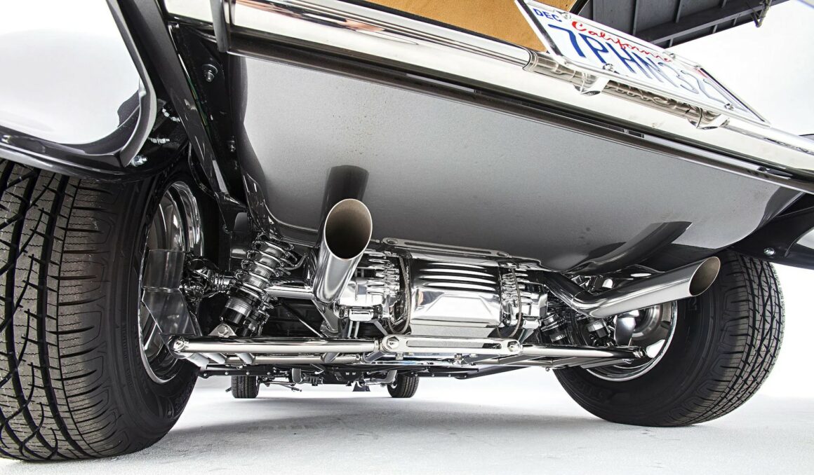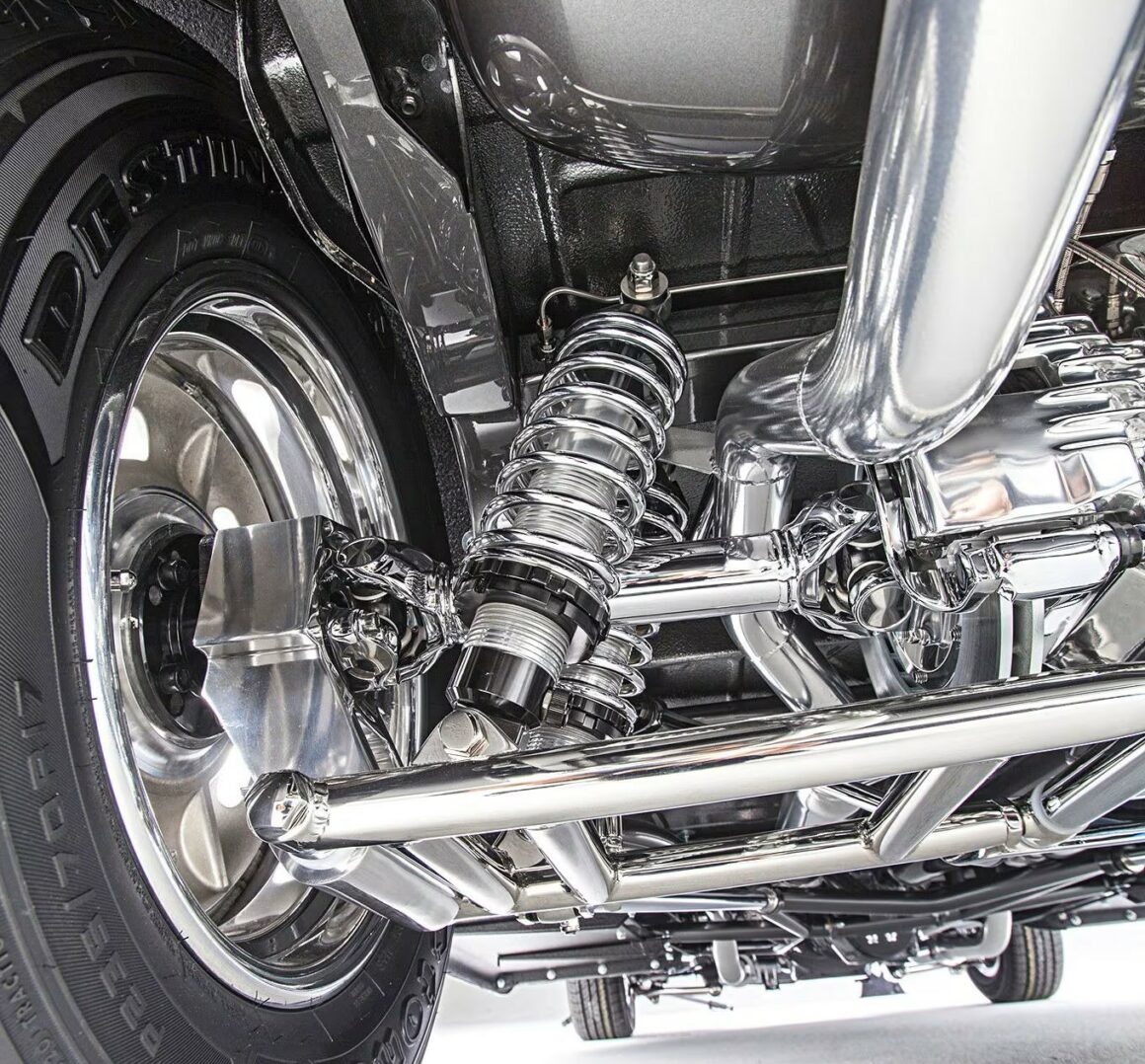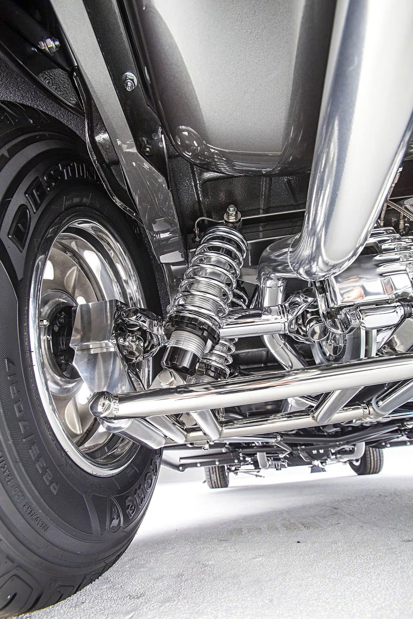 Tous ont atteint Roy Brizio Street Rods dans le sud de San Francisco, prêts pour les étapes sur mesure. Pour ce qui est du ’32 noir ici illustré d’Eric Clapton, à l’avant de la traverse centrale tubulaire Brizio fabriquée sur mesure, la suspension avant est l’IFS de Kugel Komponents avec une barre antiroulis Kugel. Les caractéristiques modernes de direction rapide sont obtenues grâce à une direction à crémaillère guidée par un volant à jante en bois Nardi au sommet d’une colonne inclinable iddit. Les pédales de Pete & Jake poussent un maître-cylindre Wilwood à travers des lignes en acier inoxydable poli. Les freins à disque avant sont des Wilwood. La configuration Kugel IRS avec freins à disque intérieurs dispose d’un différentiel Strange de 9 pouces en 3,70 et glissement limité.