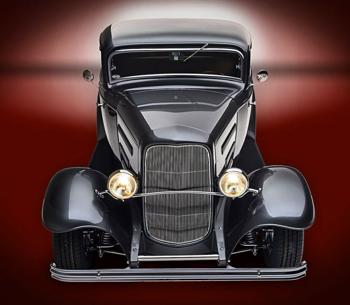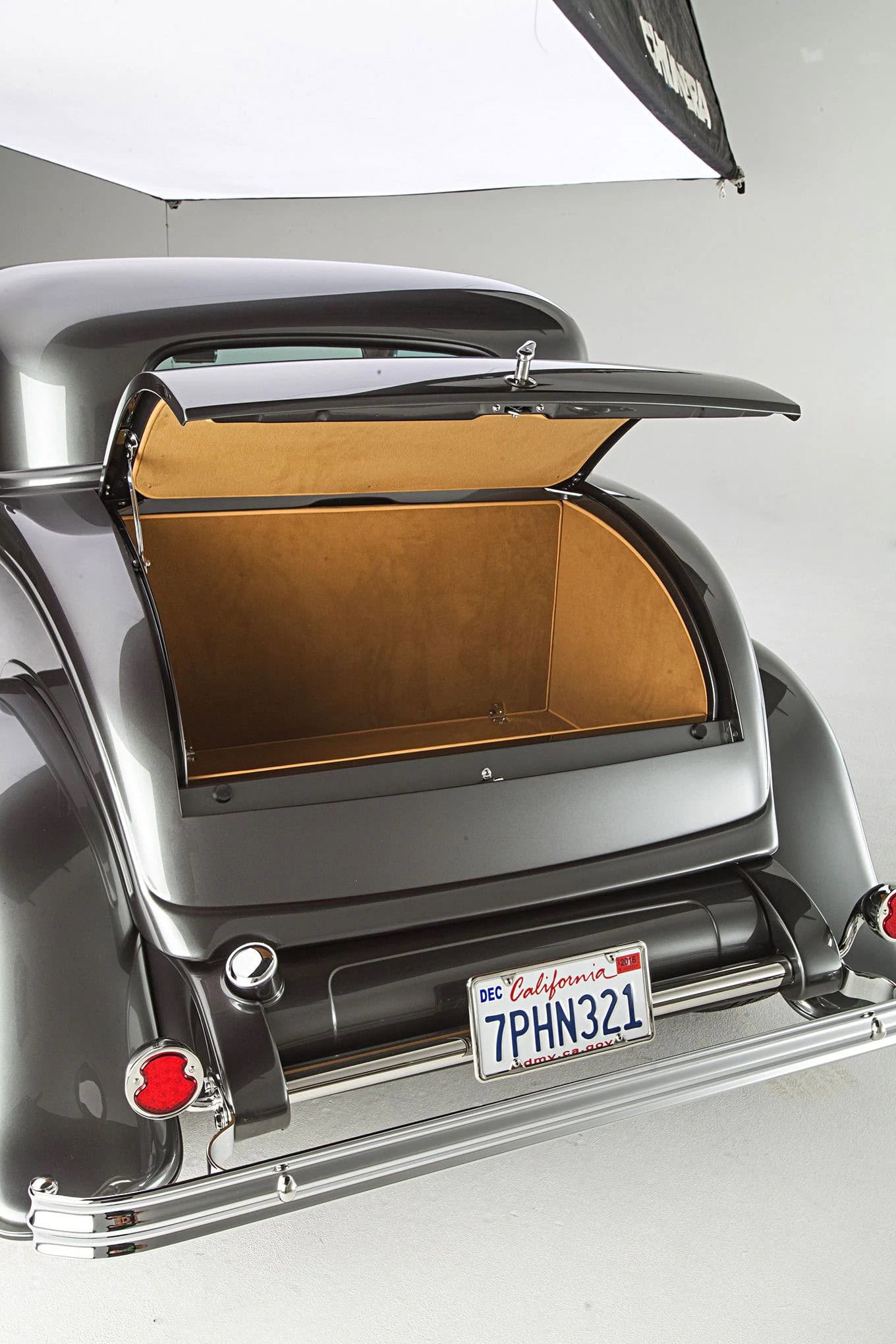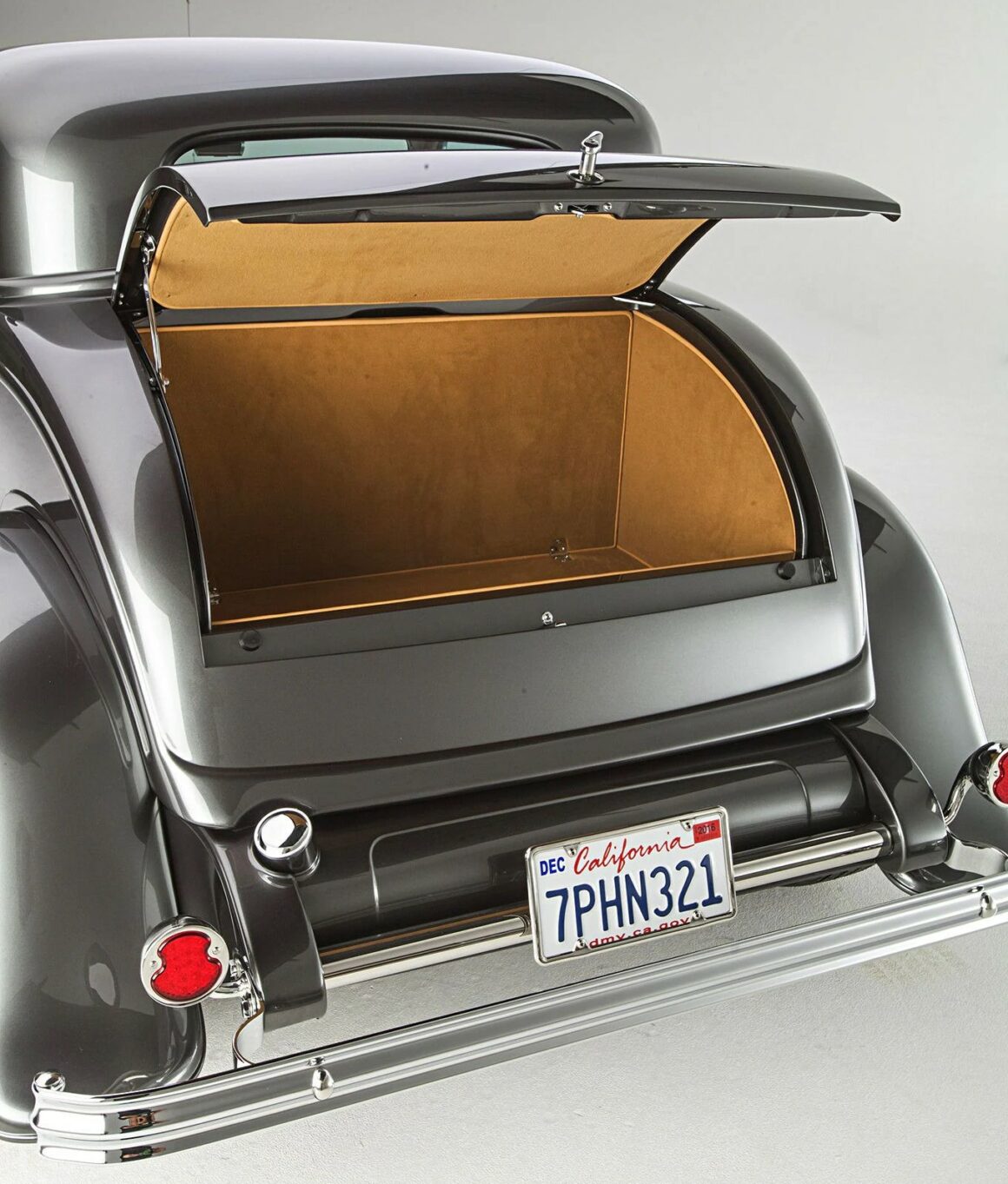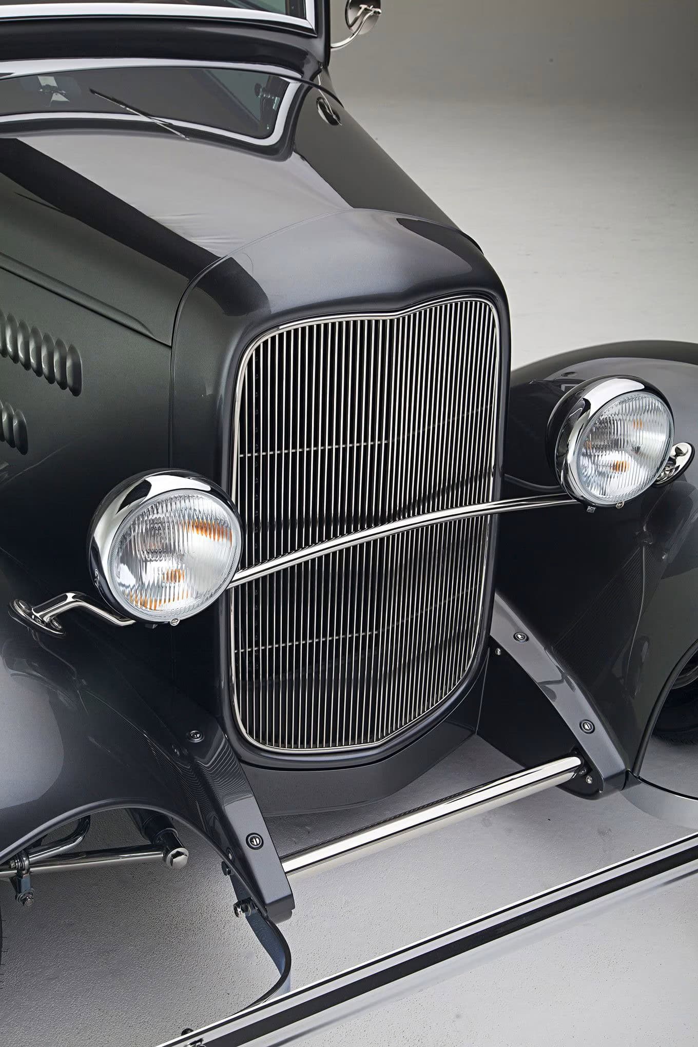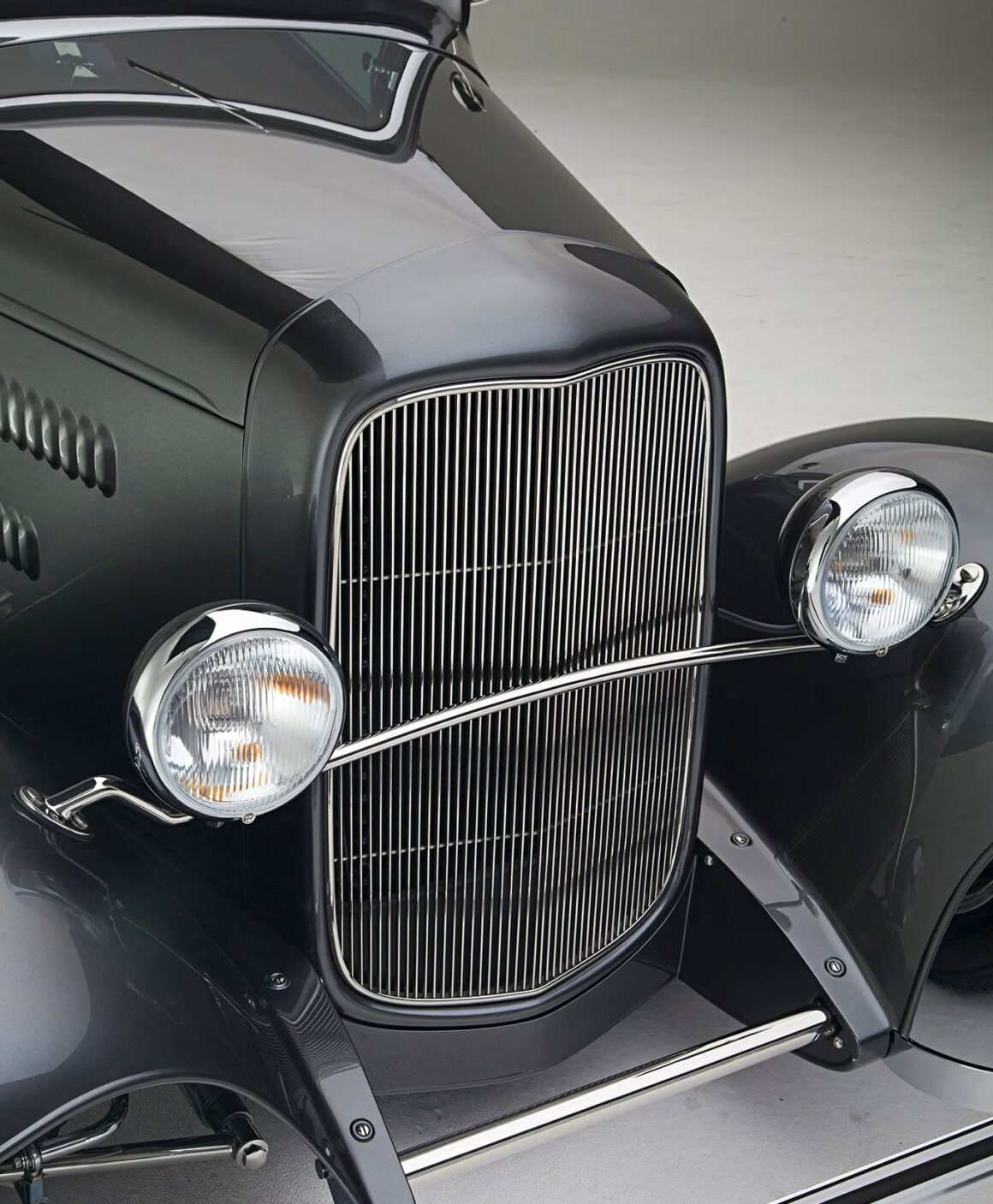 Pour les pneus et les jantes boulonnées à l’avant 15×6 E-T Sebring à lèvre polie avec un espace arrière de 3 pouces, sont chaussées de radiaux Firestone P195/65R15. Les galets arrière sont des jantes boulonnées 17×7 E-T Sebring avec un espace arrière de 3 pouces insérés dans une paire de gros radiaux Firestone P235/70/R17. La carrosserie à trois fenêtres en acier du coupé Deuce d’Eric Clapton est une Brookville avec une “côtelette” de 3 1/2 pouces tranchée par les artisans de Brizio : Jack Stratton et Andrik Albor. Après le Top-Chop supérieur, une feuille d’acier a été façonnée pour se conformer et soudée pour remplir le toit. Le capot en alu de Jack Hagemann est doté d’une coque de radiateur Brookville insérée dans une grille en inox Dan Fink.