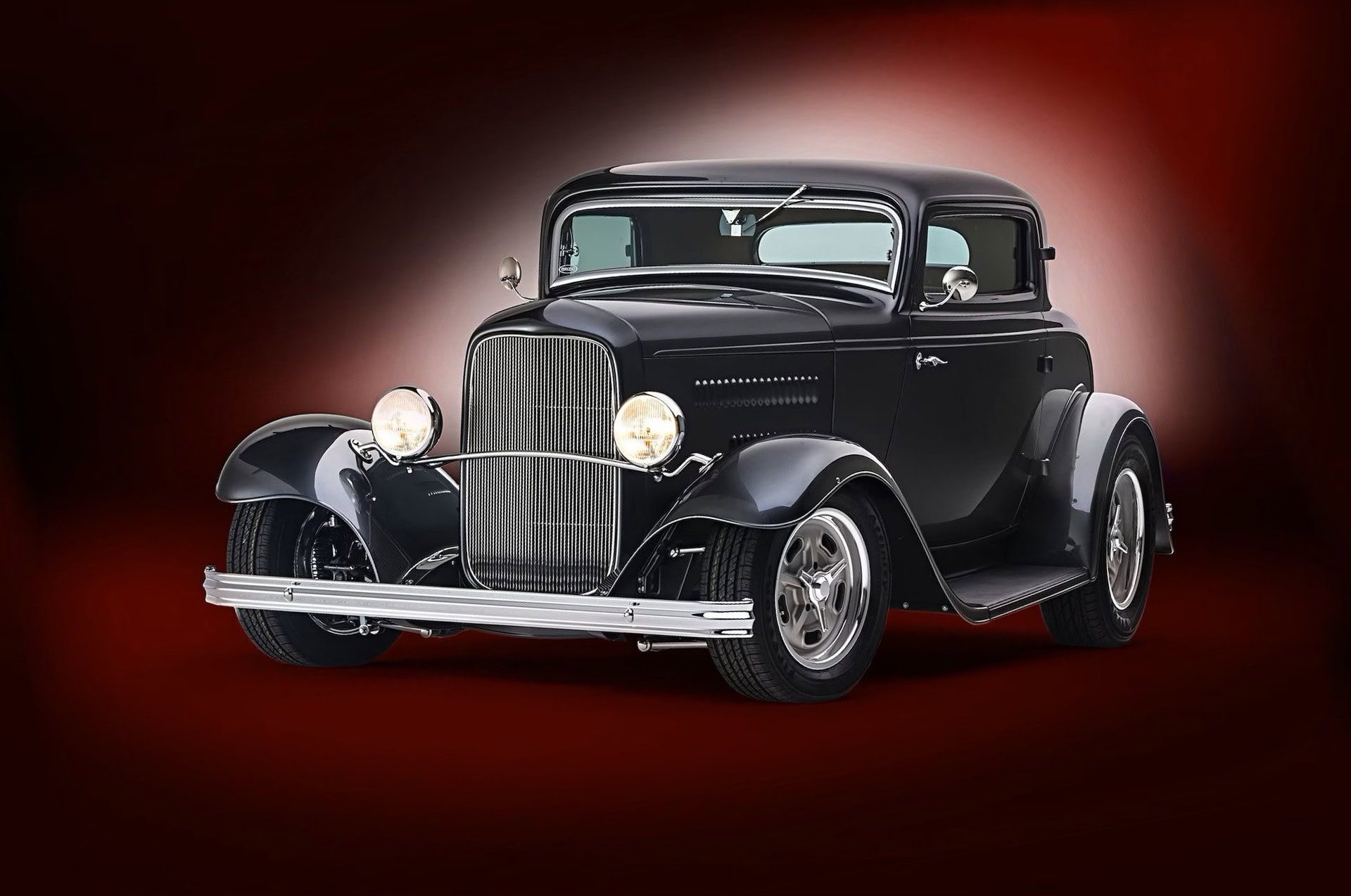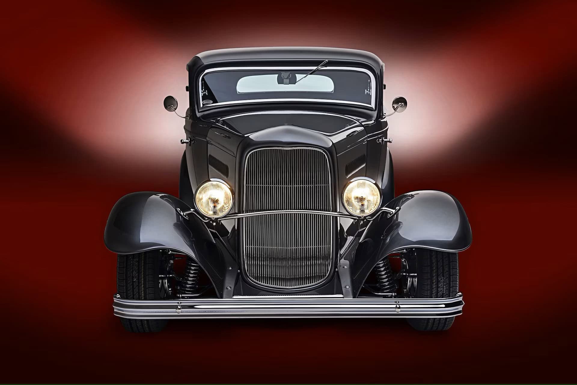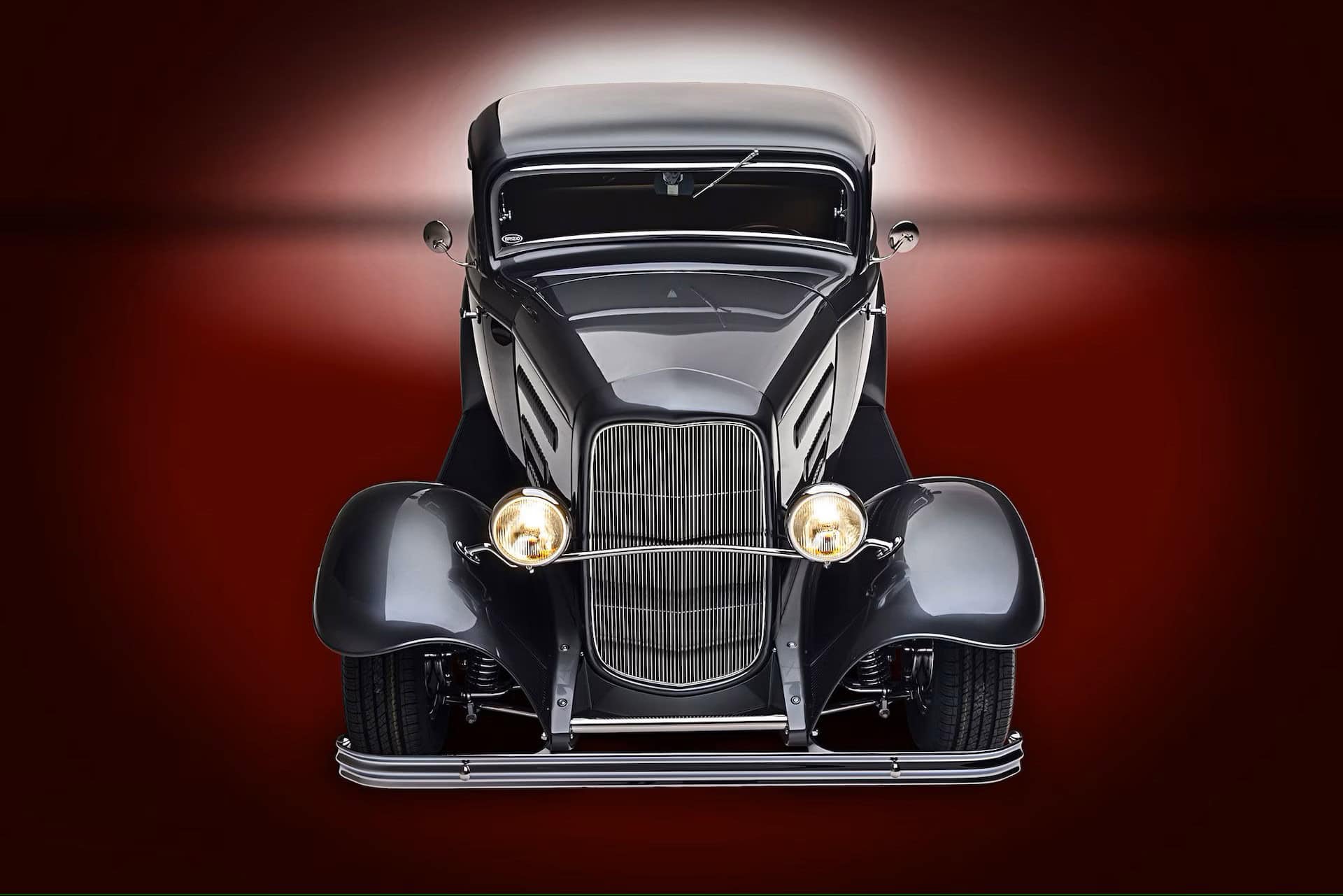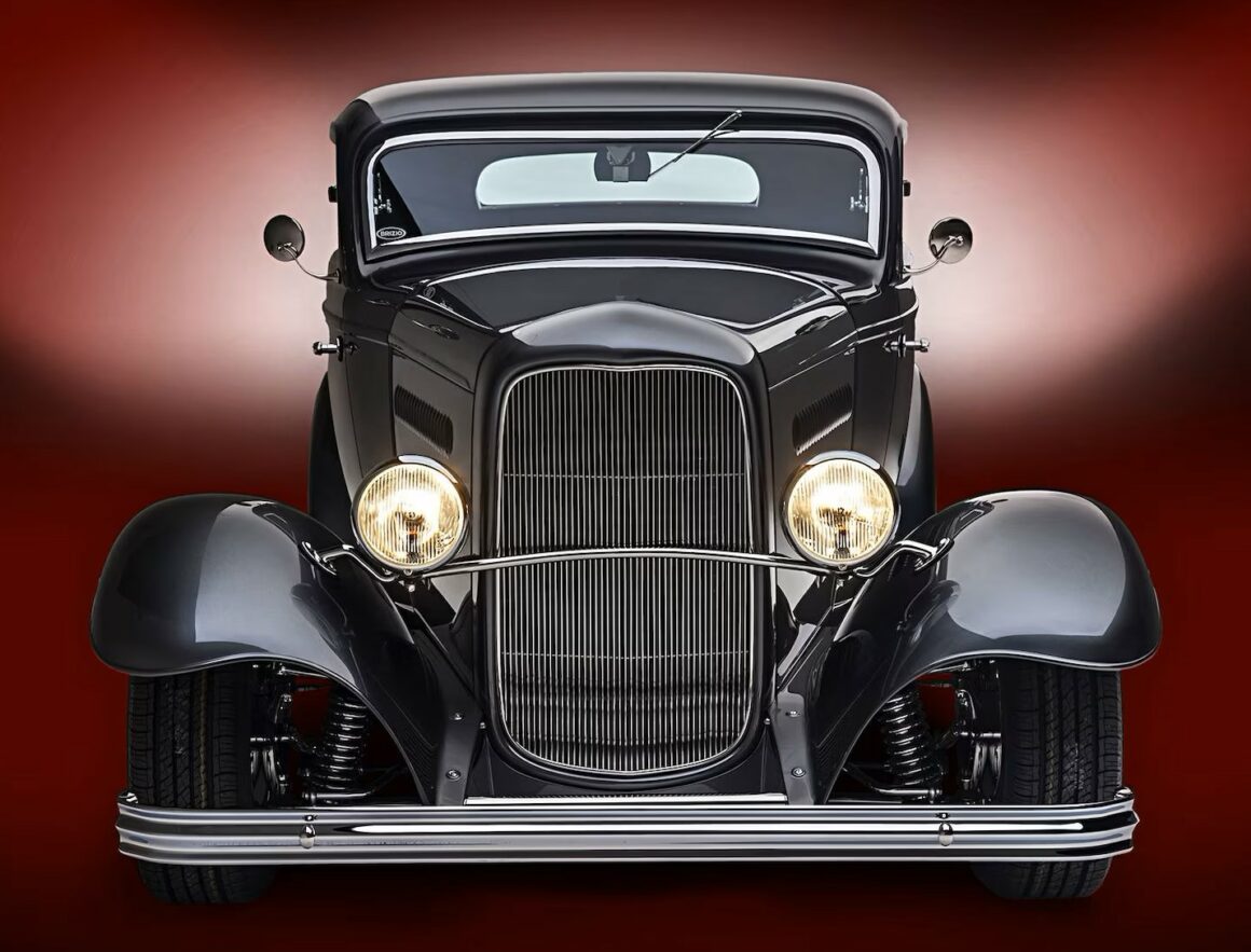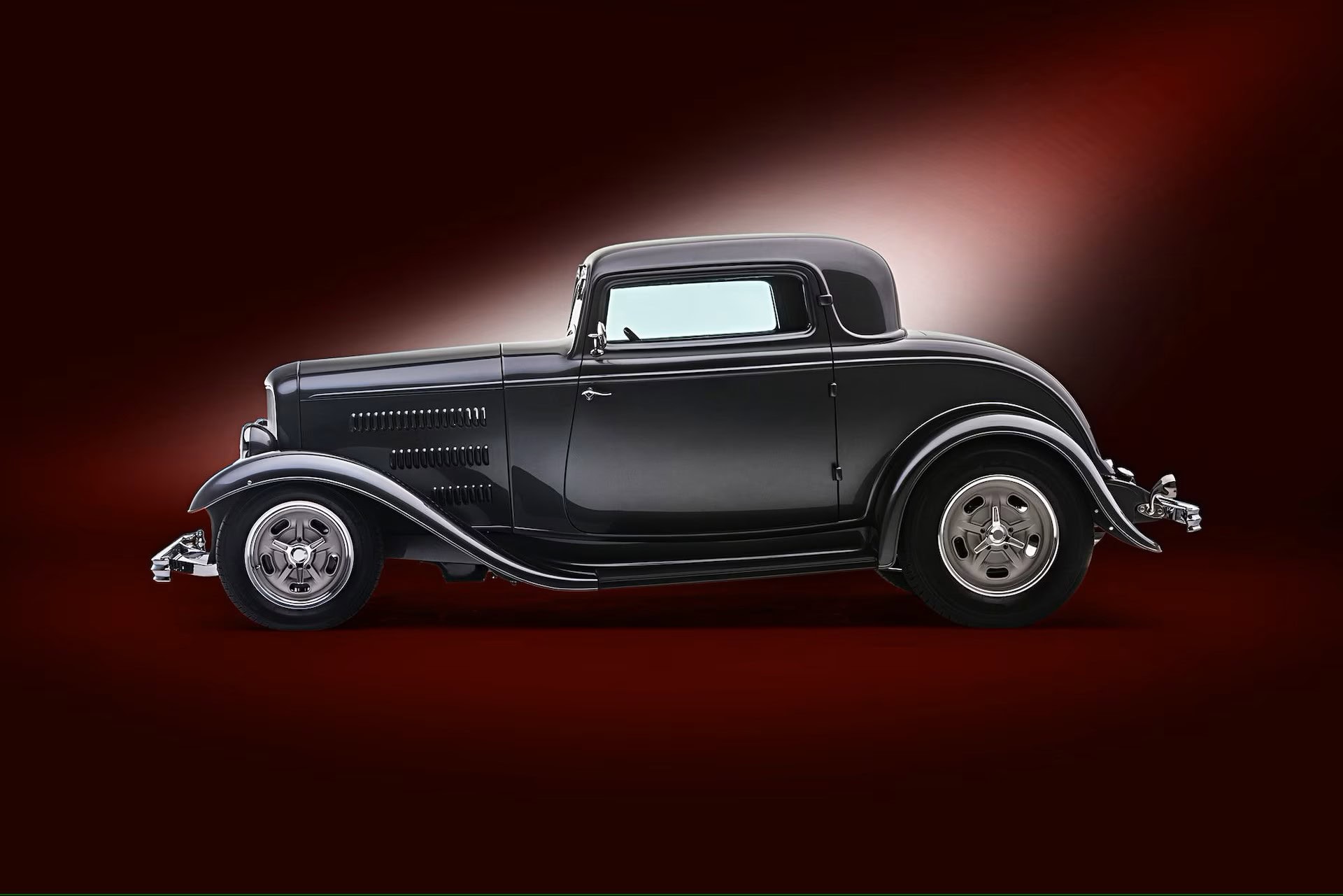 Pour les pneus et les jantes boulonnées à l’avant 15×6 E-T Sebring à lèvre polie avec un espace arrière de 3 pouces, sont chaussées de radiaux Firestone P195/65R15. Les galets arrière sont des jantes boulonnées 17×7 E-T Sebring avec un espace arrière de 3 pouces insérés dans une paire de gros radiaux Firestone P235/70/R17. La carrosserie à trois fenêtres en acier du coupé Deuce d’Eric Clapton est une Brookville avec une “côtelette” de 3 1/2 pouces tranchée par les artisans de Brizio : Jack Stratton et Andrik Albor. Après le Top-Chop supérieur, une feuille d’acier a été façonnée pour se conformer et soudée pour remplir le toit. Le capot en alu de Jack Hagemann est doté d’une coque de radiateur Brookville insérée dans une grille en inox Dan Fink.