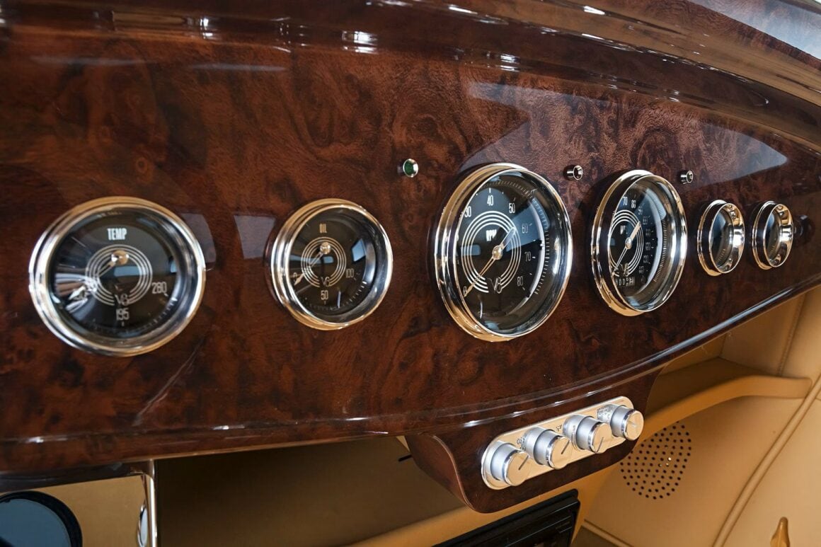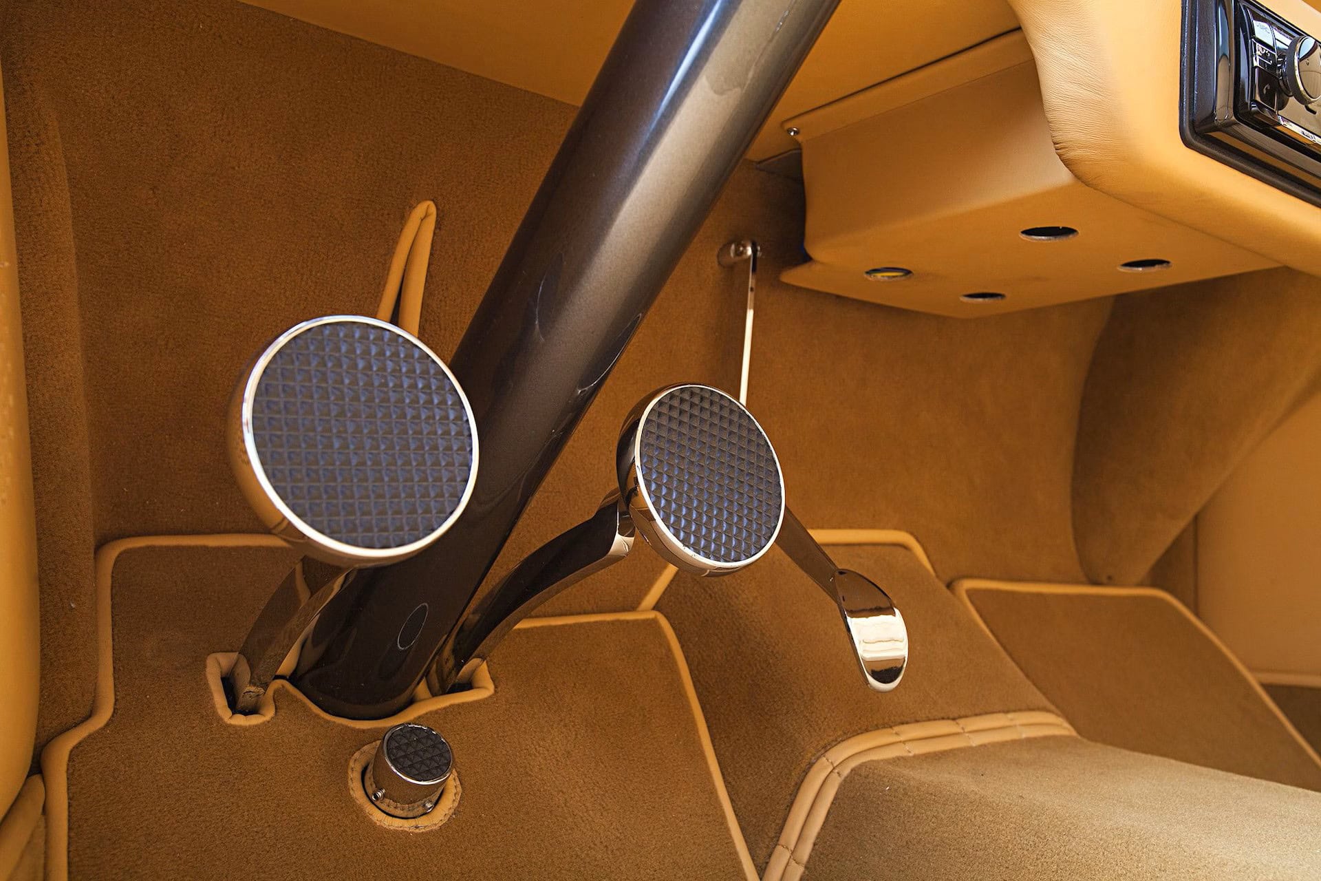 L’hydrographie en loupe de noyer sur le tableau de bord et les garnitures de fenêtre de Juliano’s ajoute la qualité distinctive des voitures de luxe anglaises. Situé à Santa Clara, en Californie, Sid Chavers a construit la banquette et tapissé le coupé à l’aide de peaux de cuir pleine fleur Ferrari Beige Tradizione provenant directement de Ferrari, grâce aux liens étroits d’Eric Clapton avec l’usine. La moquette reliée en Tradizione beige est en laine fine à poils coupés Wilton avec insonorisation Dynamat en dessous. Moal Hide-a-Vents dirige la climatisation glacée Vintage Air sans “disponsicabilité”…