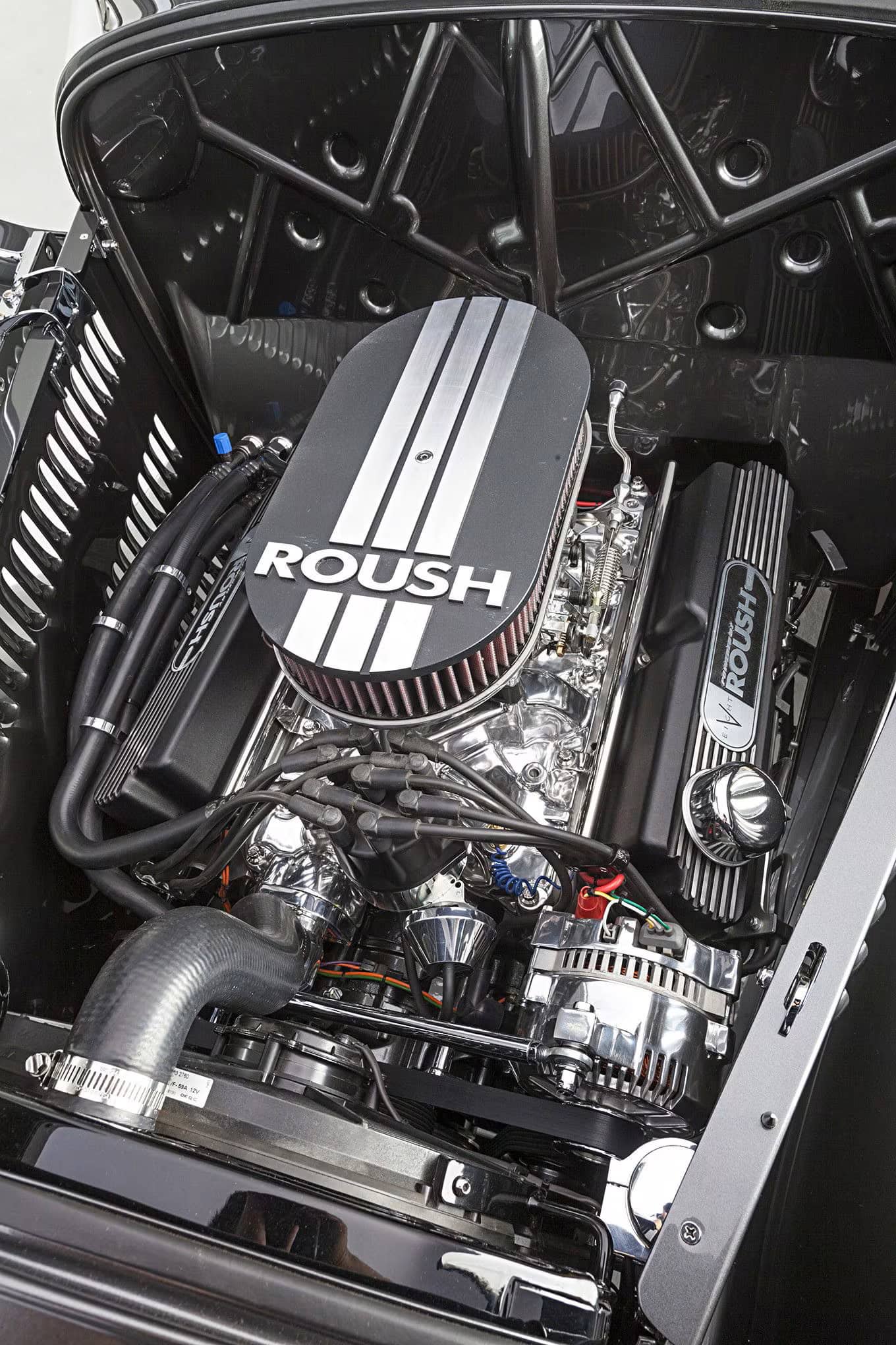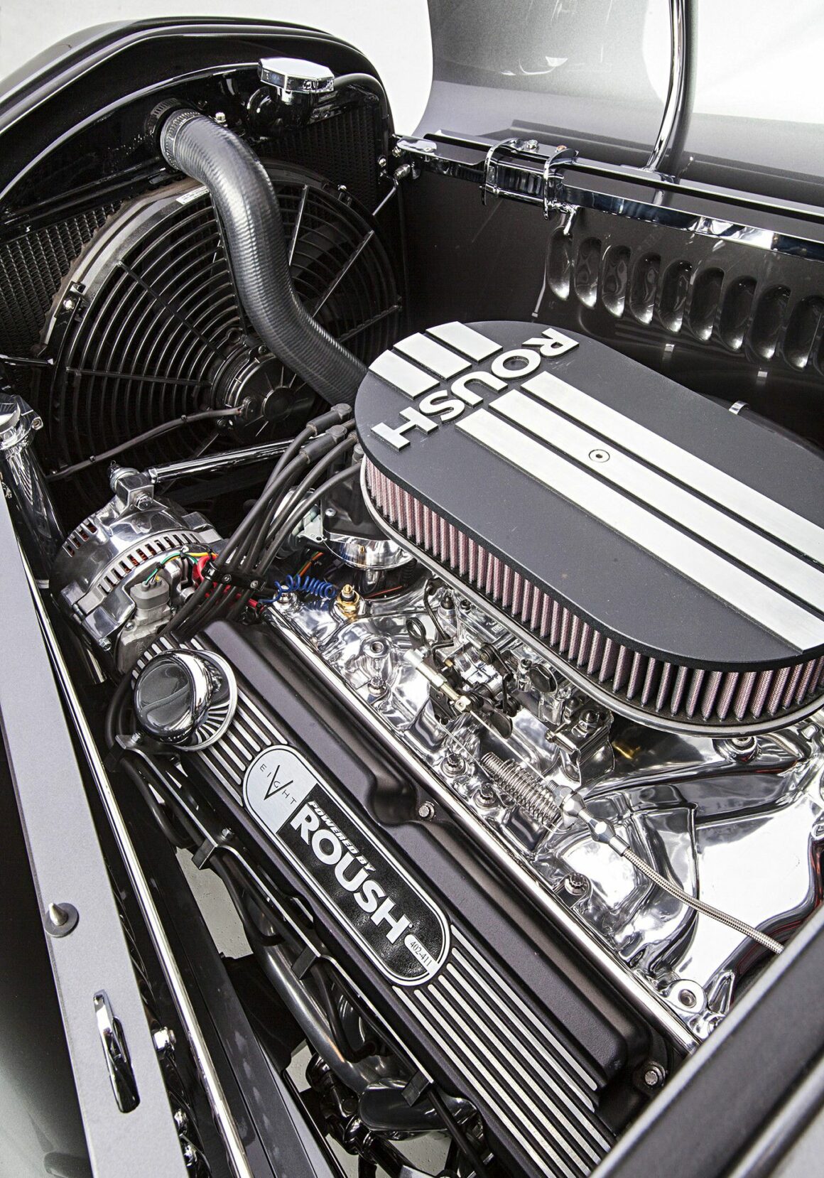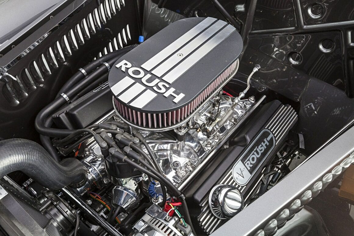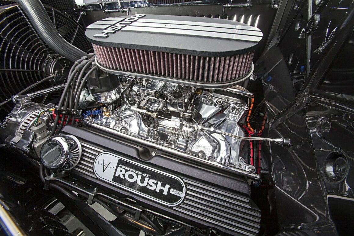 Les éléments extérieurs essentiels à la légalité de la route comprennent les phares et les rétroviseurs de SO-CAL, les feux de frein/arrière de Johnson’s Rod Shop et les pare-chocs de Bob Drake Reproductions de Grants Pass, Oregon. Tous les chromes de qualité spectacle du coupé ont été plaqués par Sherm’s Custom Plating à Sacramento, en Californie. Voilà, vous en connaissez maintenant autant que moi concernant la carrosserie… Je passe au moteur… La puissance nécessaire pour pousser le coupé à trois fenêtres provient d’un moteur Ford de 402ci construit par Roush Performance de Livonia, Michigan. Le V8 Ford est conçu comme un moilin performant disposant d’un carburateur Edelbrock de 650 cfm sur un collecteur d’admission Edelbrock-Roush.