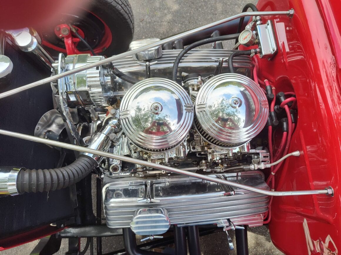 -Le 350ci V8 Chevrolet arbore un double système d’admission quadruple (gag ?) et des collecteurs d’échappement de style “lacs” (référence aux Hot Rods utilisés sur les lacs asséchés pour “faire de la vitesse”)