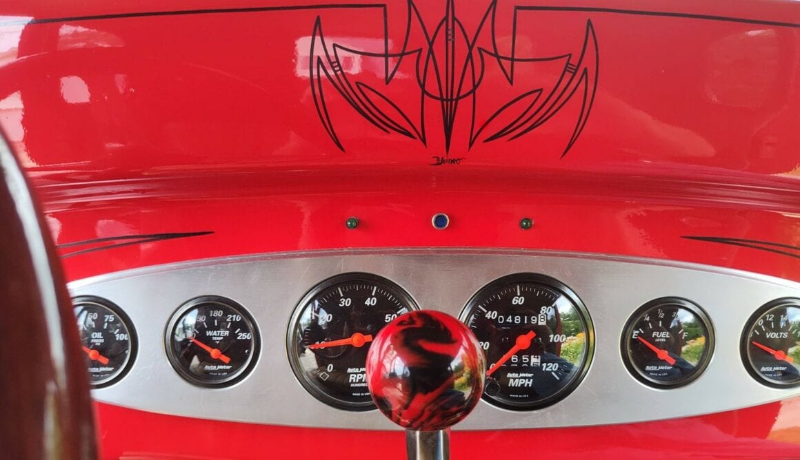-Le tableau de bord à fines rayures contient un ensemble de jauges AutoMeter. (Pareil, quand est ce qu’on mange ?)