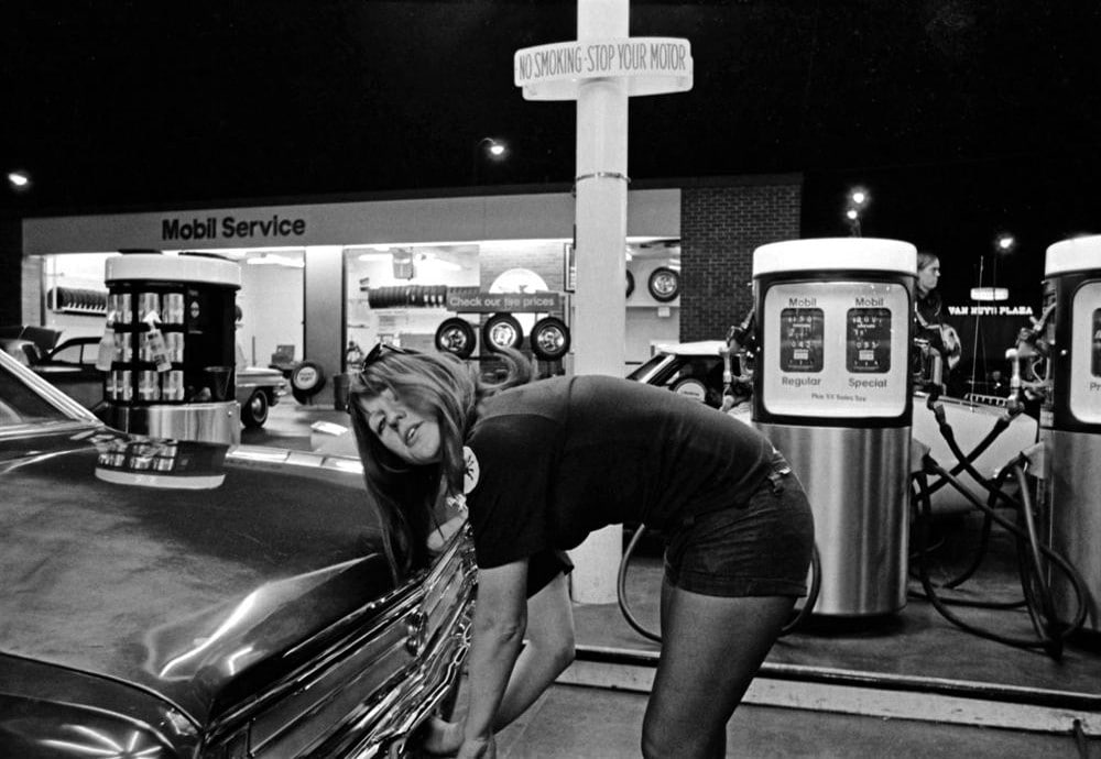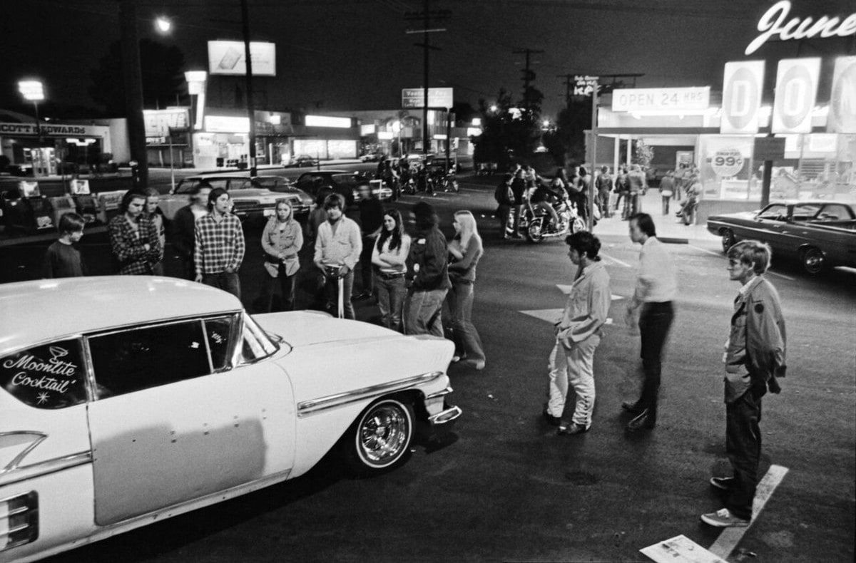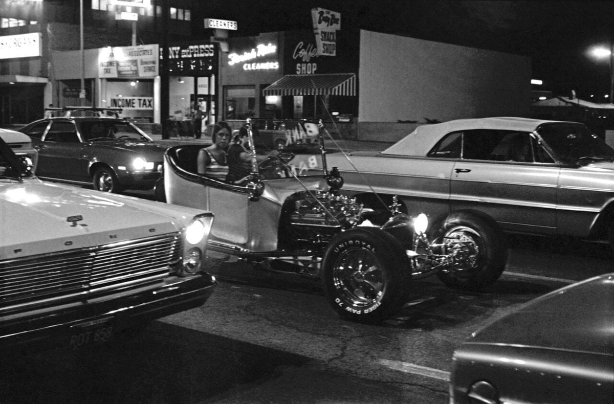 La plupart des gens sur le boulevard la nuit étaient là pour voir, être vus, flirter, baiser, tout était facile. En effet, les gens voulaient vraiment être en scène et être photographiés. Cela m’a permis de prendre mon temps ! En 1972, les Bagnoles d’avant-guerre étaient beaucoup moins courantes que les muscles-car’s et Hot-Rod’s des années ’60. Le boulevard était comme réservé aux Hot-Rod’s. Le parking du Hughes Market et celui du grand magasin Nahas ainsi qu’un centre commercial en forme de L avec un Baskin-Robbins à une extrémité et June Ellen’s Donuts à l’autre étaient des terrains utiles…