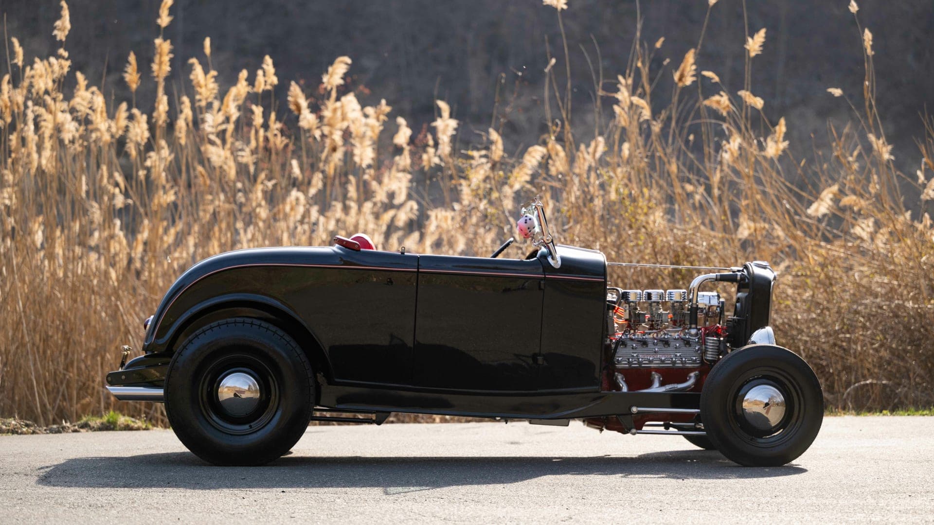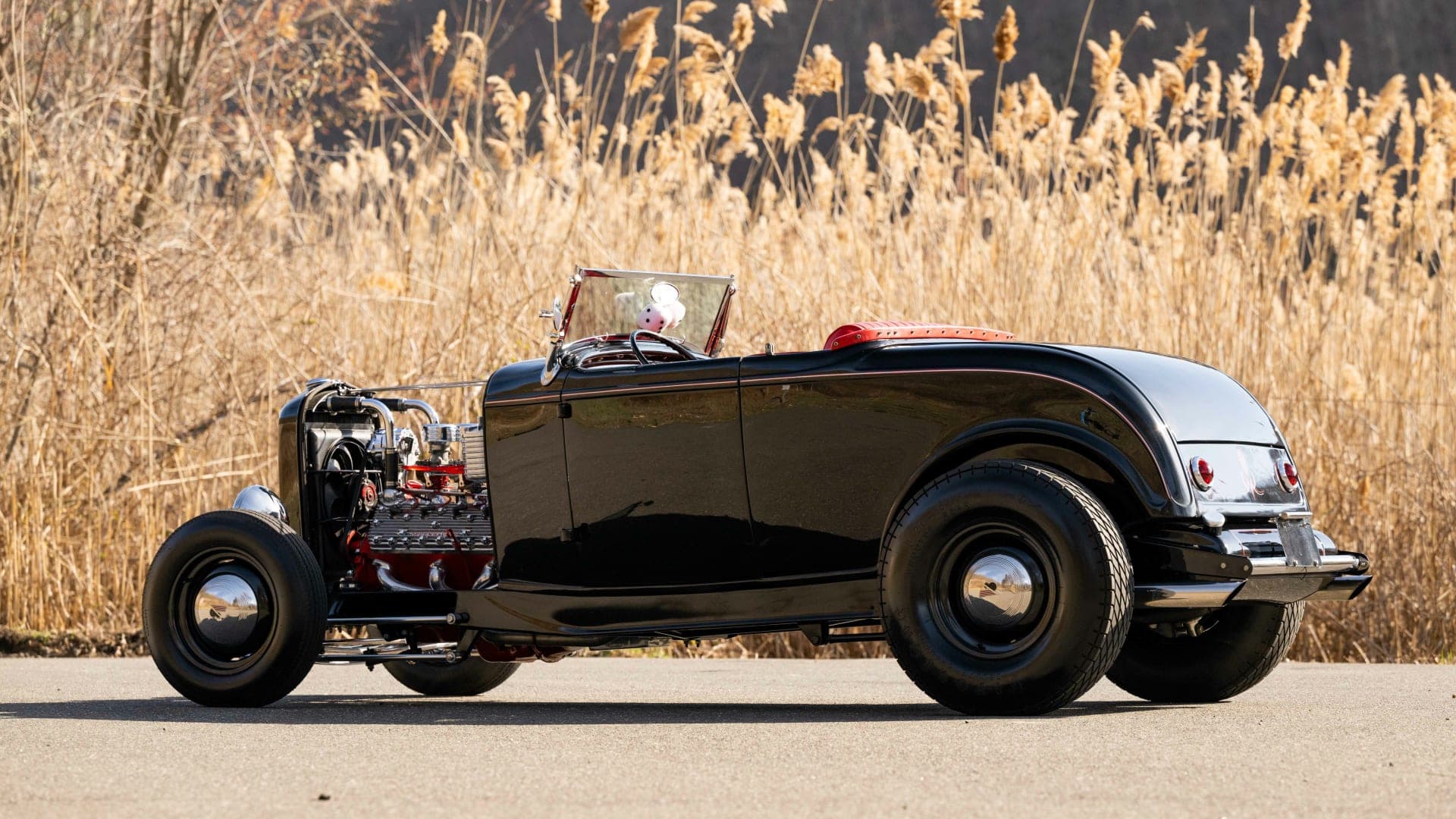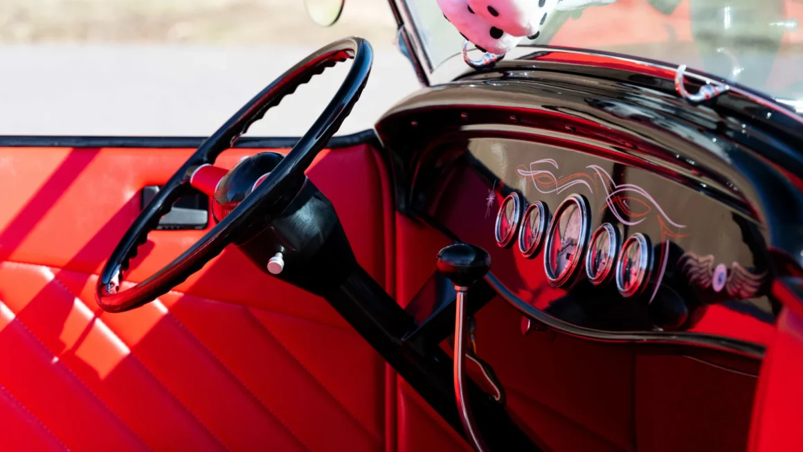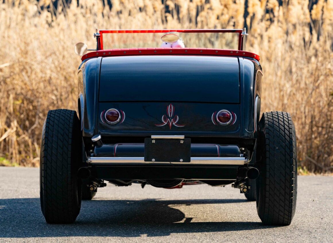 L’intérieur est rouge, y compris la zone du coffre avec un couvercle de batterie assorti. Il y a un aussi un volant bicolore à deux branches, des compteurs Stewart-Warner d’époque, un grand levier de vitesses noir et une sellerie richement tonique… Le look thématique de ce Hot-Rod est complété par des jantes en acier noir avec des petits enjoliveurs et des pneus Firestone. J’en ai terminé.