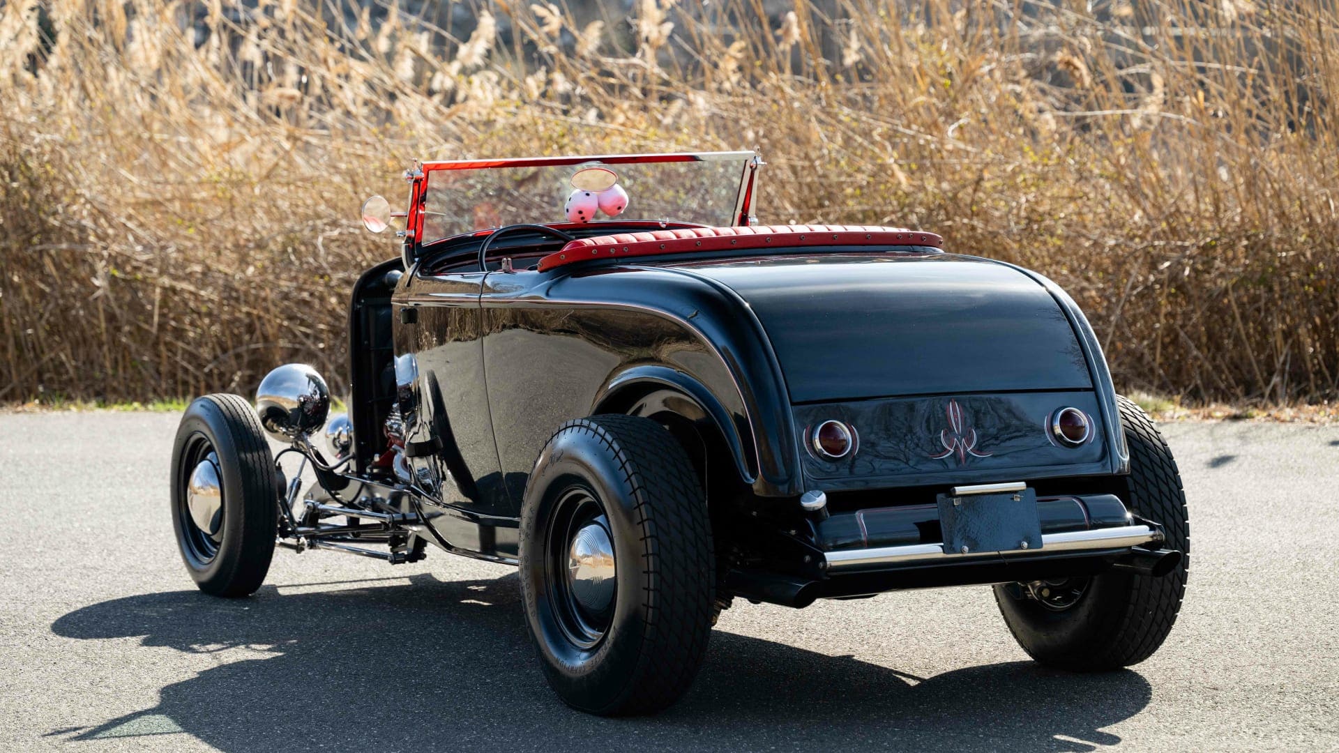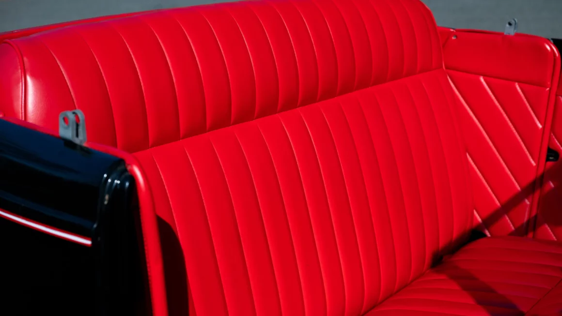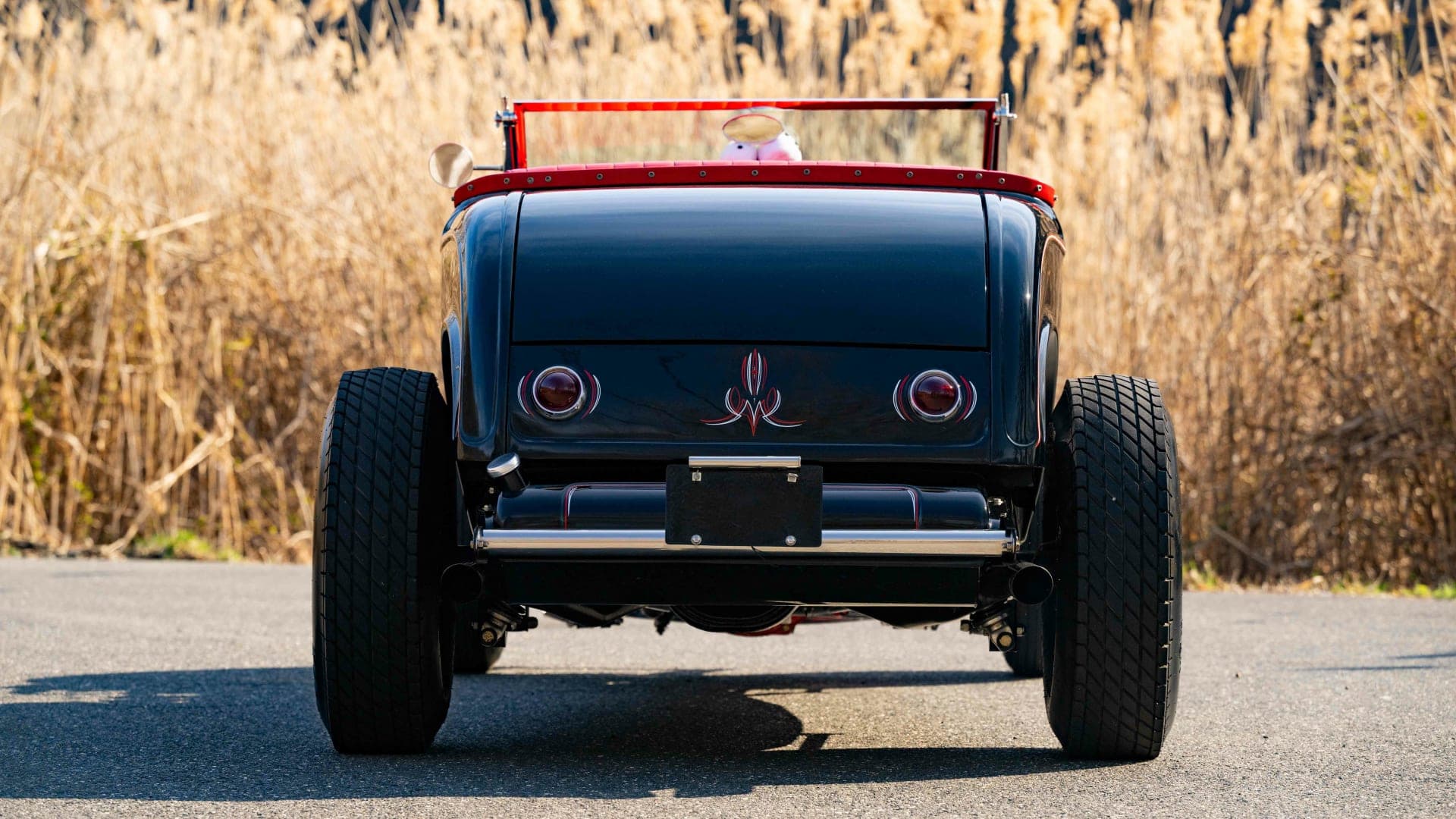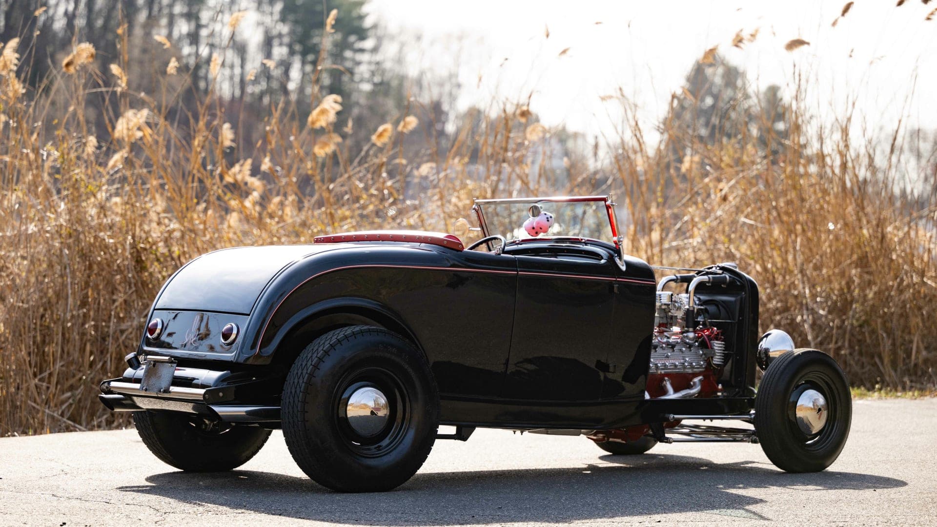 L’intérieur est rouge, y compris la zone du coffre avec un couvercle de batterie assorti. Il y a un aussi un volant bicolore à deux branches, des compteurs Stewart-Warner d’époque, un grand levier de vitesses noir et une sellerie richement tonique… Le look thématique de ce Hot-Rod est complété par des jantes en acier noir avec des petits enjoliveurs et des pneus Firestone. J’en ai terminé.