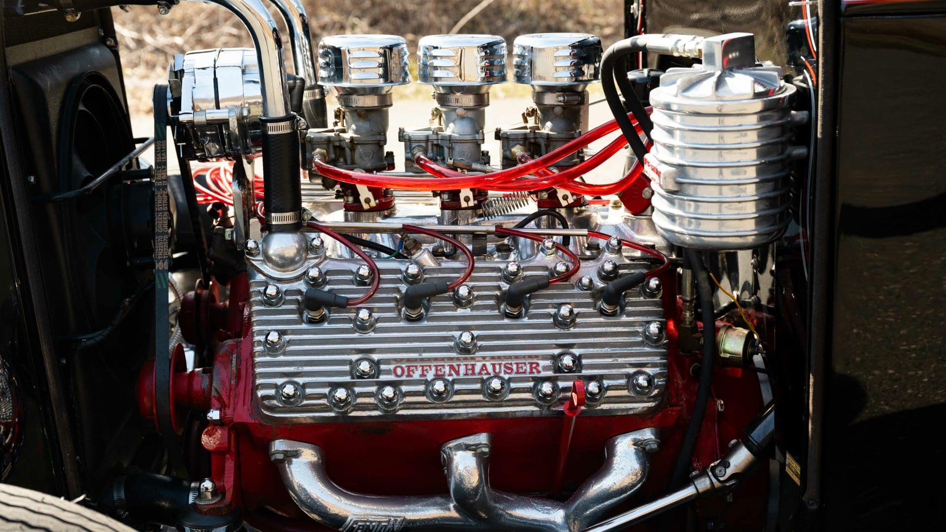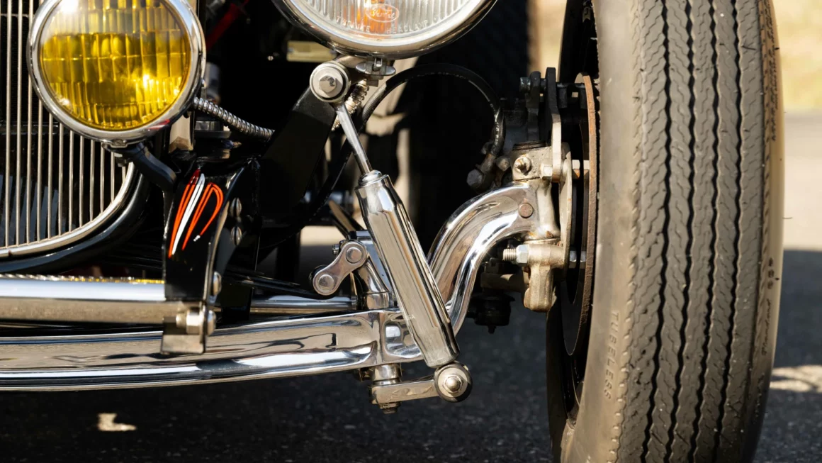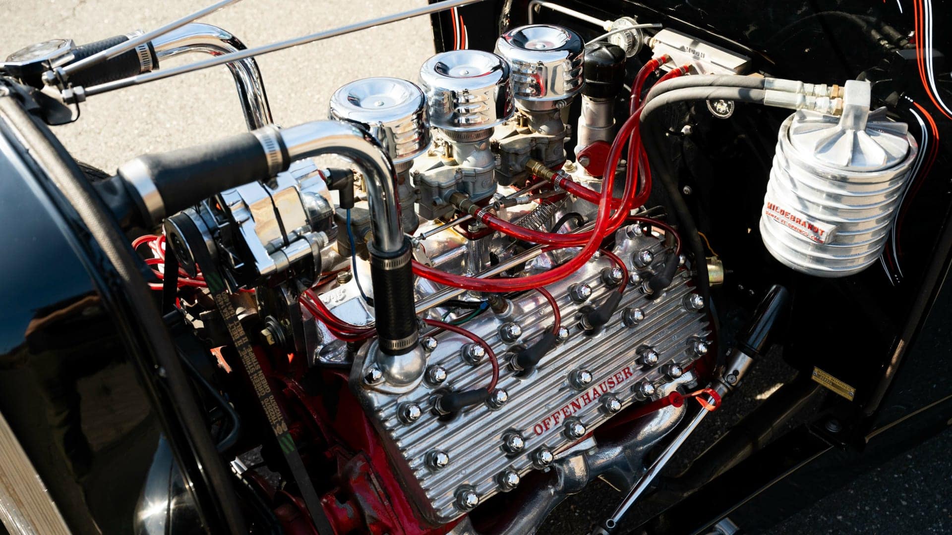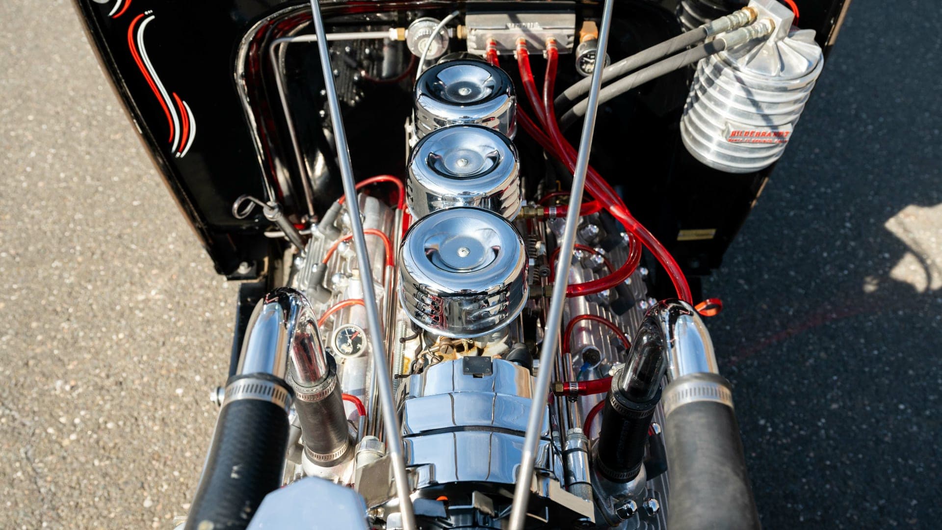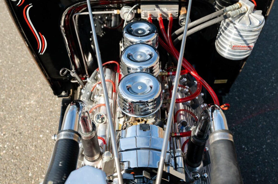 Cela commence par son collecteur d’admission Sharp, des carburateurs Stromberg’97, alimentés par une rampe de carburant Moon et finissant dans les culasses avec têtes en aluminium poli à ailettes Offenhauser. Un tube chromé se connecte au radiateur, il y aussi un filtre à huile en aluminium Hildebrandt et des collecteurs Fenton qui alimentent le double échappement. Les améliorations notées ici comprennent une conversion de 6 à 12 volts avec alternateur…