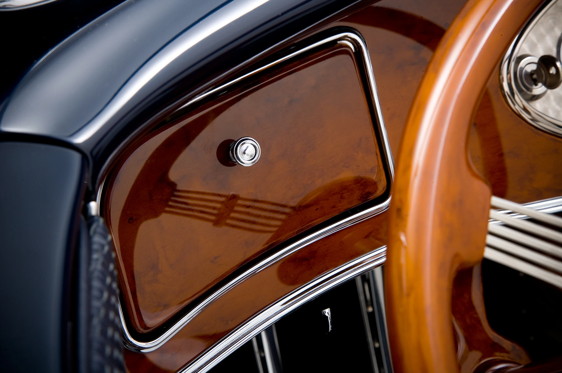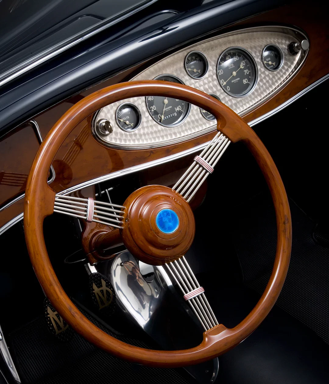 Les “manomètres” et compteurs qui se connectent à un maître-cylindre Kugel à 90 degrés sous le tableau de bord) complètent le tout, couronné par un volant à trois branches personnalisé conçu par Squeeg’s et fabriqué chez Karas Kustoms à Mesa, en Arizona, qui a également créé le panneau des compteurs, qui abritent les cinq jauges Classic Instrument qui ont été câblées dans le système à sept circuits Haywire installé chez Squeeg. Une fois la voiture terminée, elle a été préparée pour le Grand National Roadster Show à Pomona, en Californie, un spectacle où le père de Cole avait remporté le prix AMBR deux ans auparavant. Le Roadster a été accepté comme concurrent (un grand honneur en soi) mais il n’a pas remporté le grand prix. Il a cependant remporté le prix Steve’s Auto Restoration, l’AMBR Outstanding Paint et l’AMBR Outstanding Engine, avec un un peu de bling-bling.