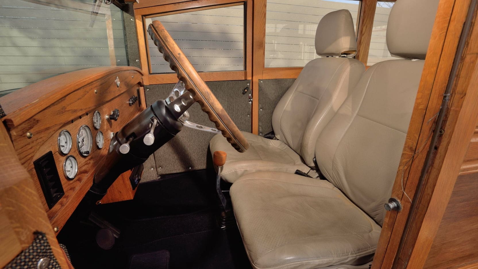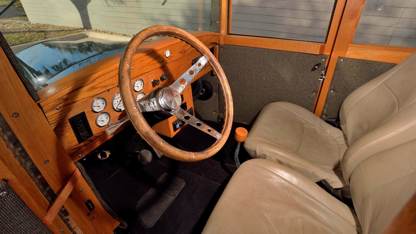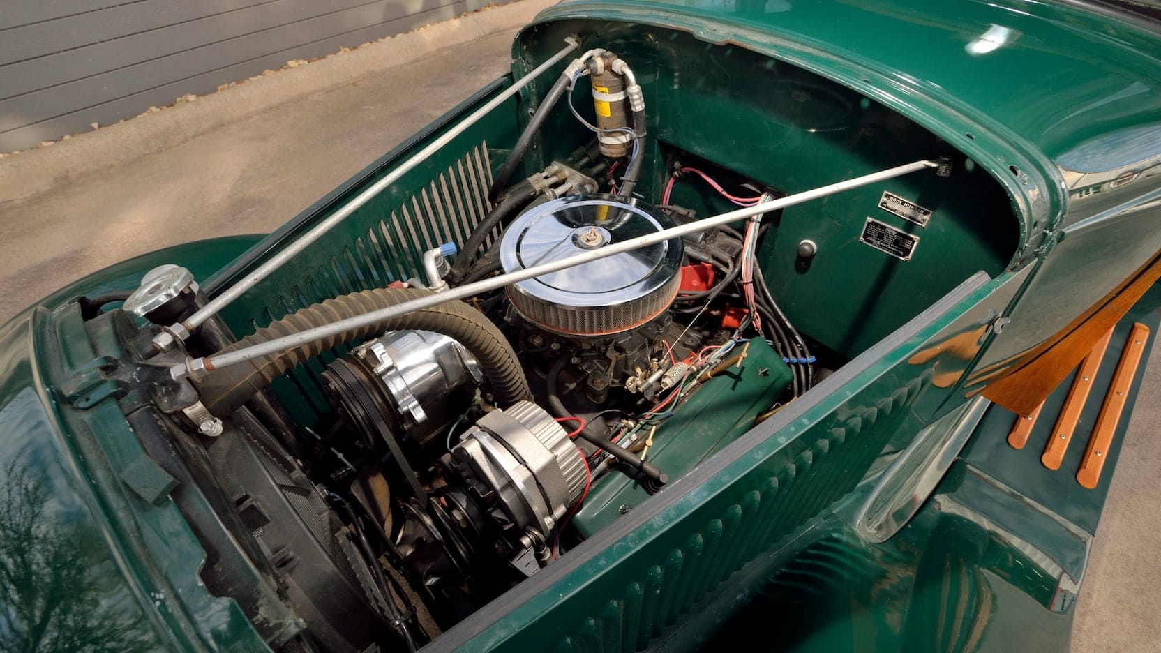 Le reste de la cabine est entièrement réalisé à la main avec un cadre en érable piqué et un insert en bouleau dans l’habitacle. Il est en excellent état, sans aucun signe de pourriture ou d’écaillage de finition. Entre les ailes AV se cache un moteur V8 GMPP étincelant de 350 ci. Celui-ci est surmonté d’un carburateur de 4 bbl, d’un collecteur d’admission en aluminium et d’un ensemble de filtre à air chromé. À l’arrière se trouve une boîte automatique TH350 à 3 vitesses et un essieu arrière Ford de 9 pouces.