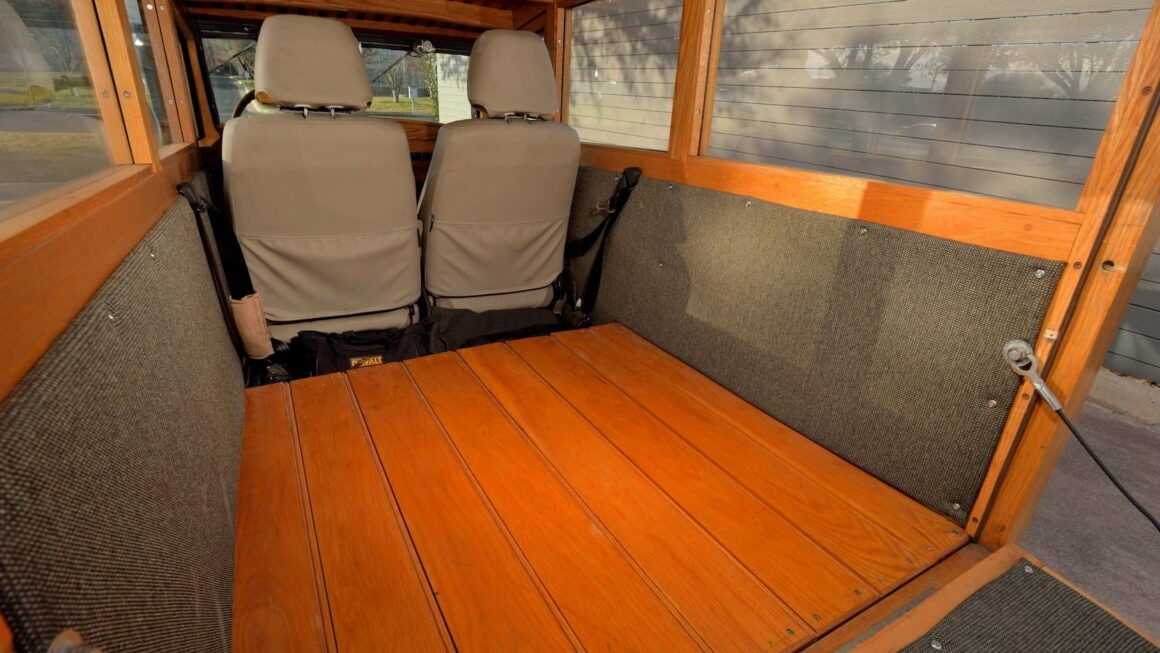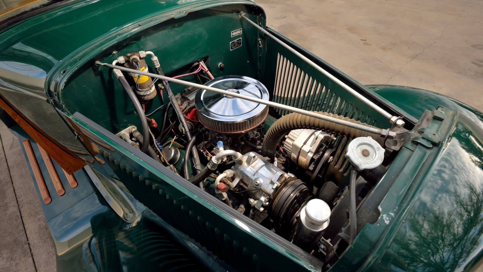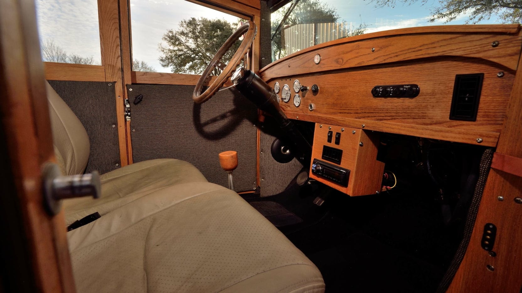 Le reste de la cabine est entièrement réalisé à la main avec un cadre en érable piqué et un insert en bouleau dans l’habitacle. Il est en excellent état, sans aucun signe de pourriture ou d’écaillage de finition. Entre les ailes AV se cache un moteur V8 GMPP étincelant de 350 ci. Celui-ci est surmonté d’un carburateur de 4 bbl, d’un collecteur d’admission en aluminium et d’un ensemble de filtre à air chromé. À l’arrière se trouve une boîte automatique TH350 à 3 vitesses et un essieu arrière Ford de 9 pouces.
