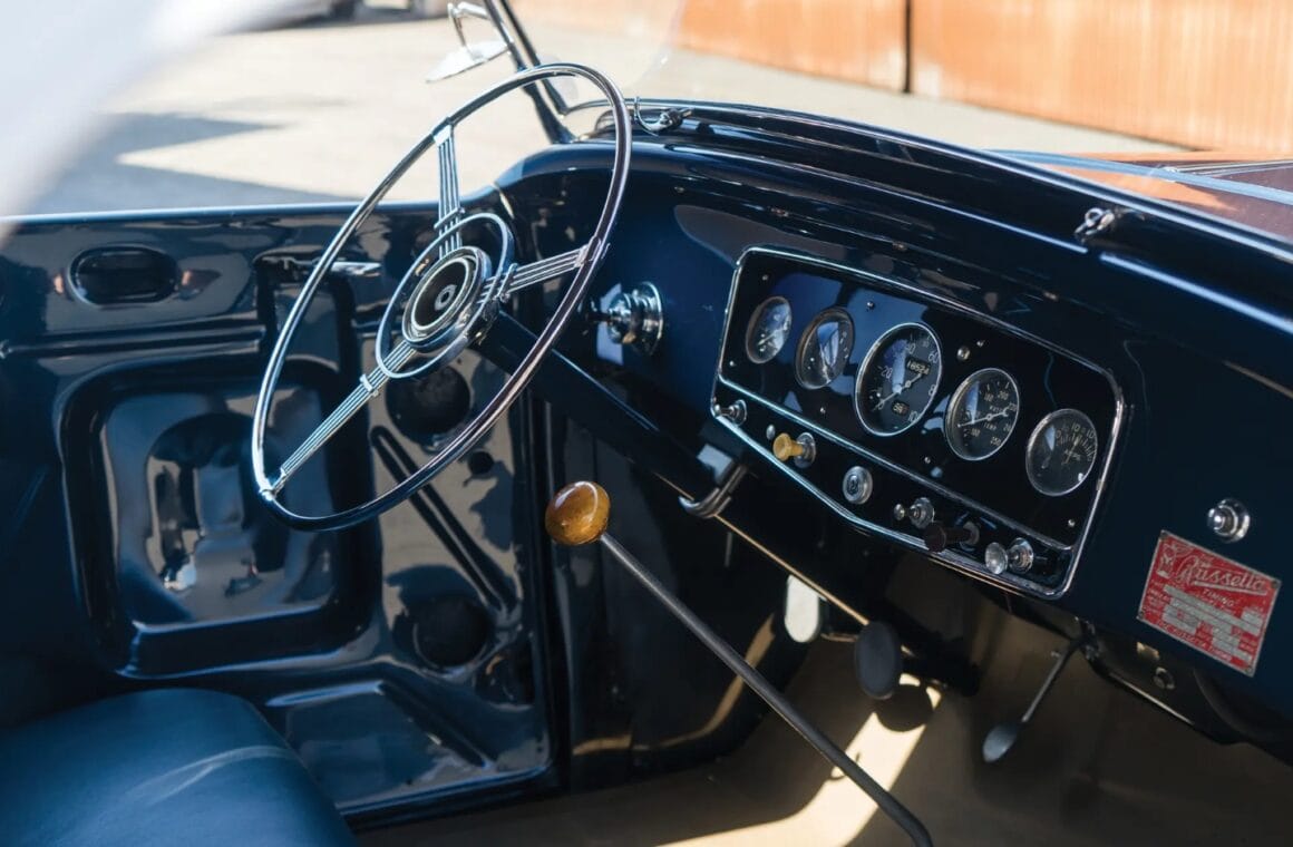 De même que les roues à rayons Ford d’origine… Sur le tableau de bord, une étiquette de chronométrage de la “Russetta Timing Association” atteste d’une vitesse en course de 120,9 mph à Harper Dry Lake en 1944… Pete Henderson a été stupide de vendre ce Rod en 1946 à L. K. Chappelow de Monrovia, en Californie, qui l’a possédée pendant un an avant de la vendre à Manny Ayulo qui la pilotera sur de nombreux circuits de la région de Los Angeles.